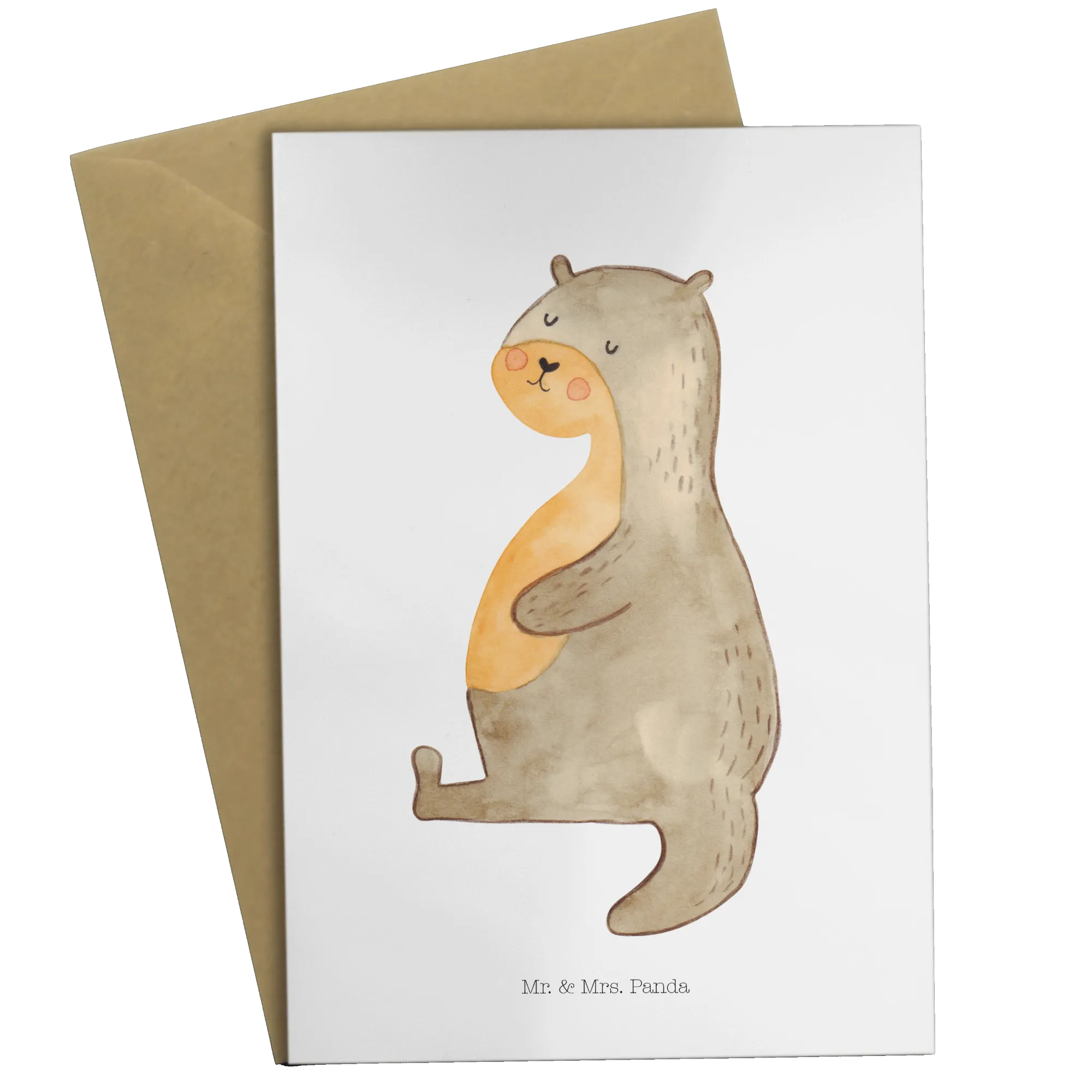 Introducing the perfect greeting card for all otter lovers out there – the "Otter Belly" card from the delightful Mr. & Mrs. Panda collection! This lovely card showcases an adorable hand-drawn design by Mrs. Panda, featuring a cute otter with a big belly relaxing happily. It's the perfect way to spread joy and express your love for aquatic animals, especially if you're gifting it to someone special who shares your passion for these charming creatures!