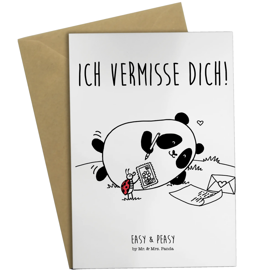 Imagine a cozy scene where a delightful panda is nestled in the grass, deeply focused on crafting a heartfelt love letter. The soft hues of the meadow surround this charming moment, as a cheerful ladybug flutters nearby, offering a stamp to the panda. This adorable motif expresses the saying, "Ich vermisse dich!" reminding us that distance can't diminish the feelings we hold inside. Instead, the space apart only heightens our appreciation for those we love. So let this playful illustration inspire you to reach out, pen down your thoughts, and share your love—because every heartfelt message strengthens the bond of love.