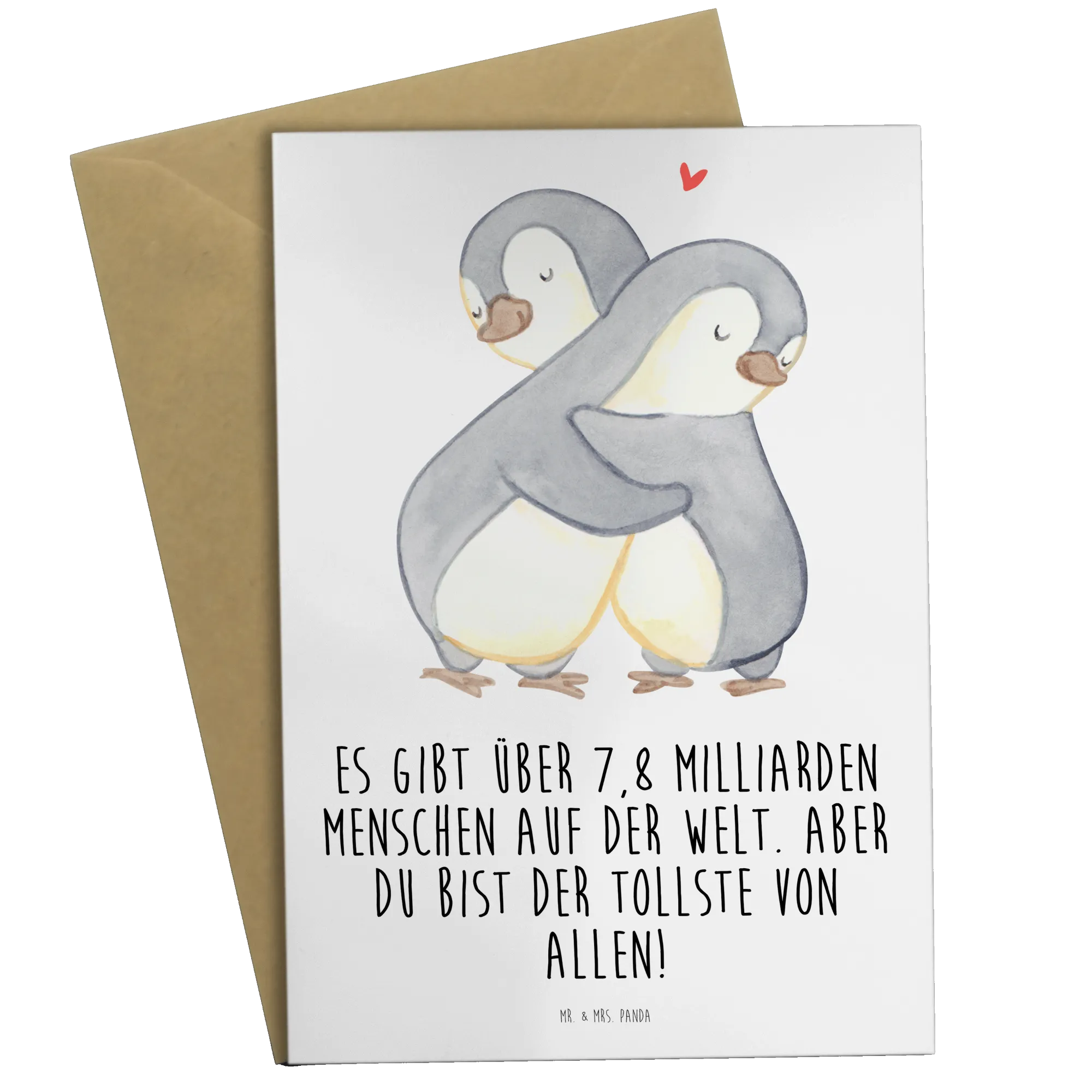 Let love bloom with our adorable motif of cuddling penguins, where warmth and affection come together in a perfect embrace. These loving creatures are captured in a moment of joy, with one penguin snuggling closely and wrapping its wing around the other, making it a heartwarming scene surrounded by a floating red heart. This enchanting design speaks volumes about the beauty of connection, embodying the message: 'There are over 7.8 billion people in the world. But you're the greatest of them all!' A treasured gift for your loved one on Valentine's Day or a thoughtful anniversary present, this motif celebrates the singularity of affection that two hearts share.