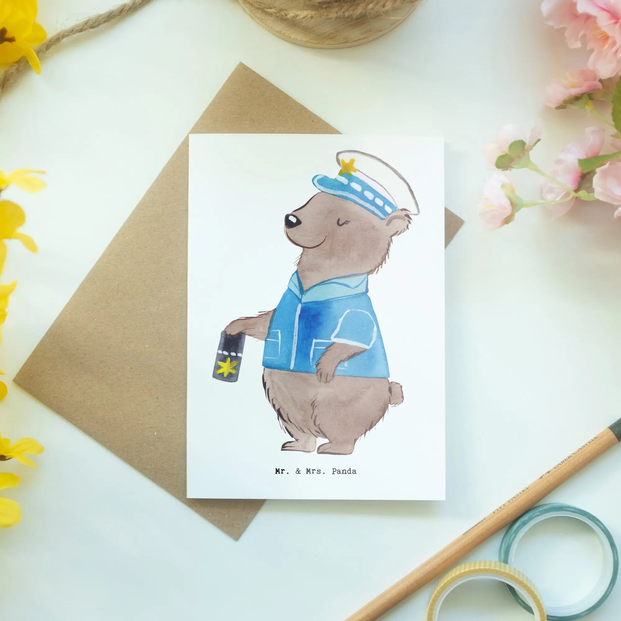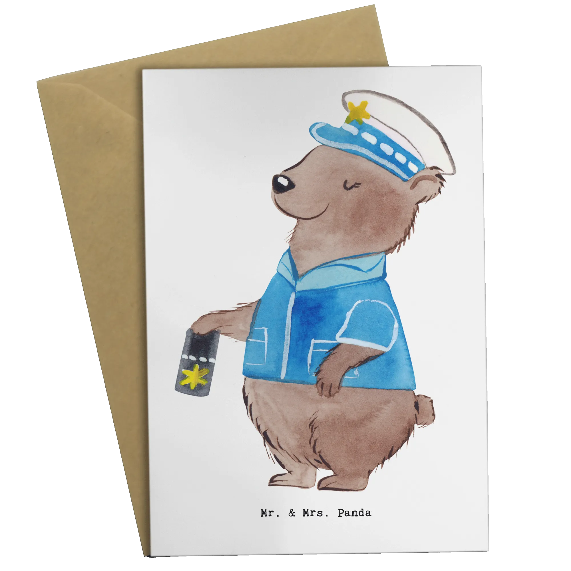 Discover the perfect way to celebrate the wonderful police officers in your life with this charming greeting card from Mr. & Mrs. Panda! Specially designed with a delightful police officer motif, this card is a thoughtful gift for a range of occasions including job starts, promotions, retirements, anniversaries, or even as a funny note to lift someone’s spirits. The adorable design features a proud bear donned in a police uniform, showcasing their badge, making it a heartwarming surprise that is sure to bring a smile to any police professional.