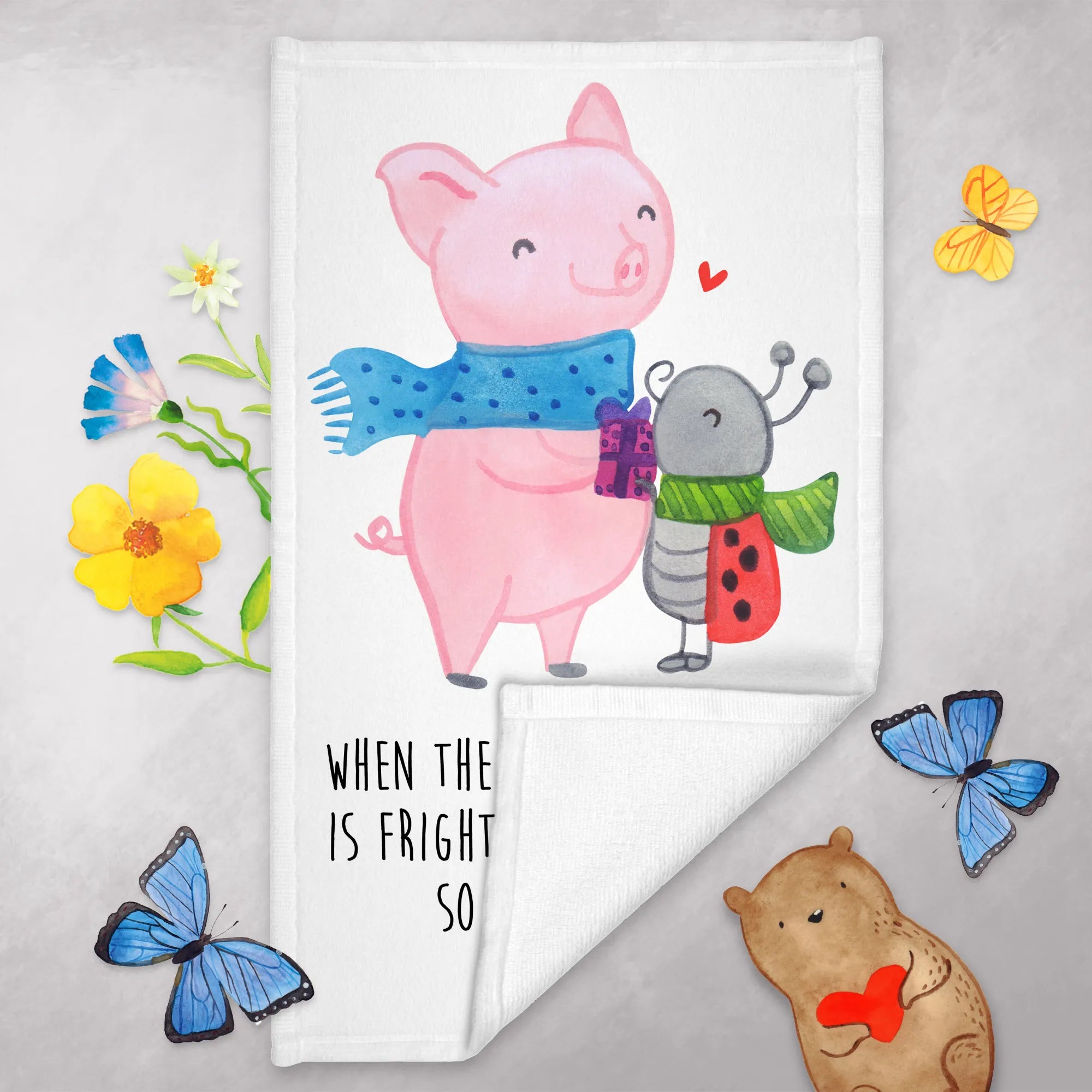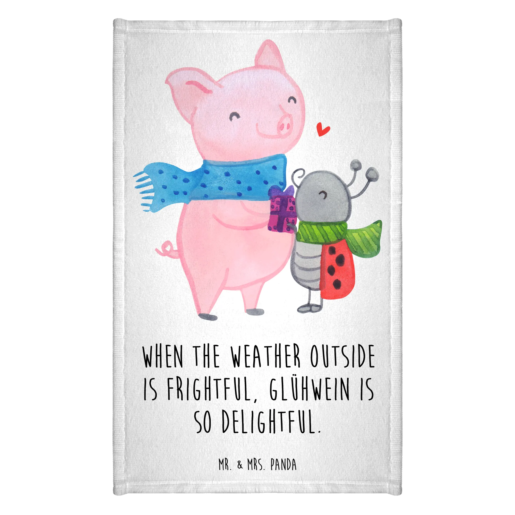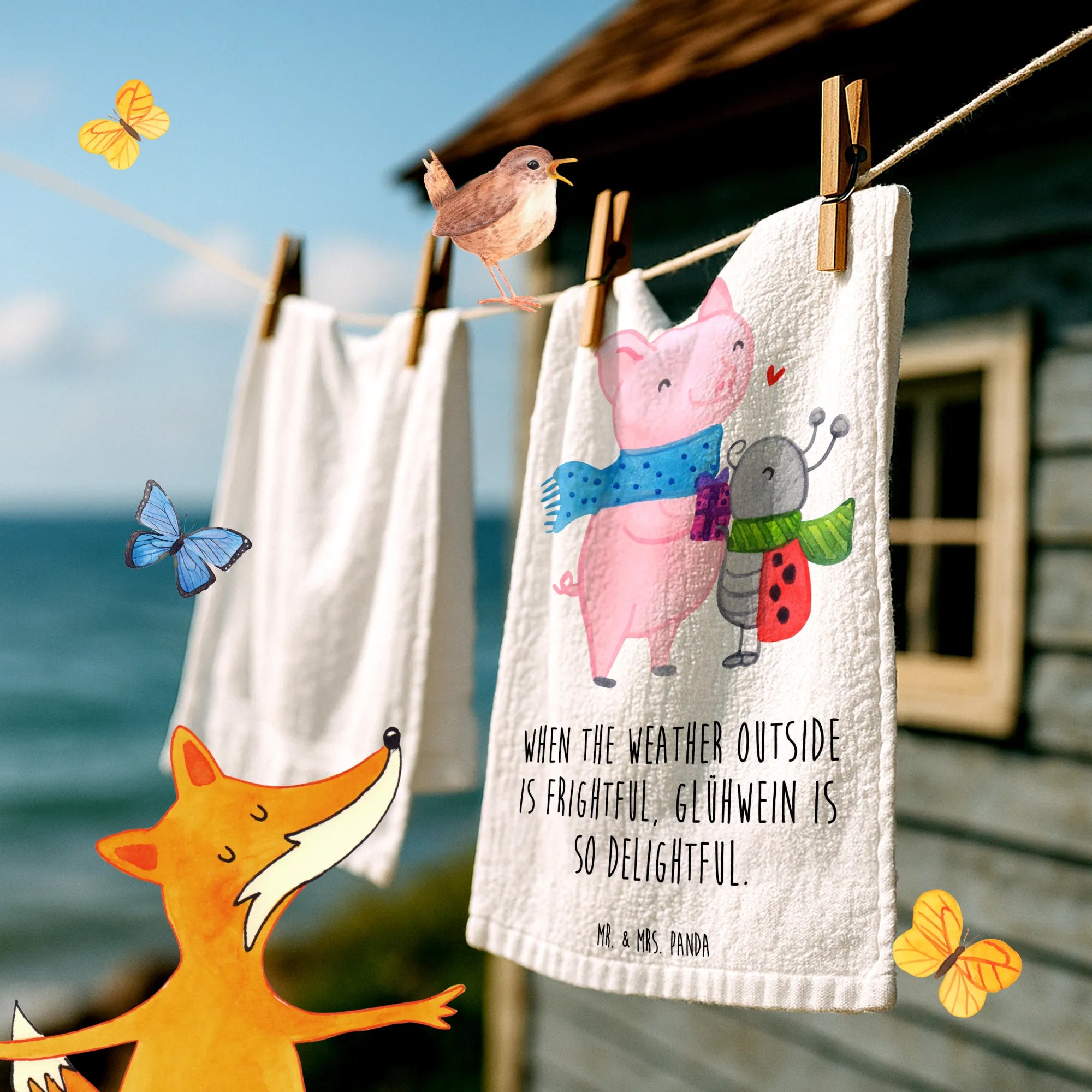 Entdecke das zauberhafte Gästehandtuch mit dem besonderen Motiv des Glühschweins Smörle aus unserer Winter Kollektion! Dieses wundervolle Handtuch vereint nicht nur Funktionalität mit einem überaus kreativen, handgezeichneten Design, sondern ist auch ein perfektes Geschenk für die kalte Jahreszeit. Das süße, rosa Glühschwein, gekleidet mit einem blauen Punkteschal, lächelt dir entgegen, während der fröhliche Marienkäfer Smörle mit seinem gestreiften, grünen Schal ein Geschenk überbringt. Die Illustration strahlt Wärme und Freundschaft aus, perfekt, um die Feiertage zu feiern und jedes Badezimmer aufzuhellen.