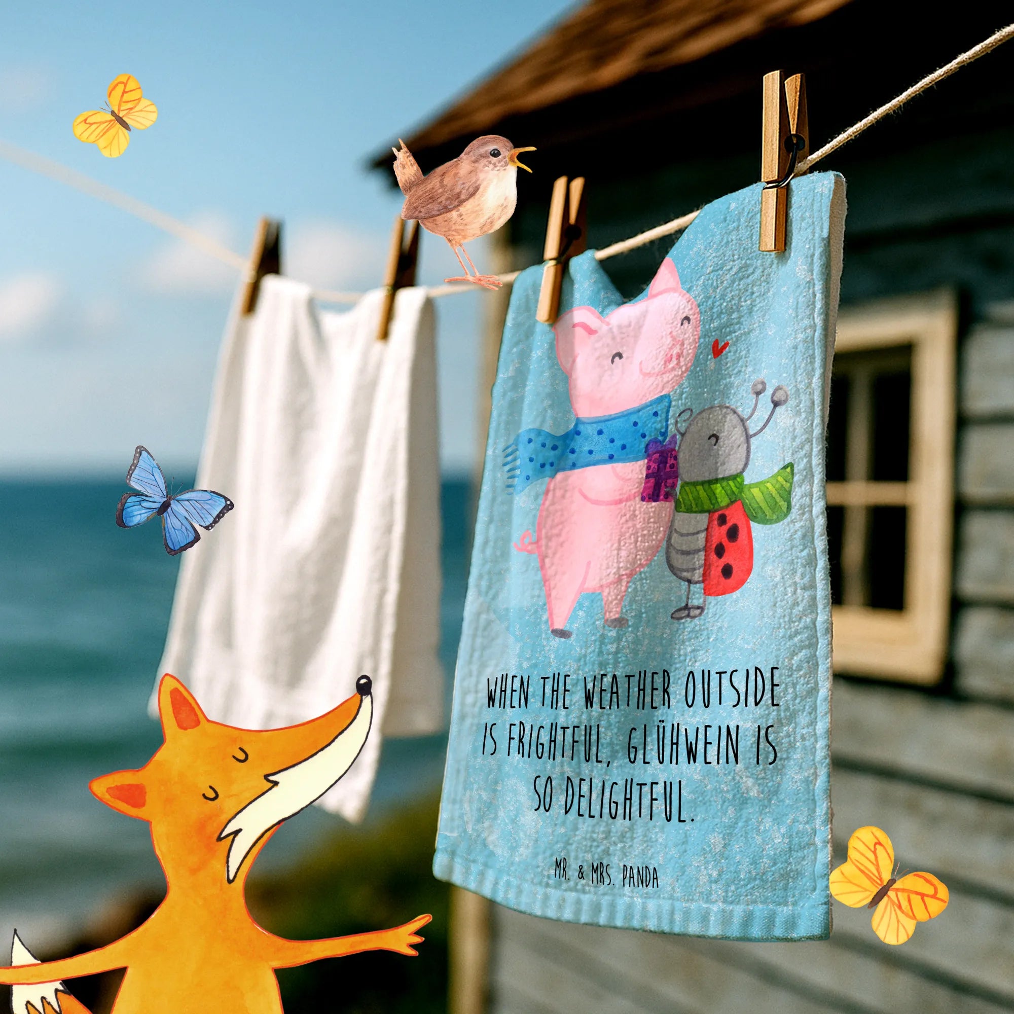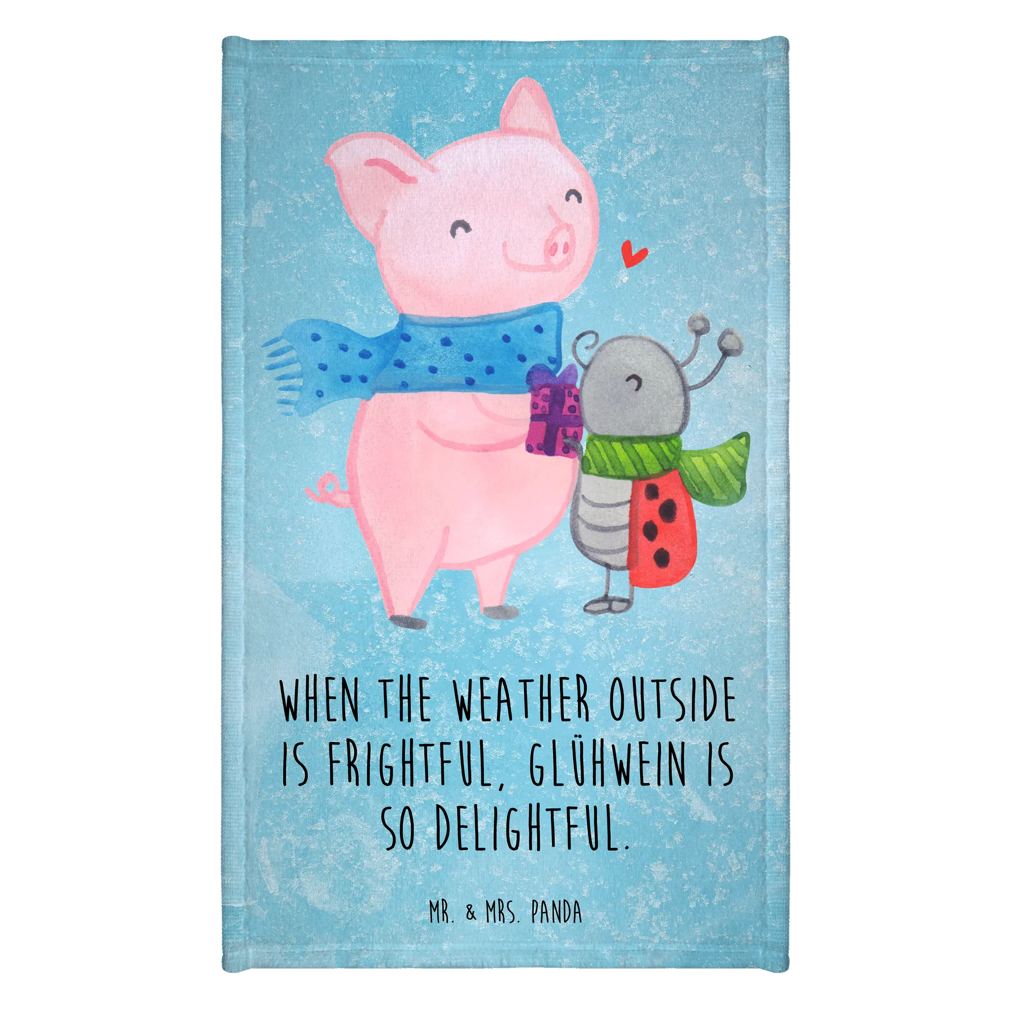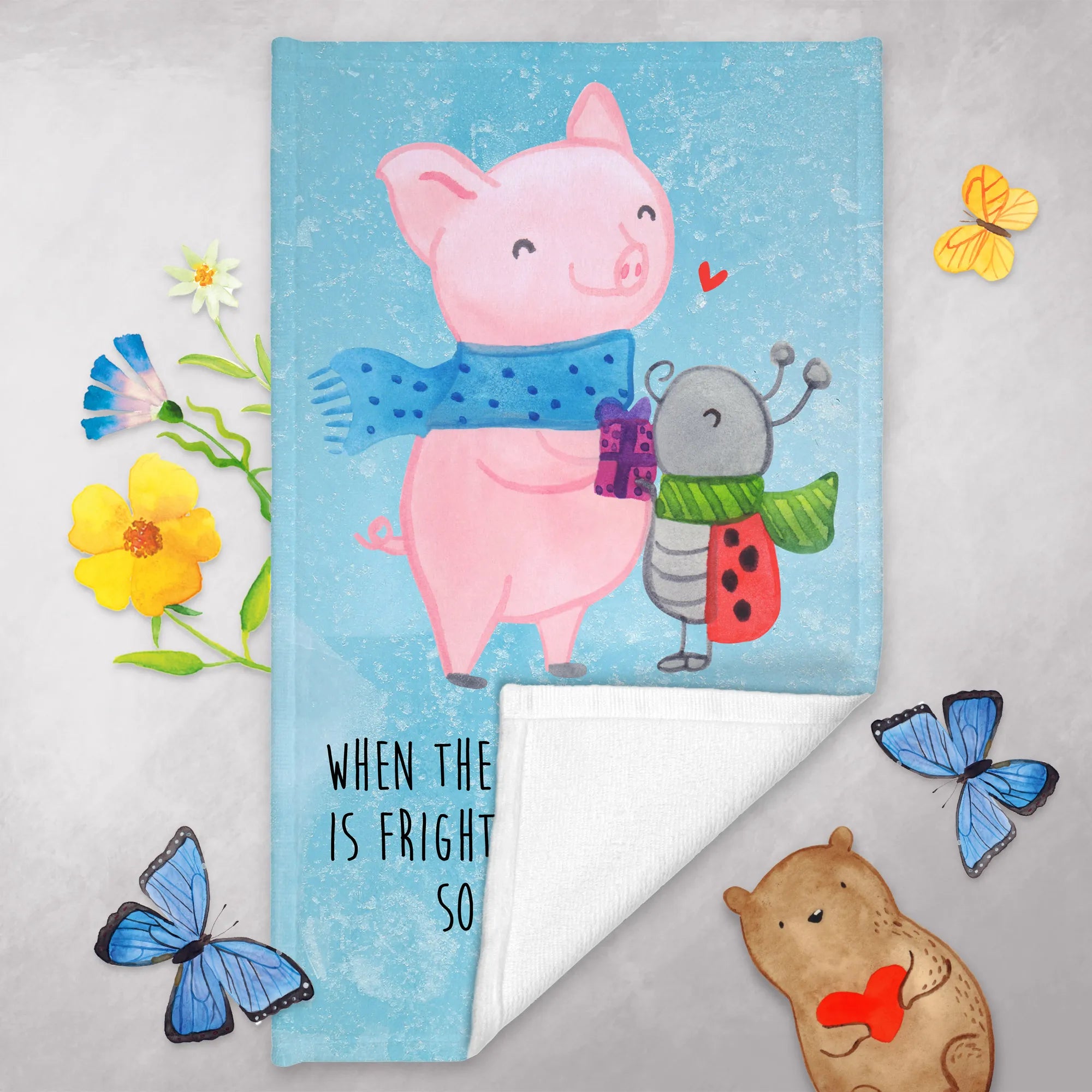 Entdecke das zauberhafte Gästehandtuch mit dem besonderen Motiv des Glühschweins Smörle aus unserer Winter Kollektion! Dieses wundervolle Handtuch vereint nicht nur Funktionalität mit einem überaus kreativen, handgezeichneten Design, sondern ist auch ein perfektes Geschenk für die kalte Jahreszeit. Das süße, rosa Glühschwein, gekleidet mit einem blauen Punkteschal, lächelt dir entgegen, während der fröhliche Marienkäfer Smörle mit seinem gestreiften, grünen Schal ein Geschenk überbringt. Die Illustration strahlt Wärme und Freundschaft aus, perfekt, um die Feiertage zu feiern und jedes Badezimmer aufzuhellen.