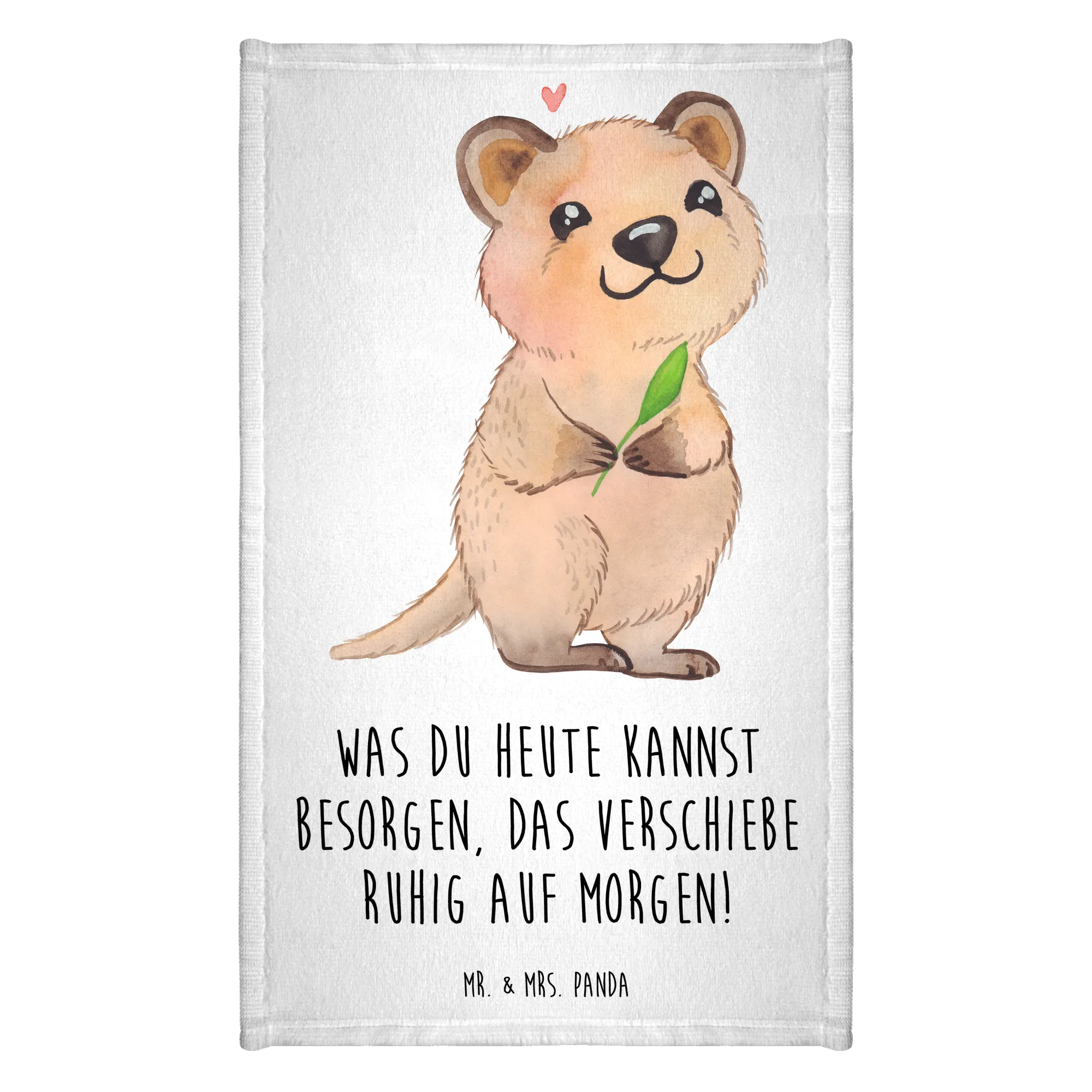 Meet our whimsical Quokka, a little creature that’s bursting with happiness! Its captivating smile, holding a green leaf, is a gentle reminder to embrace contentment in life. Floating above is a soft pink heart, embodying the warmth and love that surrounds us. The saying, 'Was du heute kannst besorgen, das verschiebe ruhig auf morgen!' perfectly highlights the Quokka's philosophy on living. It’s a playful nudge to remind us not to stress about what’s on our checklist, but to focus instead on the joys in the here and now. Let this delightful Quokka inspire you to let go and enjoy the ride!