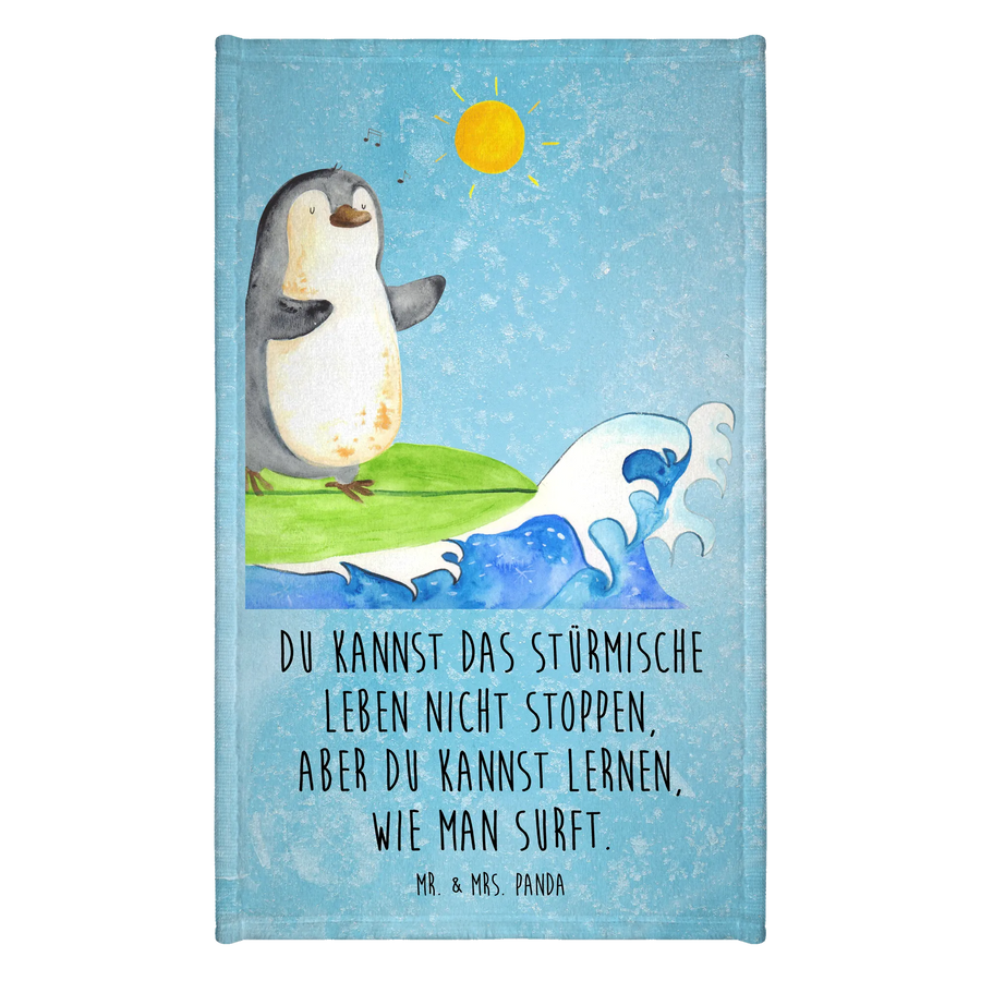Hand towel Penguin surfer - Guest Towel - with saying - Ice blue