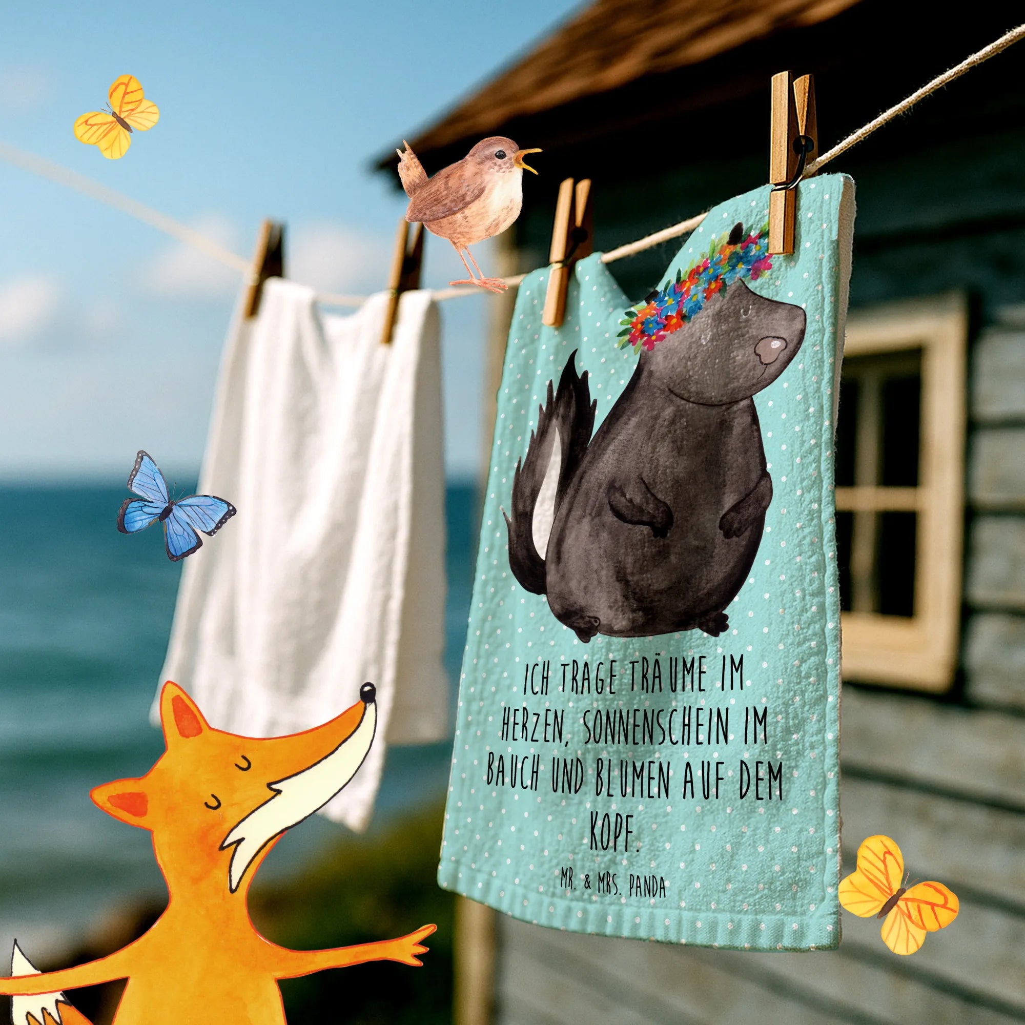 Did we mention how much fun this towel would bring to a child's bathroom? With its cute skunk design and the wonderful slogan "Ich trage Träume im Herzen, Sonnenschein im Bauch und Blumen auf dem Kopf," it ignites the imagination. It’s a perfect way to introduce little ones to the joys of caring for their environment and loving all creatures, big and small.