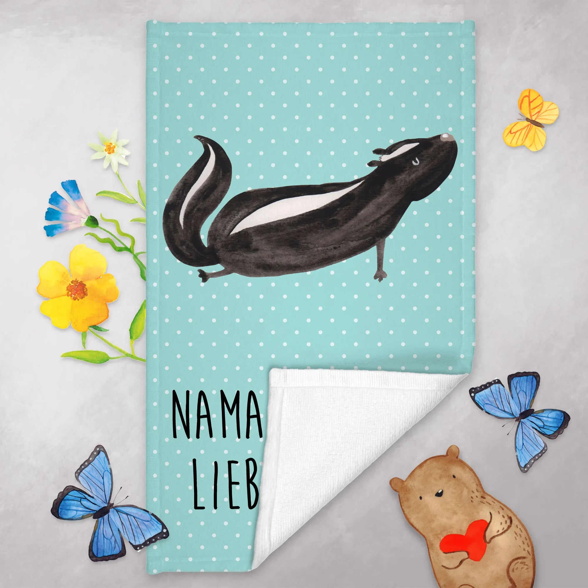 The Skunk Yoga guest towel is not personalized, but it’s designed with love, inspired by Mrs. Panda’s late furry friend, Mr. Flower. This collection is a tribute, a beautiful way to keep memories alive through art. The towel comes all-around hemmed with a double stitch, ensuring durability and a polished look, perfect for showcasing this little piece of art in your home.