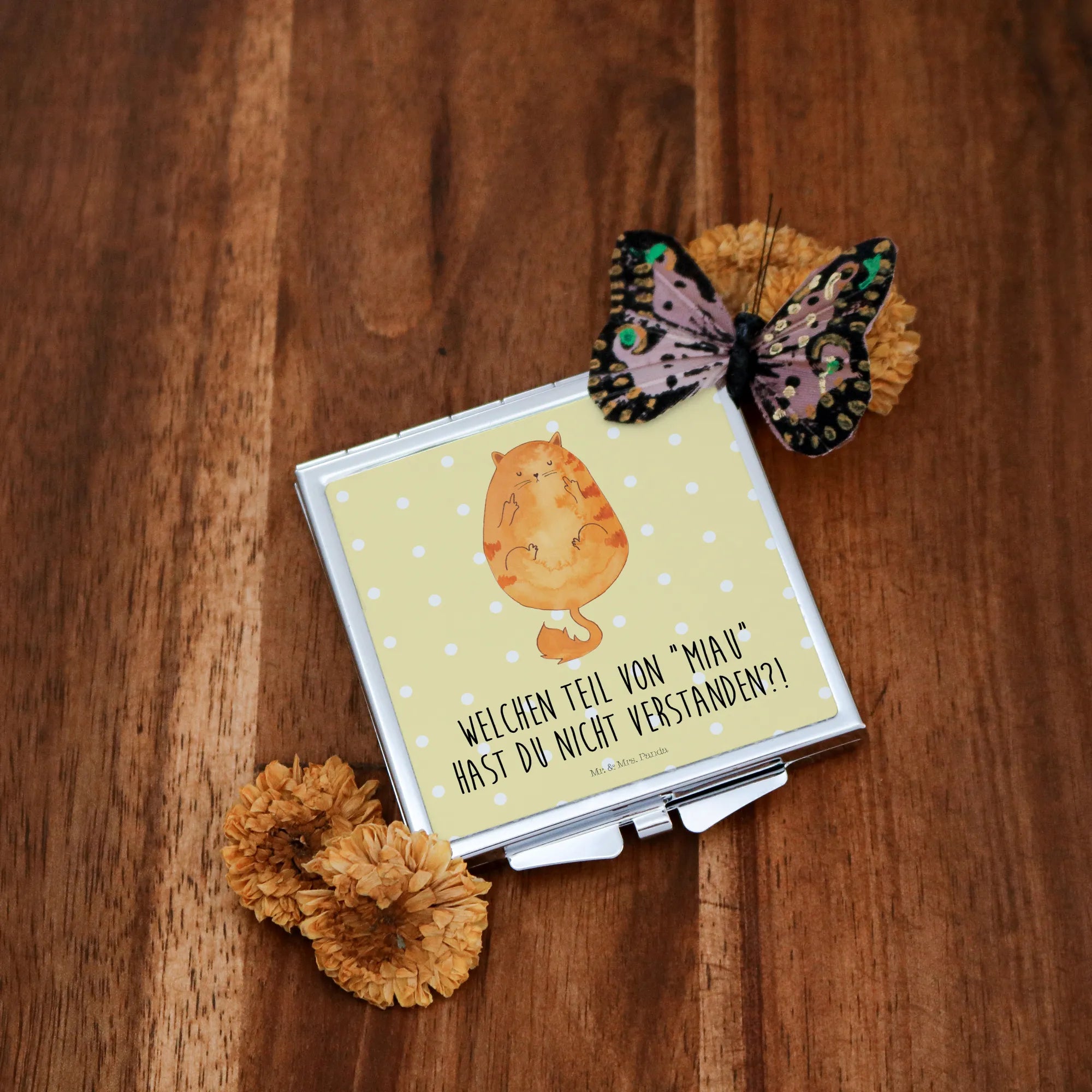 Handbag mirror Cat middle finger - with saying - Pastel Yellow