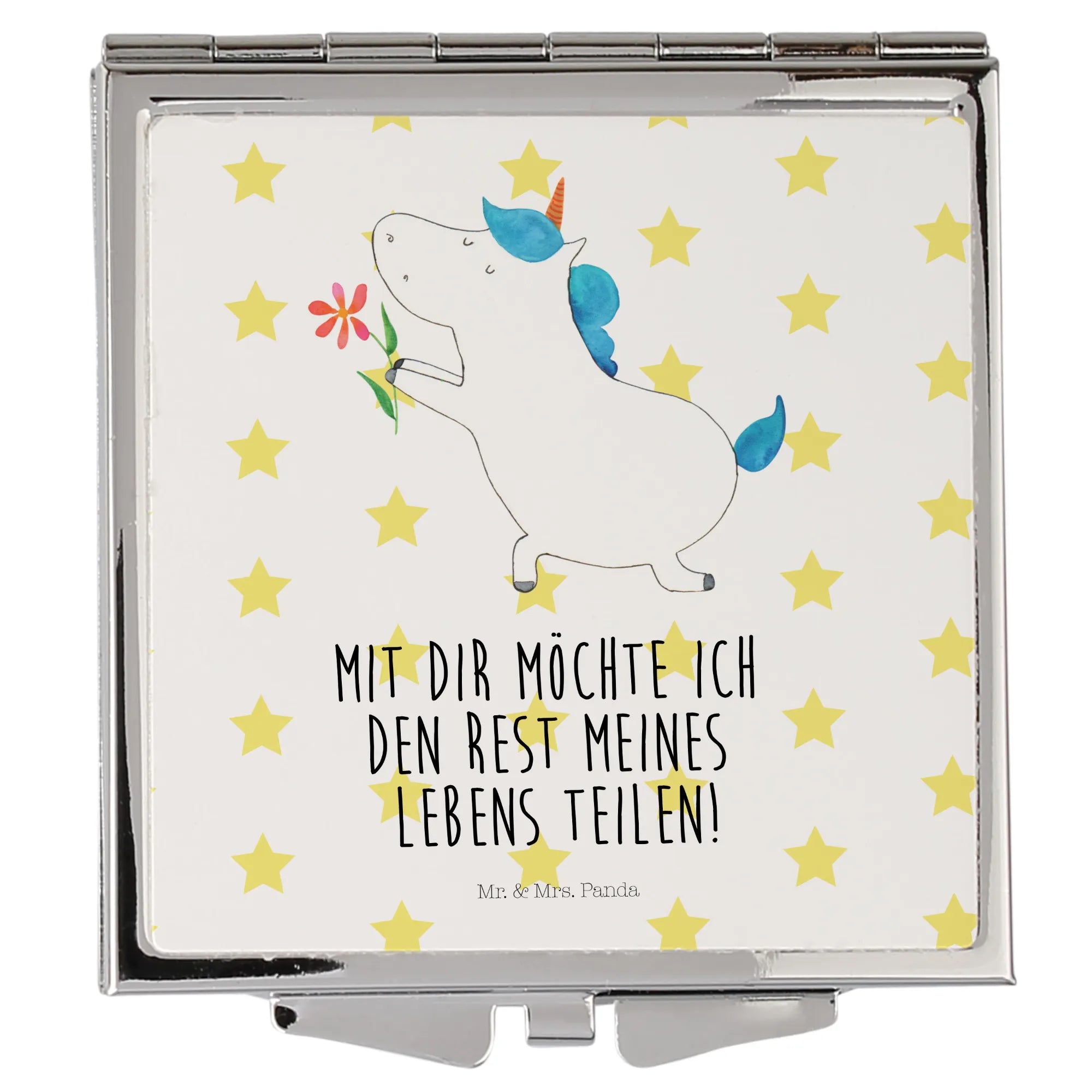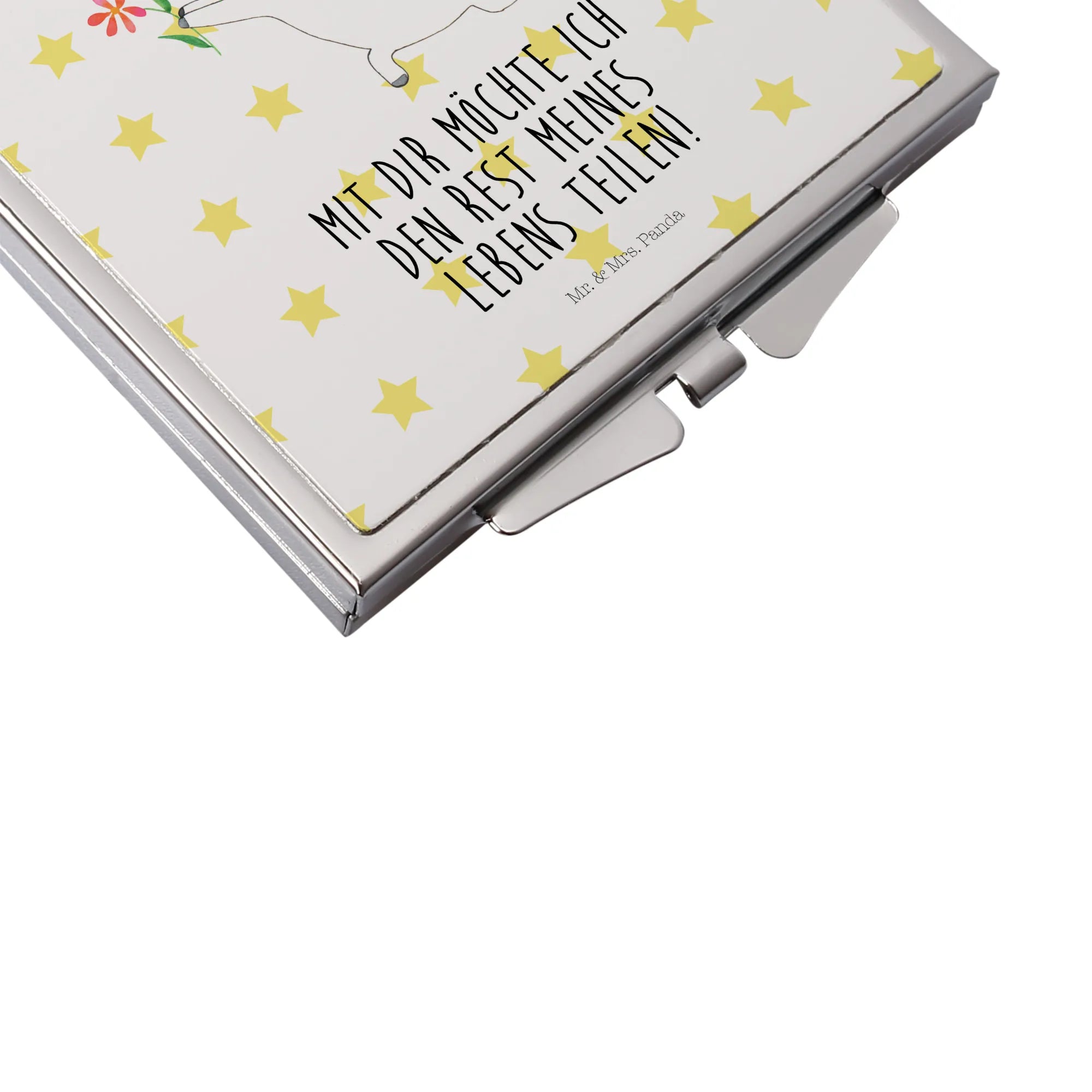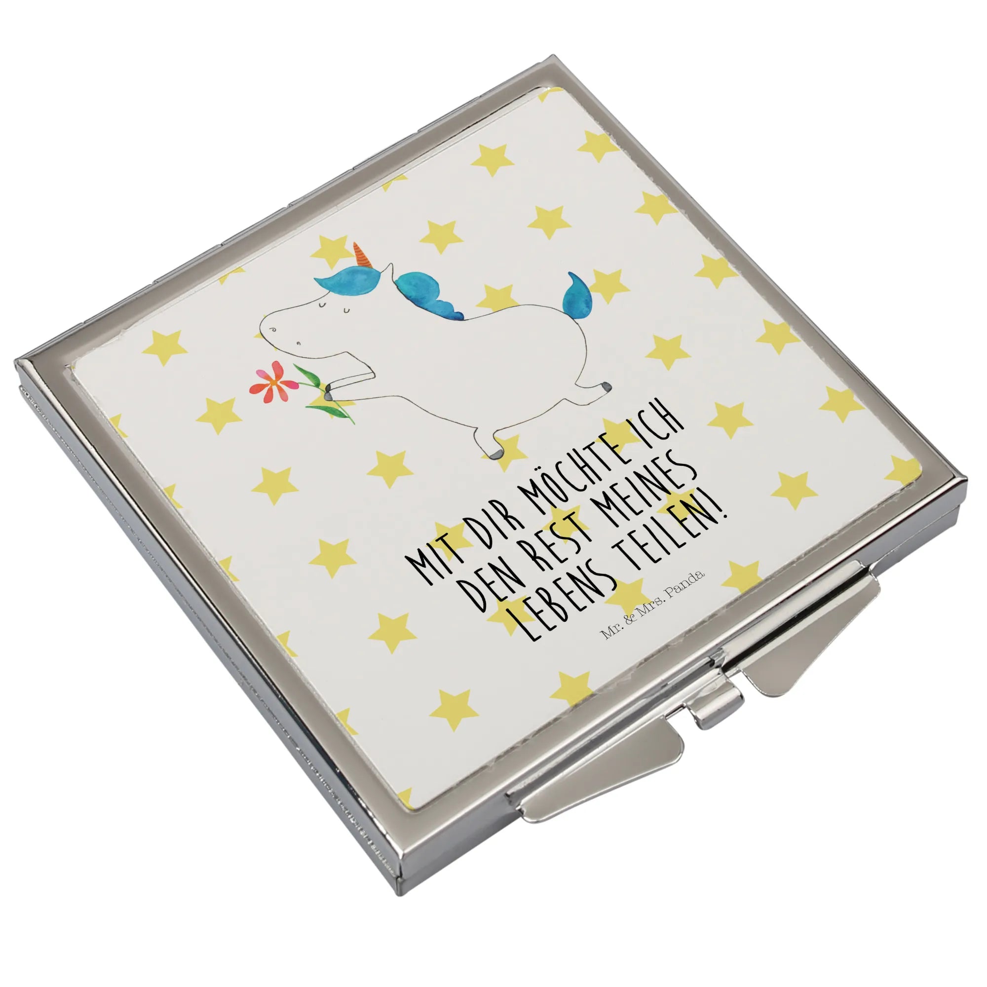 Step into elegance with the enchanting Handbag Mirror from Mr. & Mrs. Panda! This square mirror, sized 60 mm x 60 mm x 8 mm, features delightful motifs and cheerful quotes that elevate any moment. Crafted from top-quality glass with an aluminum metal frame, this durable yet graceful piece is adorned with a shiny silver plating for a classy finish. Its compact, square design means it easily fits into your handbag or backpack, making it the ideal accessory for your on-the-go lifestyle. The secure folding closure prevents scratches and damages, keeping your mirror pristine. Whether it's for a quick touch-up, a spontaneous selfie, or as a thoughtful gift, this mirror will surely bring joy to every recipient. With just a simple wipe using a damp cloth, it remains sparkling clean for all your beauty needs. Bring the Mr. & Mrs. Panda charm into your daily routine with this lovely handbag mirror!