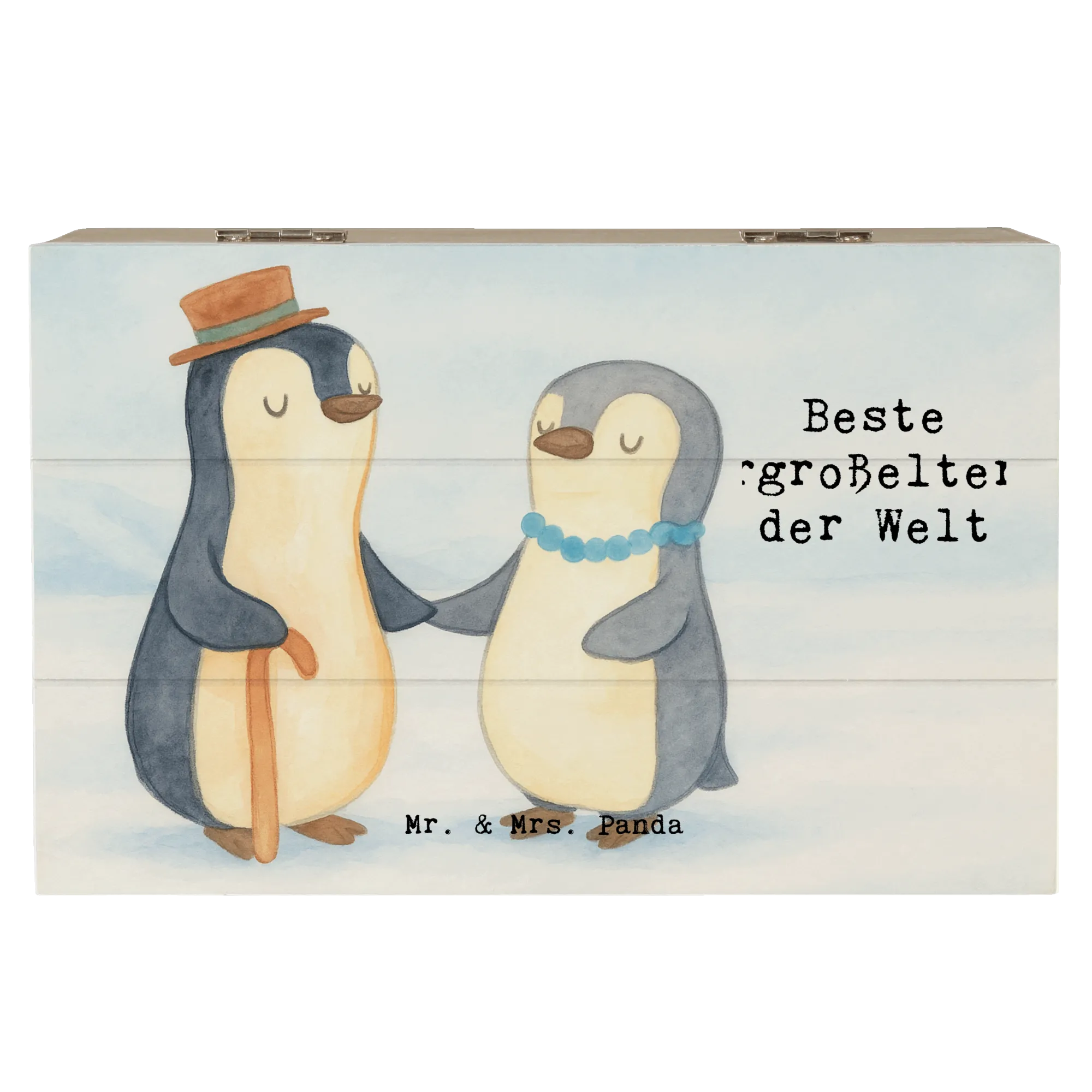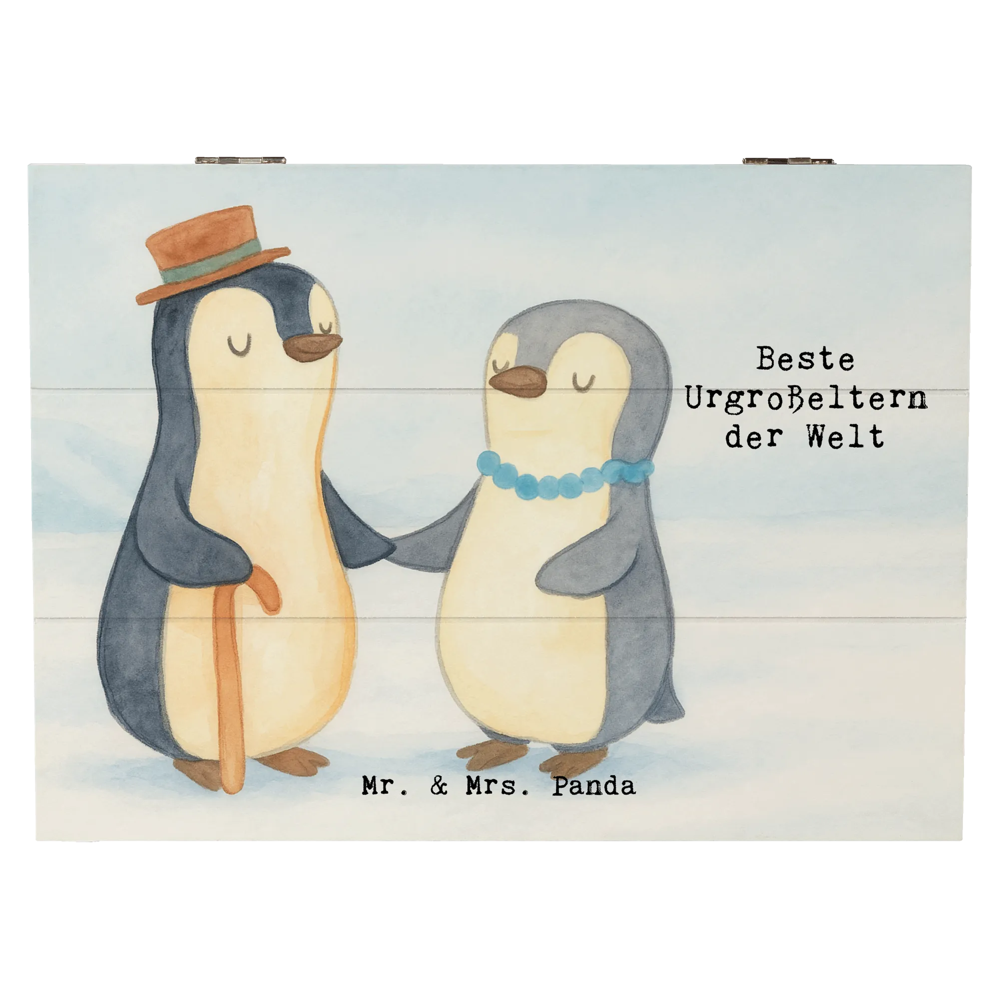 Schaffe Platz für Erinnerungen, erzähle Geschichten und schenke ein Symbol der Wertschätzung – mit der Holzkiste Pinguin „Beste Urgroßeltern der Welt“ von Mr. & Mrs. Panda.