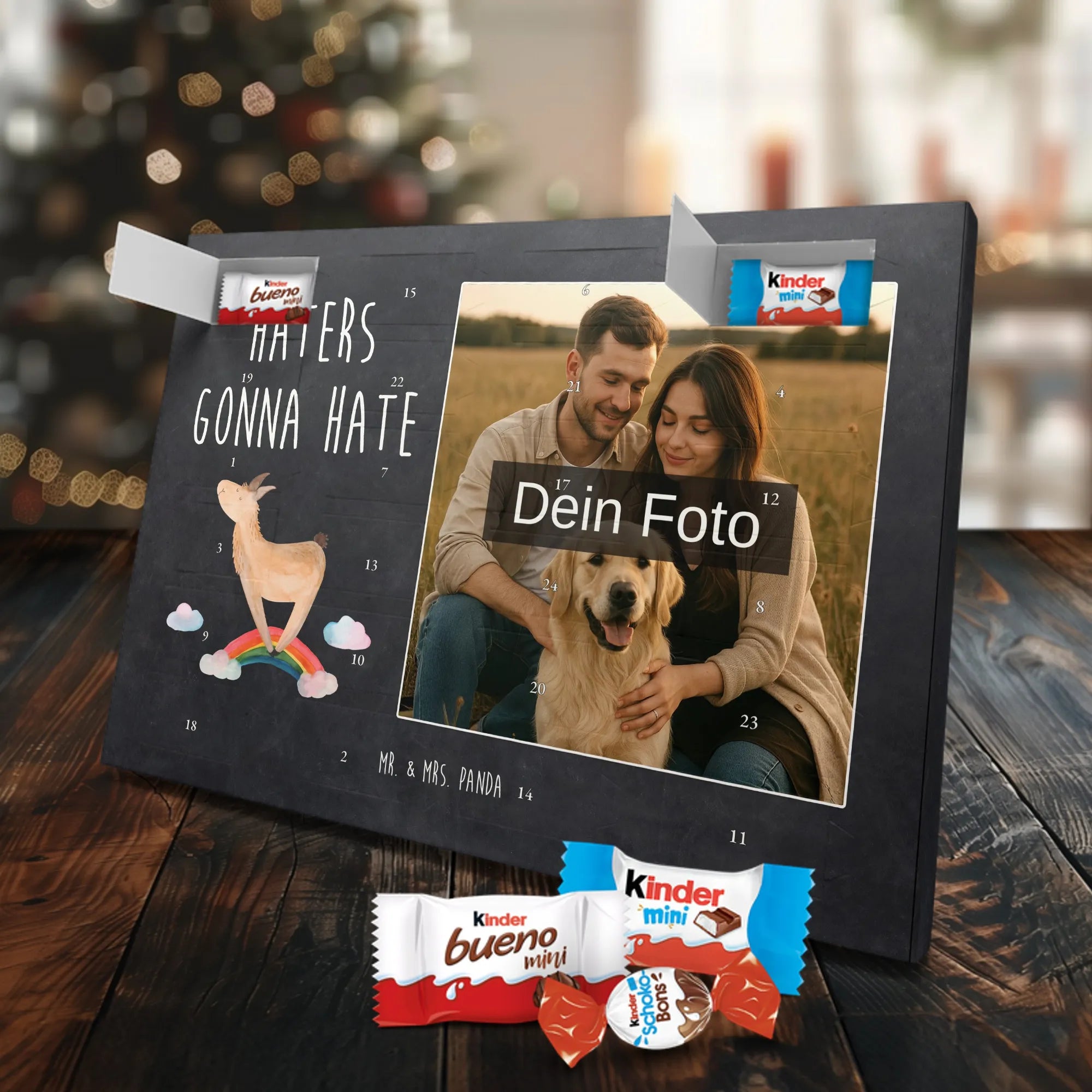 Unser personalisierten Schoko Foto Adventskalender ist ein echtes Highlight in der Adventszeit – handlich, individuell und voller süßer Überraschungen. Du personalisierst die Vorderseite mit deinem liebsten Foto und wir kombinieren es mit liebevollen Motiven und Sprüchen von Mr. & Mrs. Panda. Bitte achte auf eine ausreichende Bildauflösung und einen passenden Bildausschnitt, damit das Druckergebnis gestochen scharf ist. Lade nur Bilder hoch, deren Rechte du besitzt oder bei denen du die Erlaubnis hast, besonders wenn Personen darauf zu sehen sind. Wichtig: Fotos werden nicht retuschiert oder zugeschnitten; personalisierte Foto-Artikel sind vom Widerruf ausgeschlossen. Der Kalender besticht durch brillante Druckqualität und eine seidenmatte Oberflächenveredelung sowie bedruckte Seitenflächen. Maße: 355 mm x 245 mm x 11 mm. Du kannst ihn entweder aufstellen oder an die Wand hängen. Gefüllt ist der Adventskalender mit kinder® Schokolade, inklusive kinder® Schoko-Bons, kinder® Bueno mini und kinder® Schokolade mini. Ein liebevolles, persönliches Geschenk für Kinder, Freunde oder die bessere Hälfte – individuell, süß und mit dem typischen Mr. & Mrs. Panda Charme.