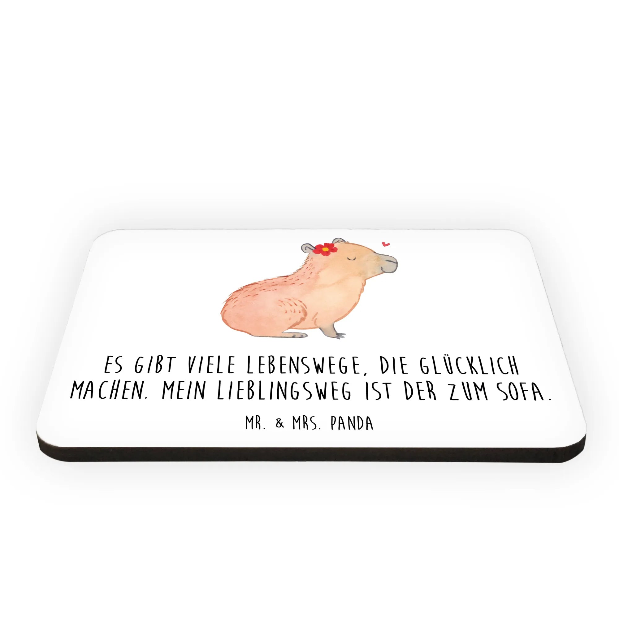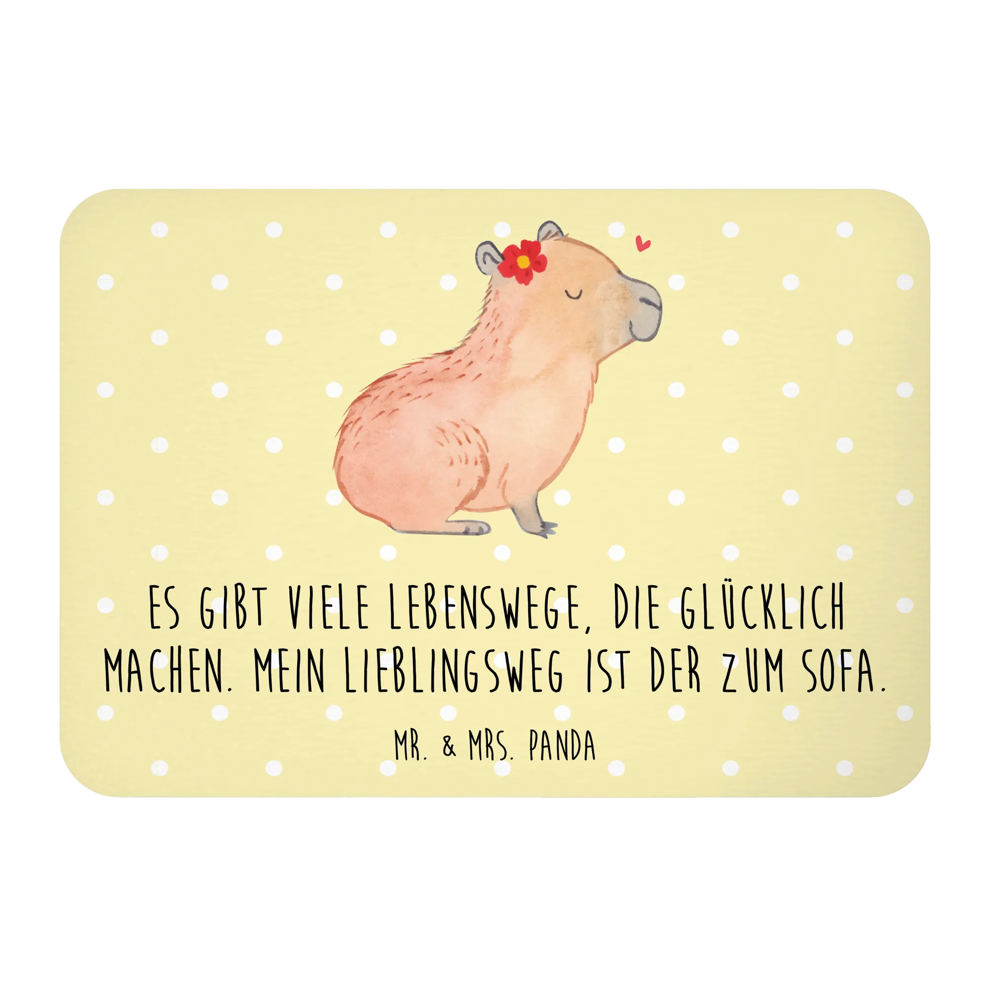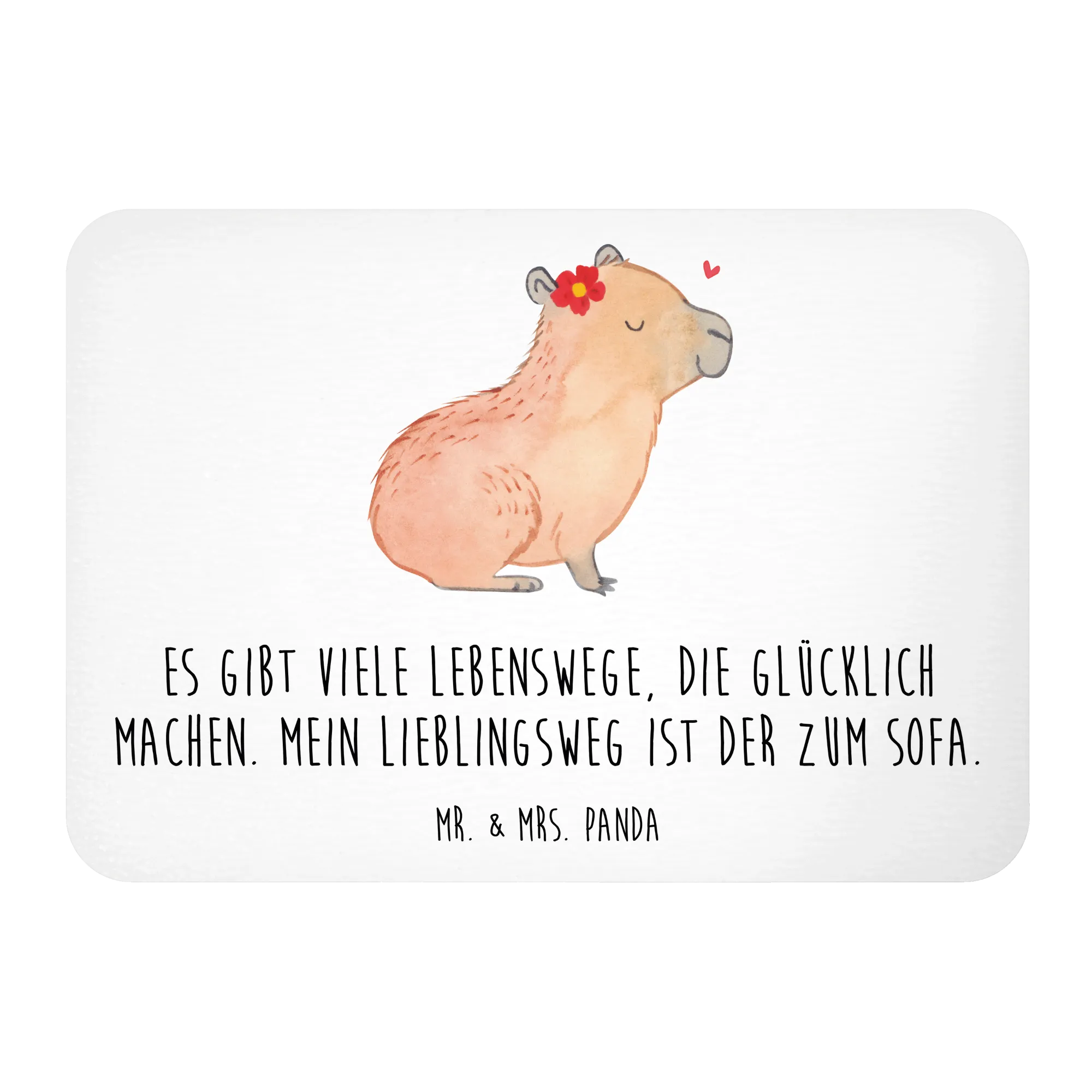 Allow us to present the charming Capybara Flower! The relaxed capybara, eyes closed and smiling, is gracefully adorned with a vibrant red flower featuring a cheerful yellow center. Above it, a floating heart showcases the love and warmth of life’s little moments. This motif is a picturesque representation of our belief that Es gibt viele Lebenswege, die glücklich machen. Mein Lieblingsweg ist der zum Sofa. So let’s celebrate the joy of pure stillness and gentle happiness in our everyday lives!