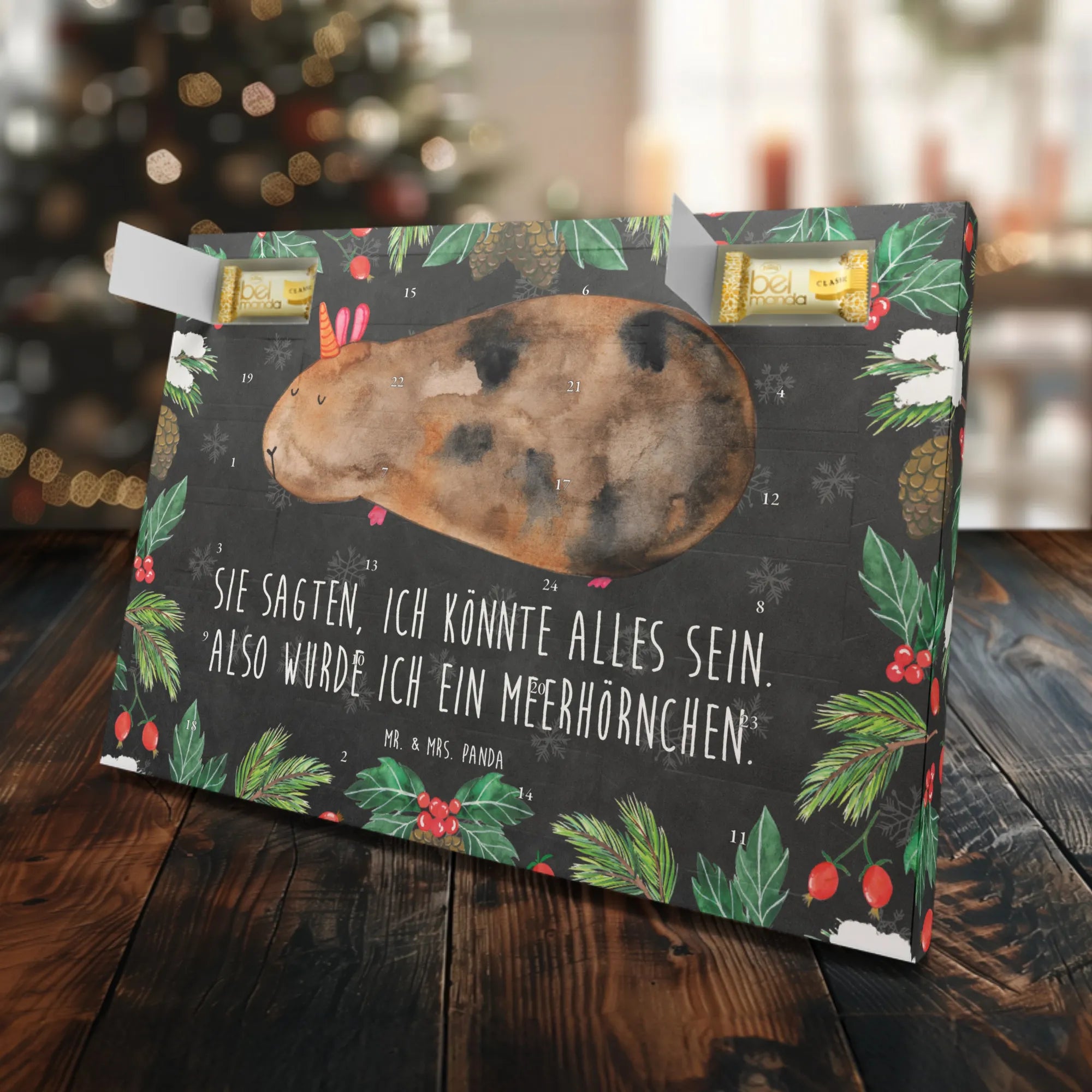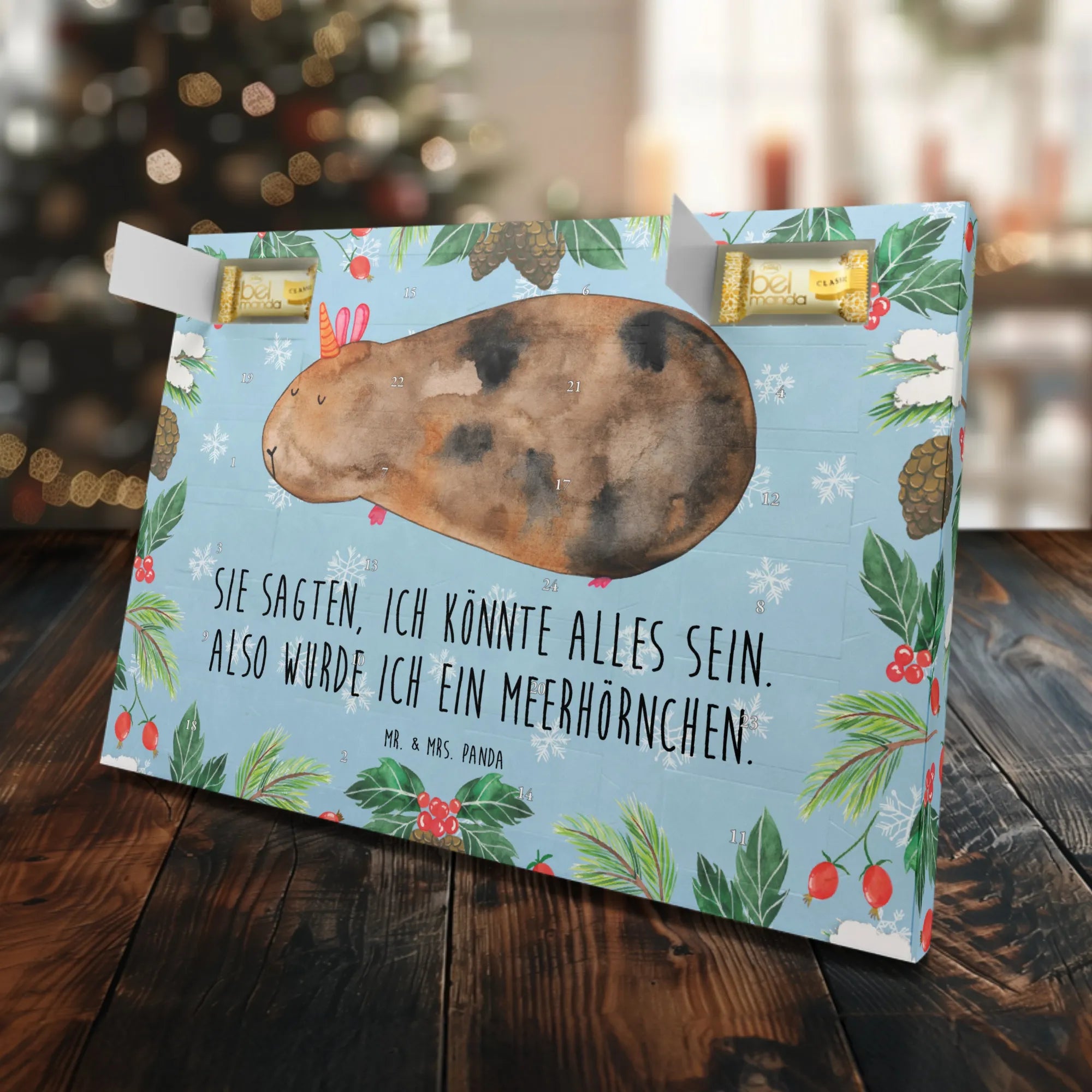 Die liebevoll gestaltete Verpackung zeigt ein bezauberndes Meerschweinchen mit einem klitzekleinen Horn, und der witzige Spruch 'Sie sagten, ich könnte alles sein. Also wurde ich ein Meerhörnchen.' bringt jeden zum Schmunzeln. Dieser Adventskalender eignet sich hervorragend für Kinder, die die magische Welt der Einhörner lieben, aber auch für Erwachsene, die sich an den süßen Erinnerungen ihrer Kindheit erfreuen möchten.