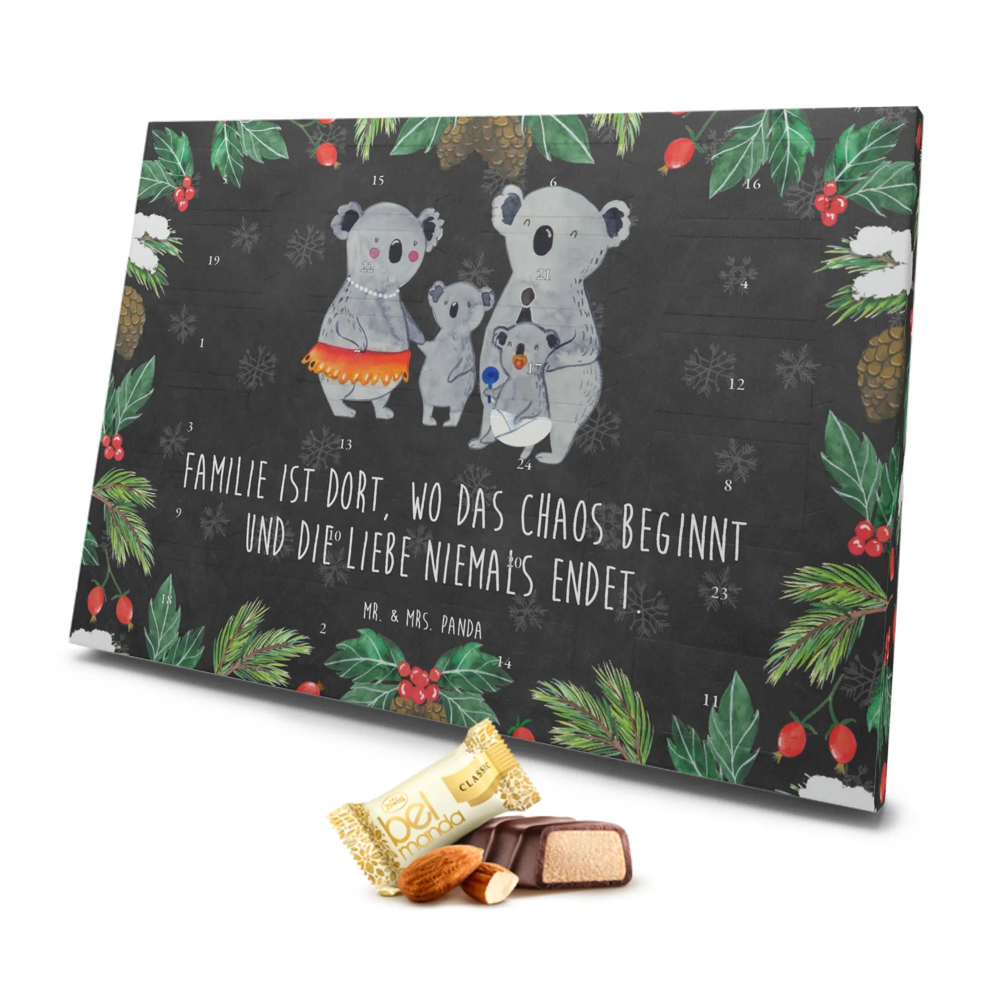 Der wunderschöne Marzipan Adventskalender 'Koala Familie' von Mr. & Mrs. Panda ist nicht nur ein festlicher Countdown bis Weihnachten, sondern auch ein ideales Geschenk für die ganze Familie! Dieser Adventskalender ist mit einer herzerwärmenden Darstellung von fröhlichen Koalas bedruckt, die menschliche Züge und Accessoires tragen. Mit dem Slogan 'Familie ist dort, wo das Chaos beginnt und die Liebe niemals endet' wird die Bedeutung von familiärer Verbundenheit auf liebevolle Weise vermittelt.