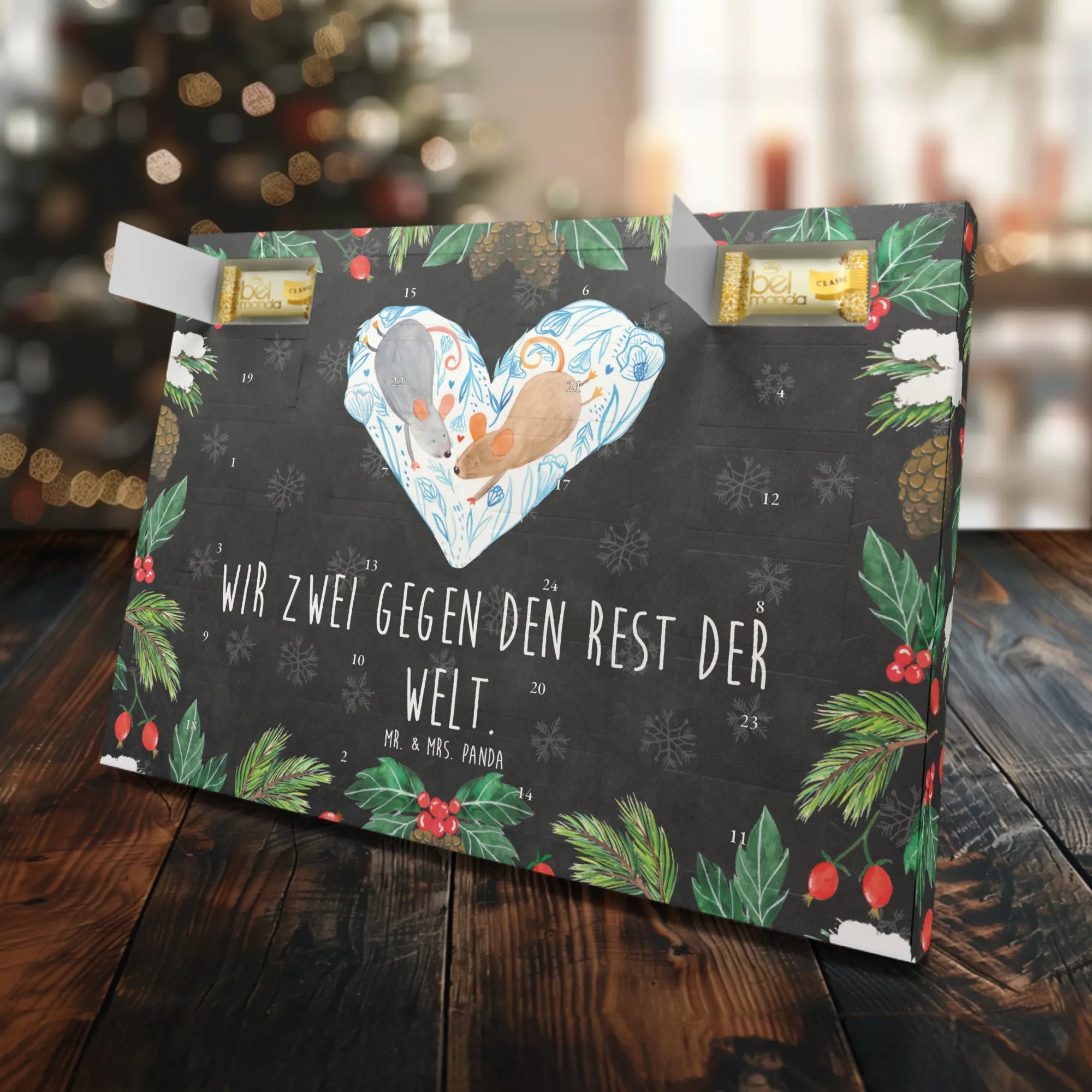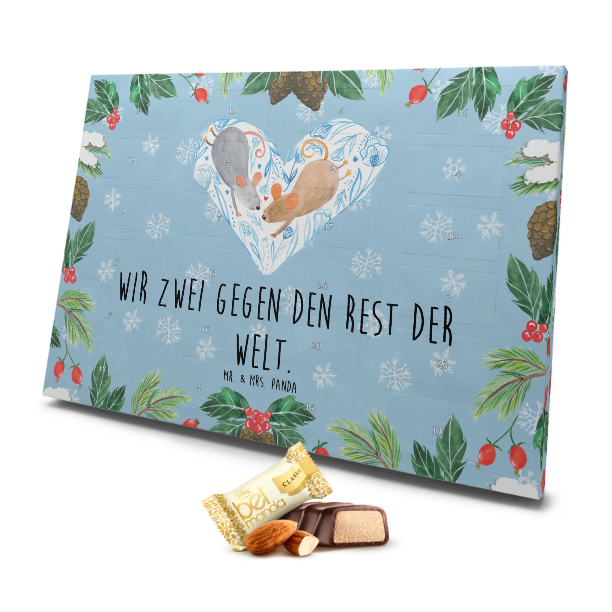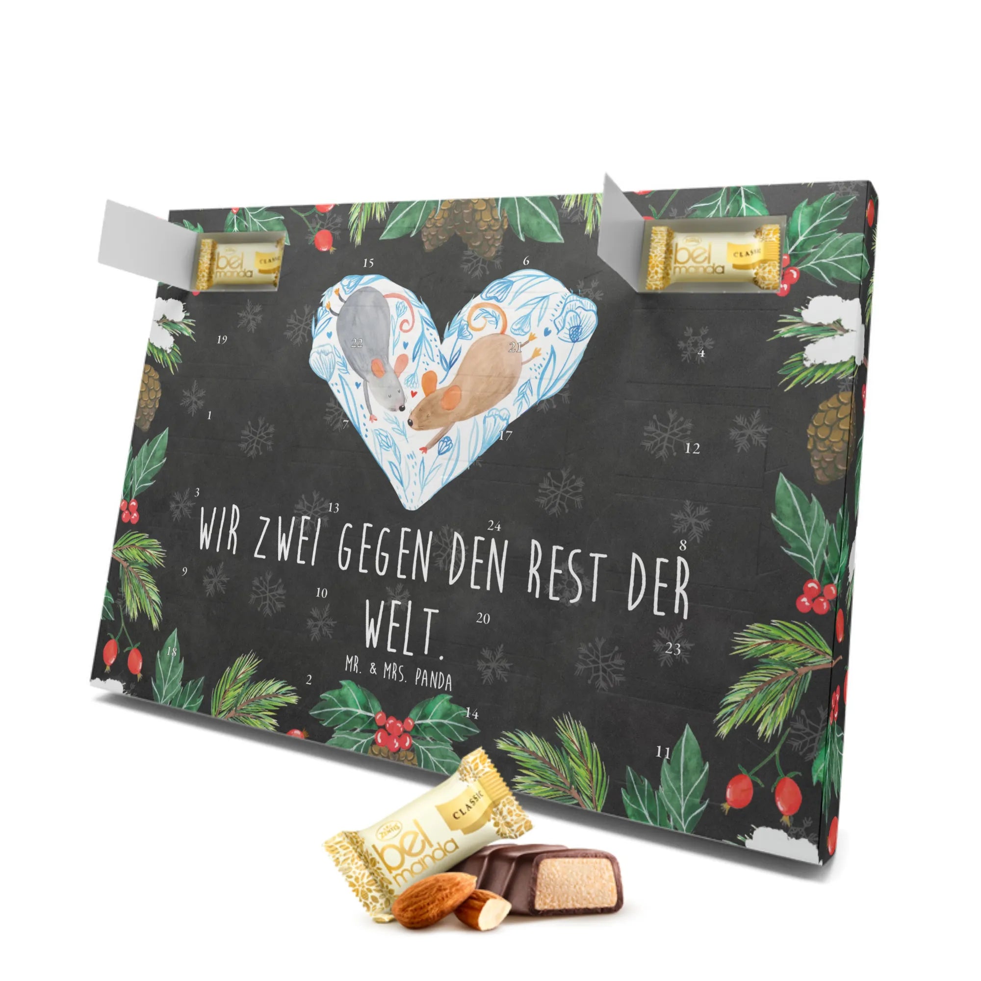 Entdecke den zauberhaften Marzipan Adventskalender mit dem liebevollen Motiv "Mäuse Herz" von Mr. & Mrs. Panda. Dieser wundervolle Adventskalender ist nicht nur ein Highlight in der Vorweihnachtszeit, sondern auch das perfekte Geschenk für deinen Lieblingsmenschen.
