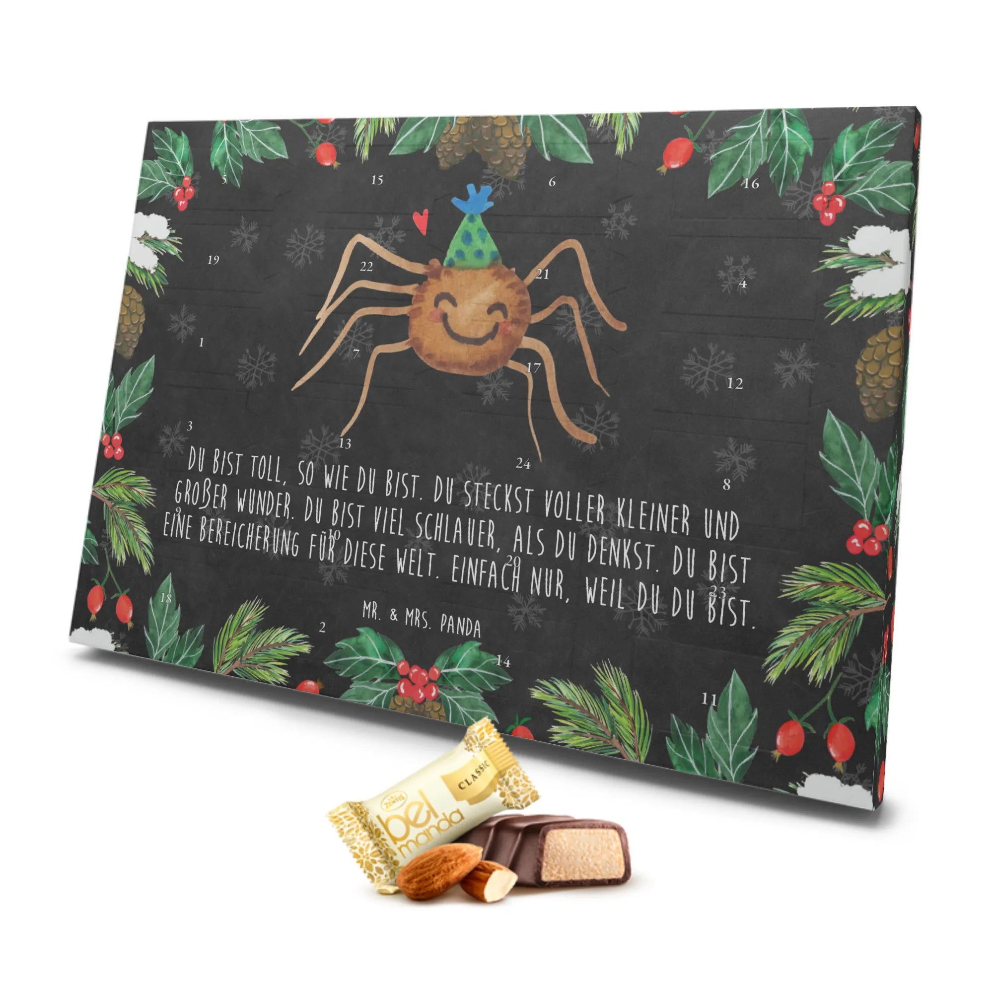 Der Marzipan Adventskalender Spinne Agathe Party von Mr. & Mrs. Panda ist die perfekte Überraschung für alle, die den Advent mit Freude und Selbstliebe feiern möchten.