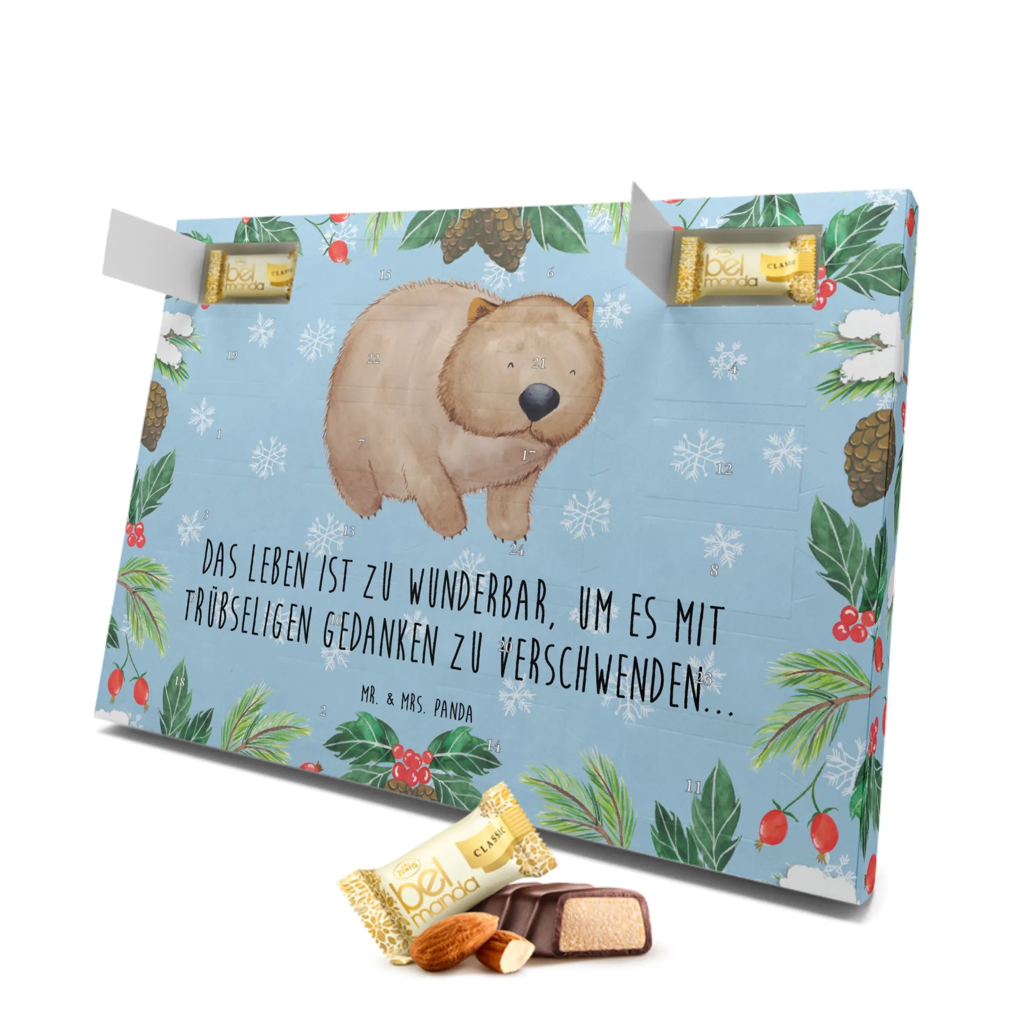 Entdecke den bezaubernden Marzipan Adventskalender mit dem süßen Wombat-Motiv aus der Small World Kollektion von Mr. & Mrs. Panda. Wenn die Tage bis Weihnachten gezählt werden, zeigt dieser Adventskalender, dass das Leben schön ist – ganz nach dem Motto: 'Das Leben ist zu wunderbar, um es mit trübseligen Gedanken zu verschwenden...'