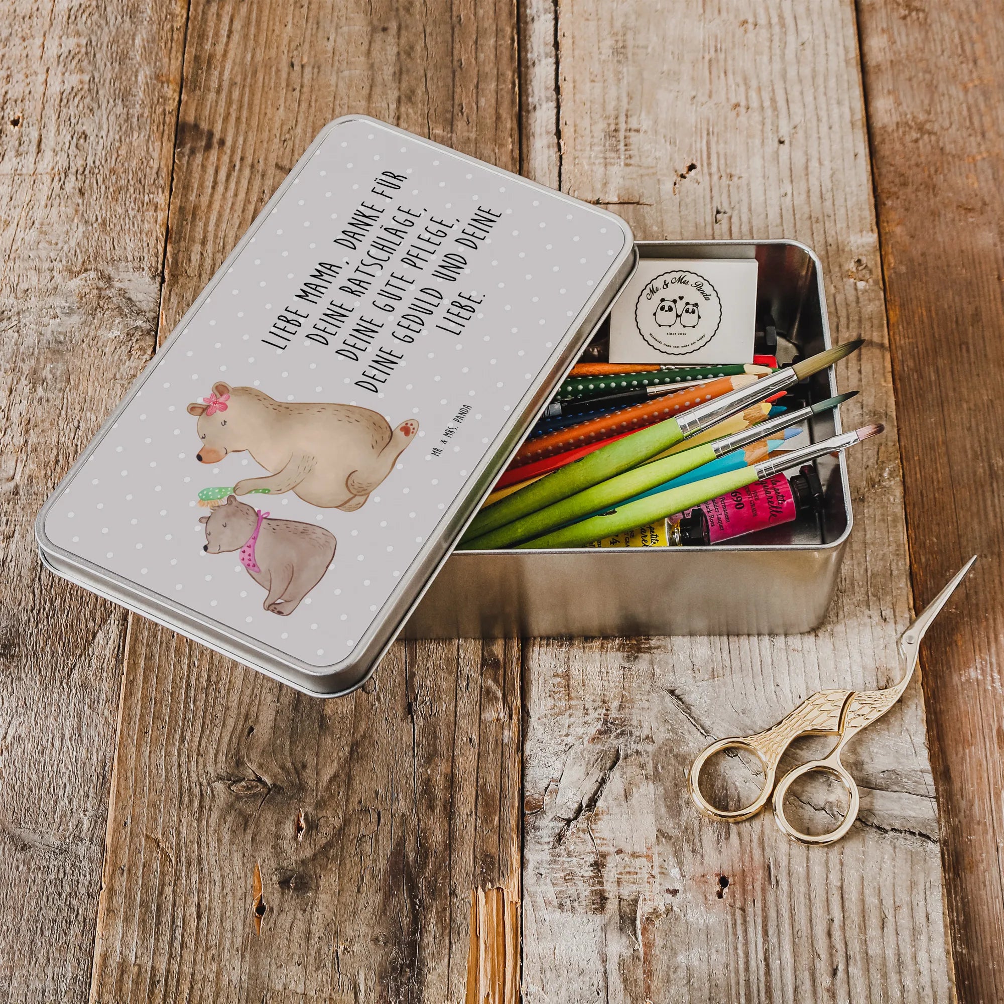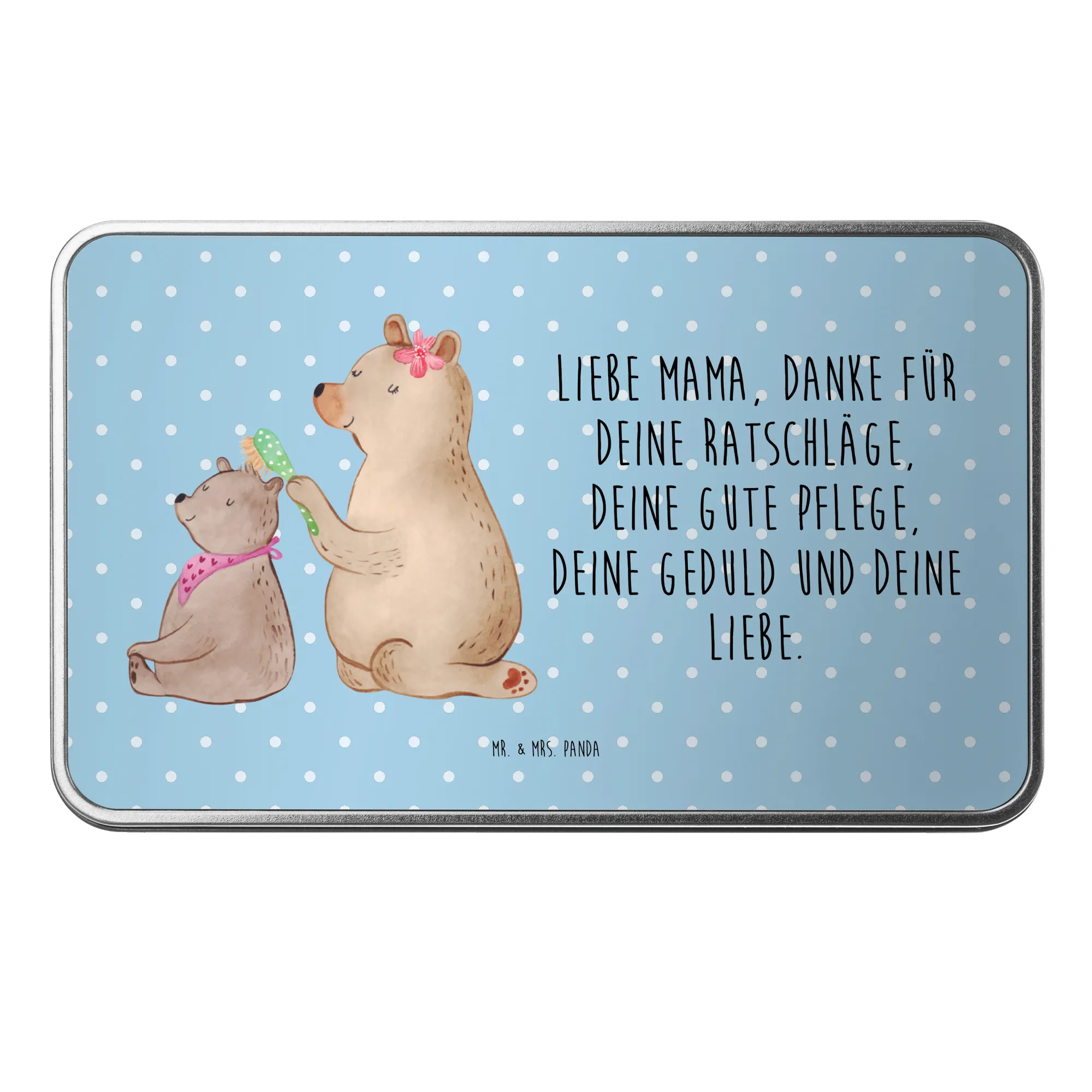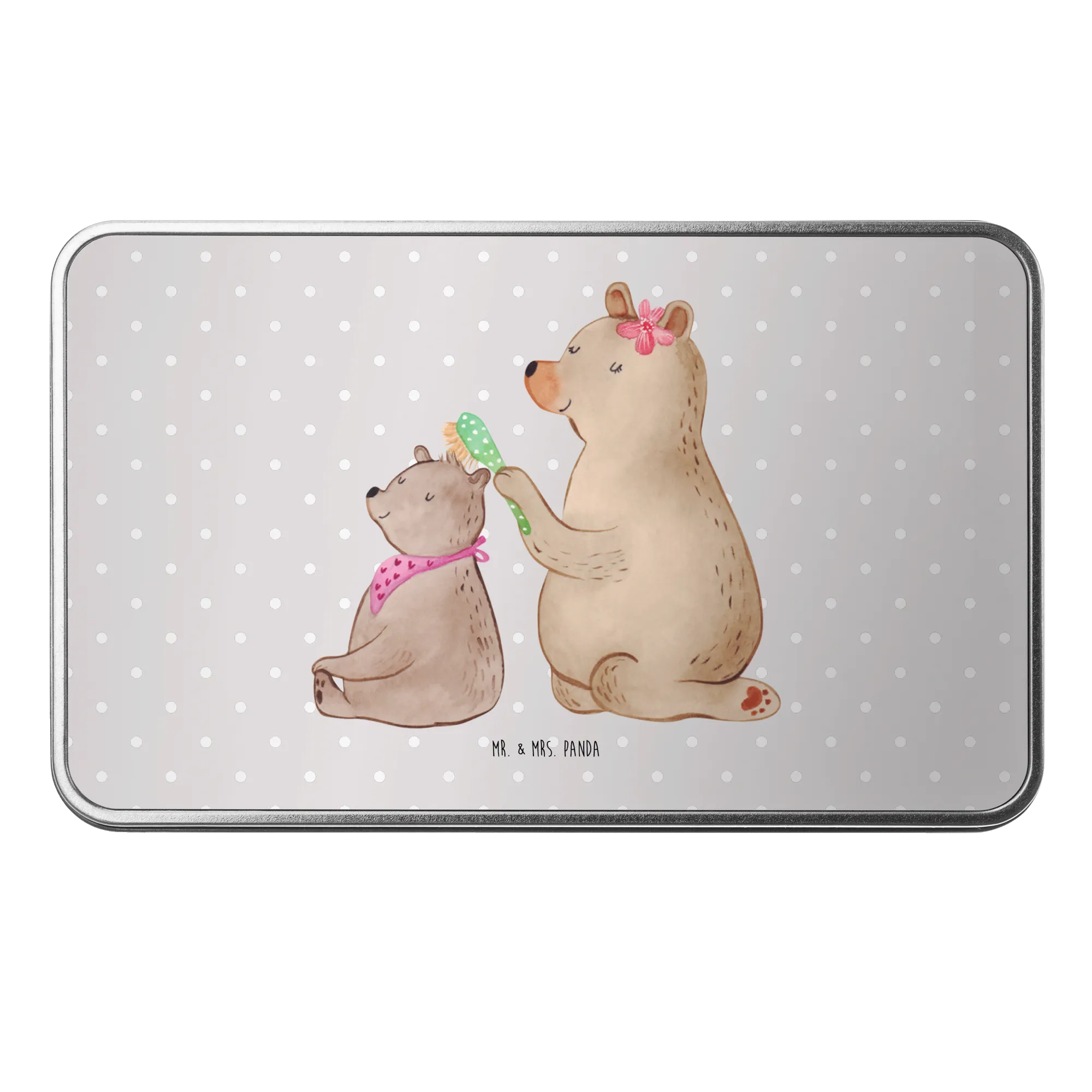 Measuring approximately 7 inches by 5 inches, and 1 inch deep, this metal box has a shiny, high-quality finish that reflects the love and care put into its design. The adorable motif depicts a loving scene where a big bear gently combs the hair of a smaller, blissful bear, creating a warm sense of familial connection. It doesn’t just look good; it feels good too, as it is made from durable aluminum that ensures long-lasting use.