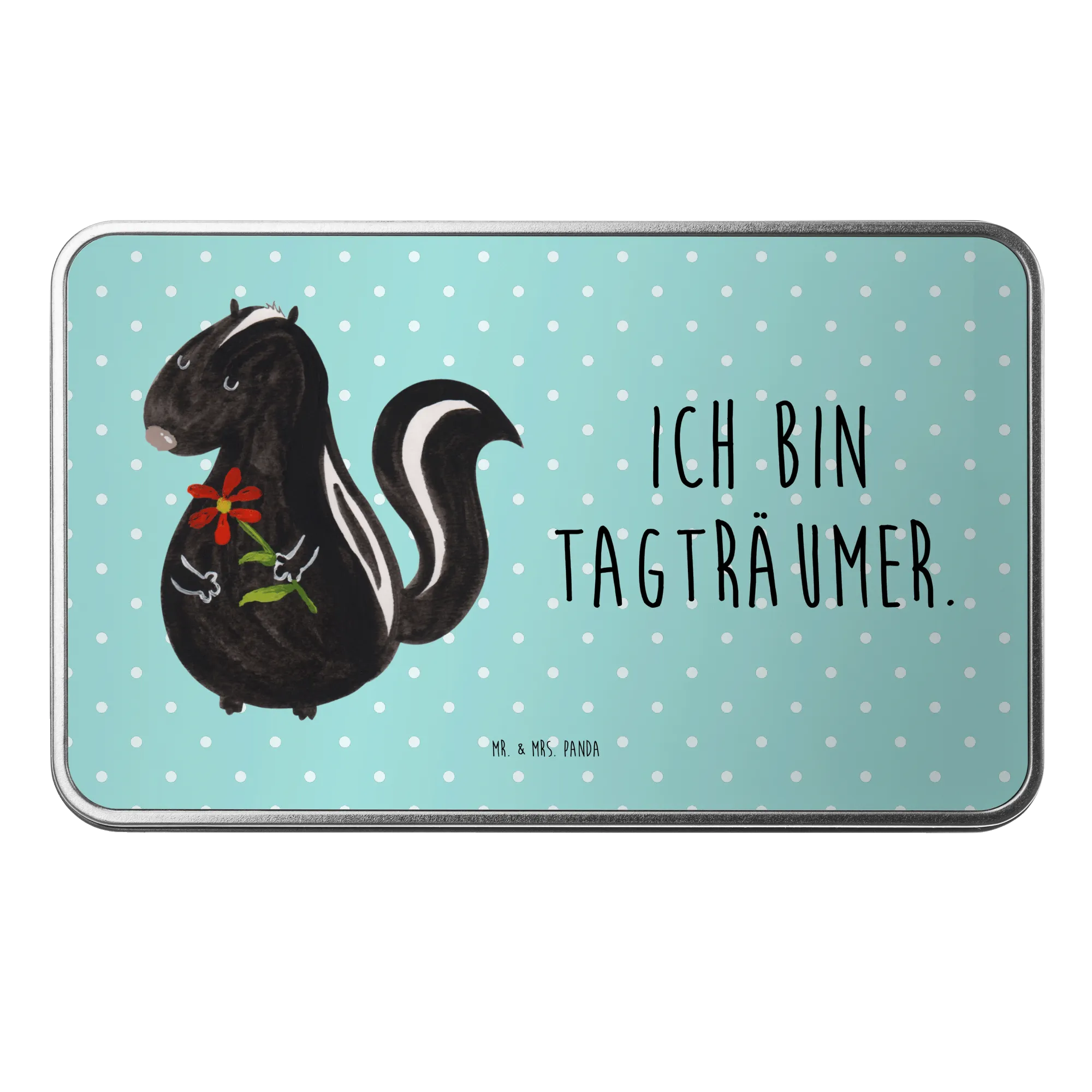 The whimsical skunk design is hand-drawn in watercolor by Mrs. Panda, showcasing her artistic flair and heartfelt tribute to Mr. Flower. Perfect for various occasions, this cute storage tin makes an impeccable gift for friends, family, or even as a treat for yourself. Thinking of ways to celebrate a birthday, anniversary, or a housewarming? This metal tin is an ideal choice!