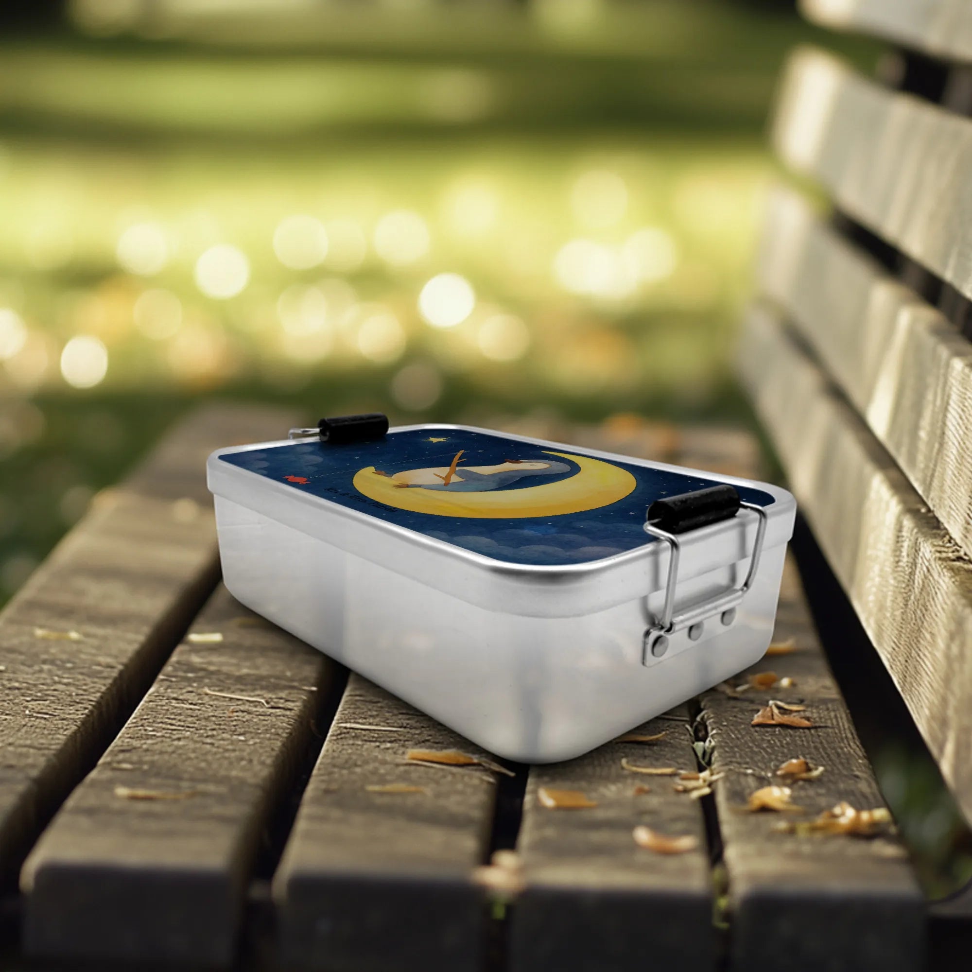 Die süße Brotdose Metall zeigt einen kleinen Pinguin, der es sich auf einer Mondsichel gemütlich gemacht hat und mit einer Angel nach Sternen angelt. An der Angel hängt ein Bonbon – ein Motiv, das sofort ein Lächeln zaubert. Das helle, freundliche Design passt perfekt als Schul Brotdose, Vesperdose Metall oder Lunchbox Metall für Erwachsene.