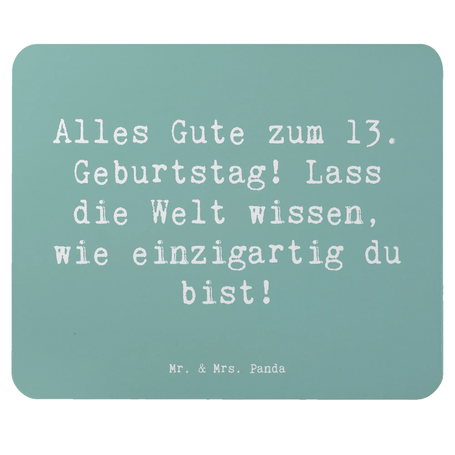 Entdecke das perfekte Geschenk für jeden 13. Geburtstag mit dem einzigartigen Mauspad von Mr. & Mrs. Panda! Ideal für junge Gamer, Schüler und kreative Köpfe, die ihren Schreibtisch mit einem Hauch von Individualität und positiven Vibes aufpeppen möchten. Mit dem Slogan "Alles Gute zum 13. Geburtstag! Lass die Welt wissen, wie einzigartig du bist!" setzt dieses Mauspad ein tolles Zeichen und zeigt jedem, dass der 13. Geburtstag ein ganz besonderer Anlass ist.