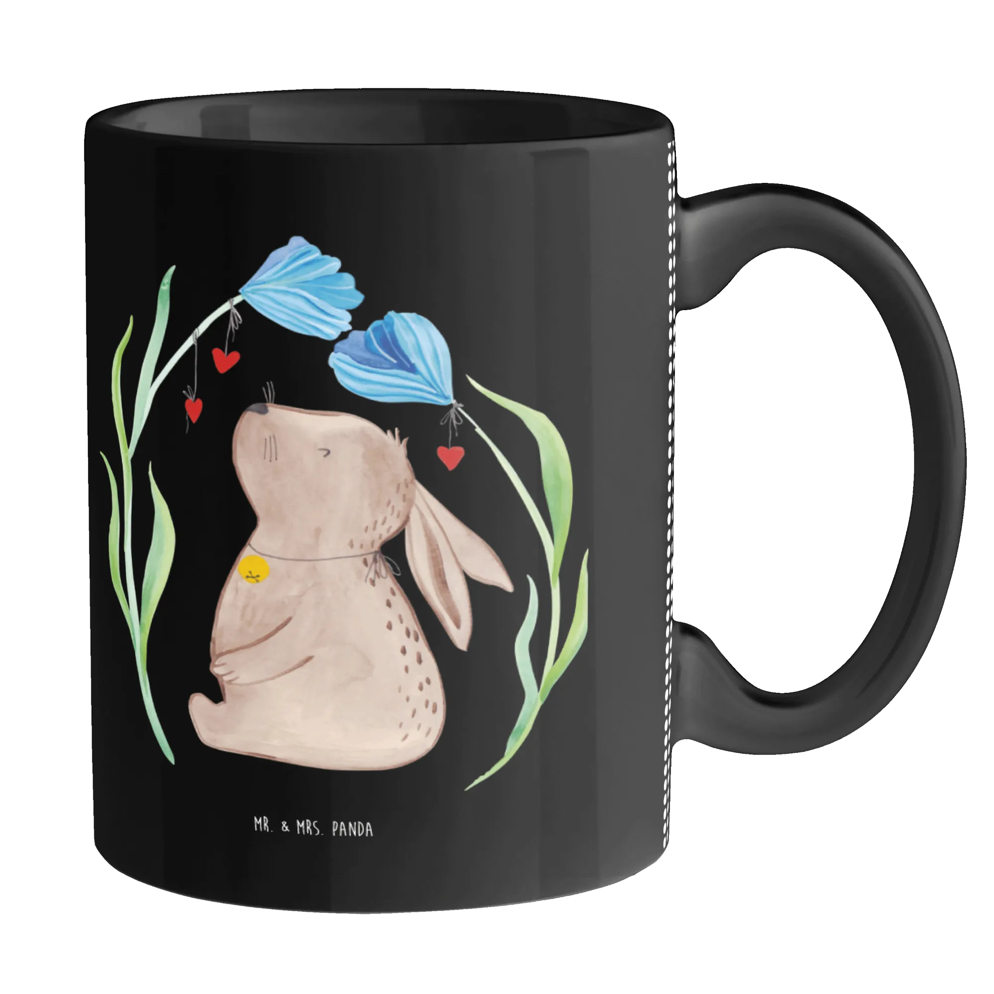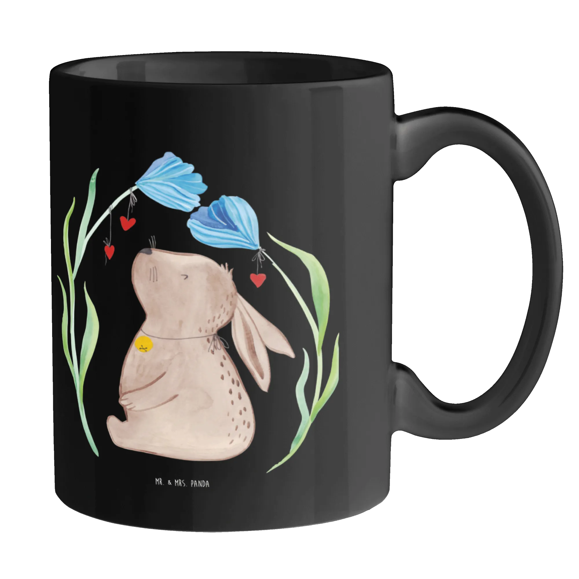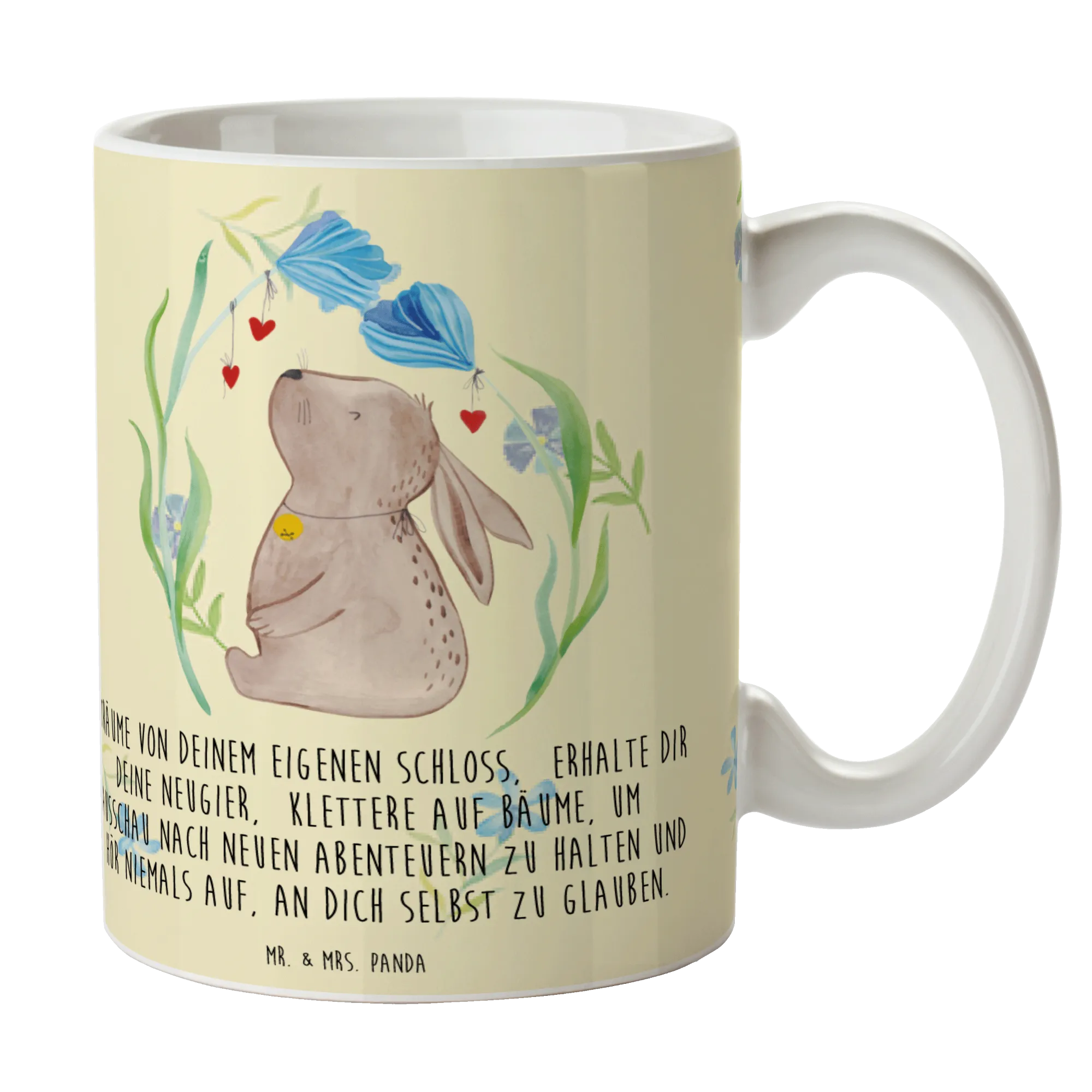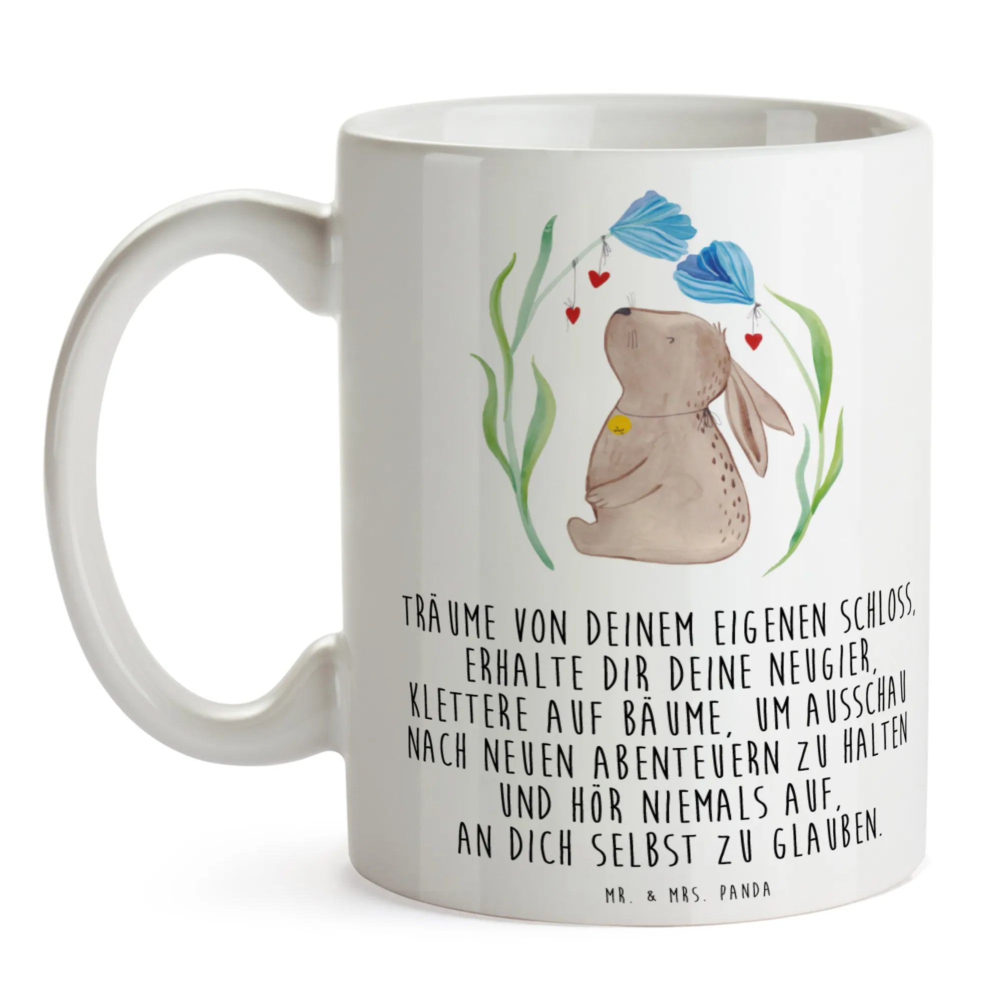 Hol dir den Frühling ins Herz! Die Tasse „Hase Blume“ aus der liebevollen Ostern - Kollektion von Mr. & Mrs. Panda zaubert dir ein Lächeln ins Gesicht. 🐰🌼 Ein süßer Hase sitzt zwischen großen Blumen und trägt ein Glöckchen um den Hals. Glöckchenklingelnd hüpft Hase Blume durch die bunten Blumenwiesen. Dieses Motiv bringt Fröhlichkeit, Hoffnung und kindliche Neugier in deinen Alltag.