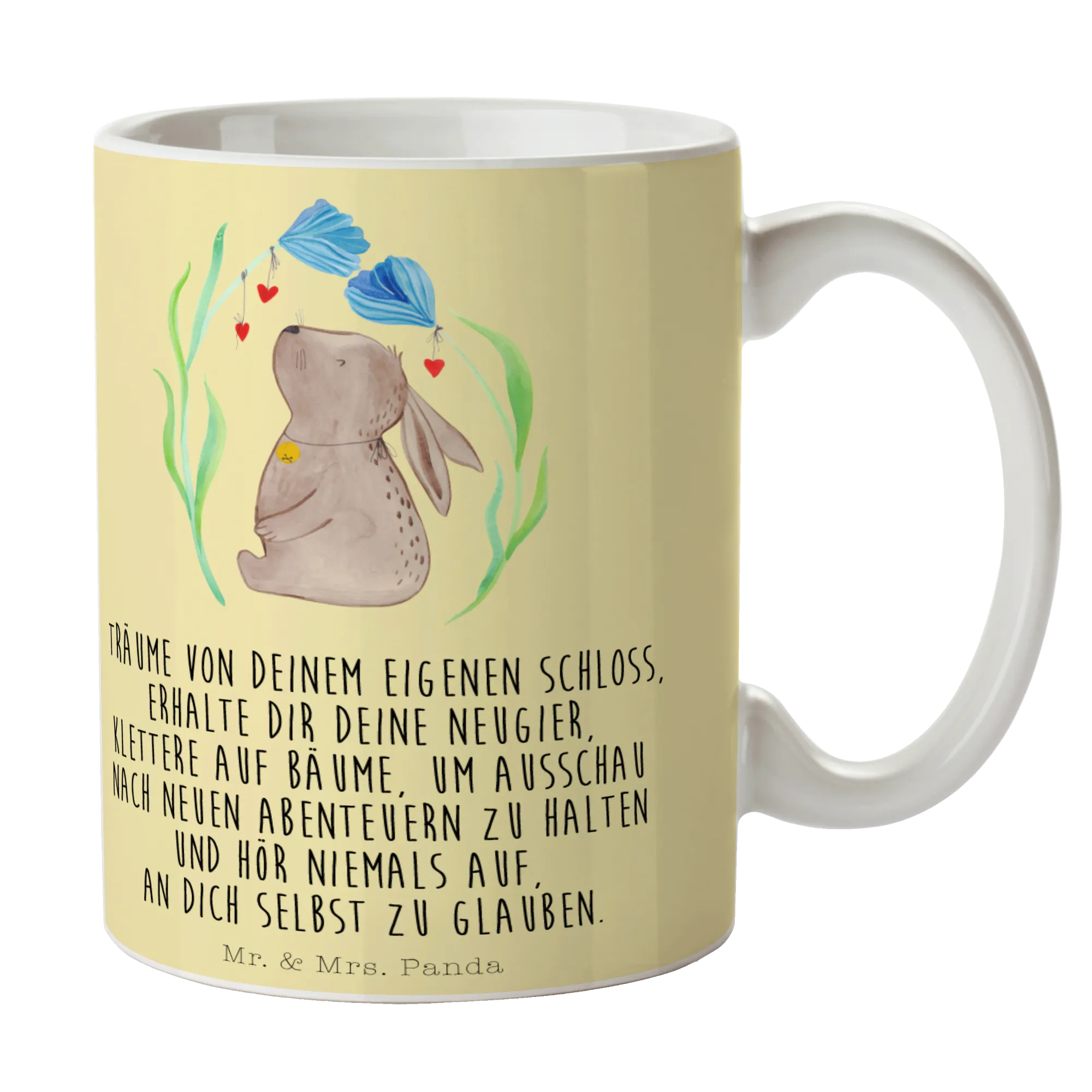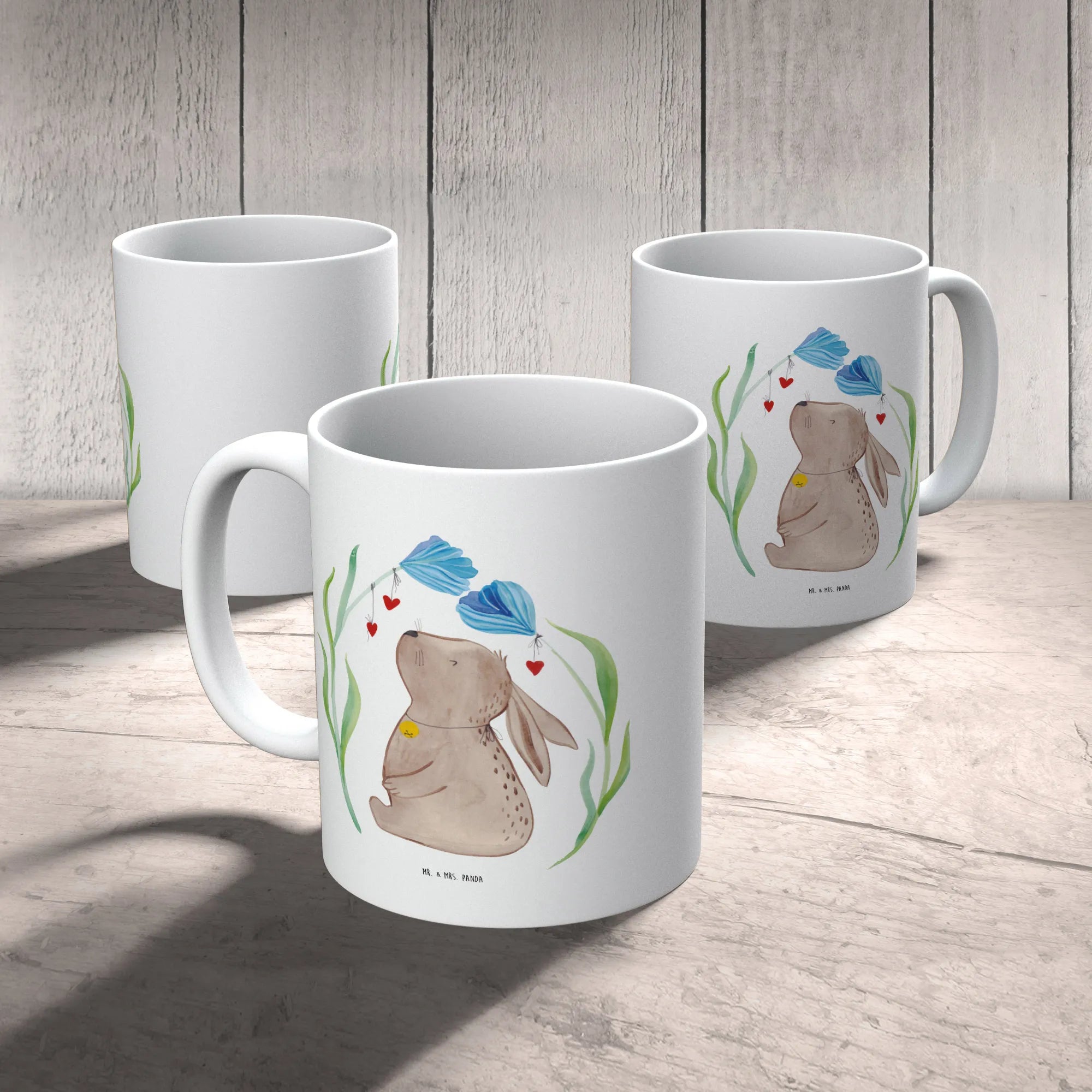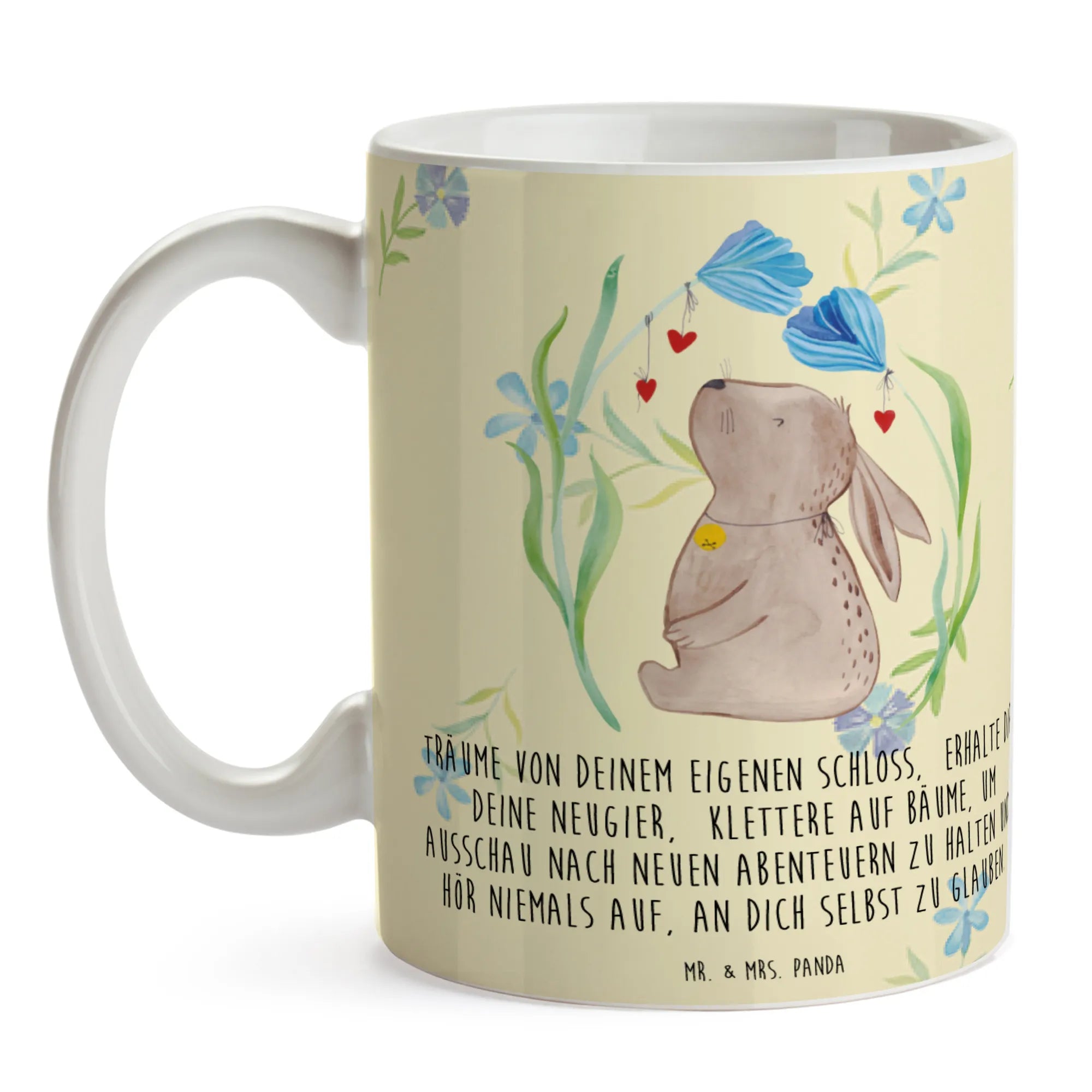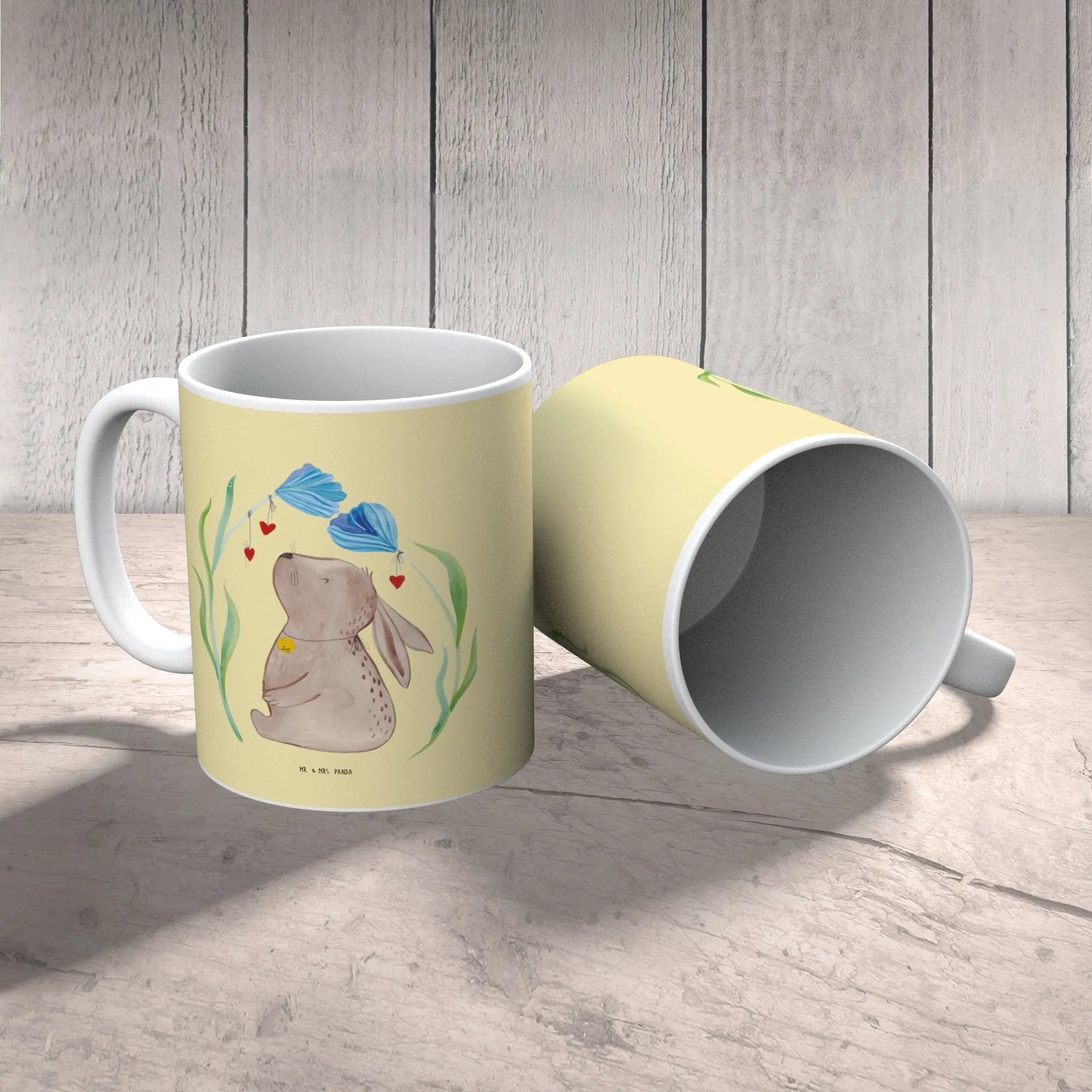 Hol dir den Frühling ins Herz! Die Tasse „Hase Blume“ aus der liebevollen Ostern - Kollektion von Mr. & Mrs. Panda zaubert dir ein Lächeln ins Gesicht. 🐰🌼 Ein süßer Hase sitzt zwischen großen Blumen und trägt ein Glöckchen um den Hals. Glöckchenklingelnd hüpft Hase Blume durch die bunten Blumenwiesen. Dieses Motiv bringt Fröhlichkeit, Hoffnung und kindliche Neugier in deinen Alltag.