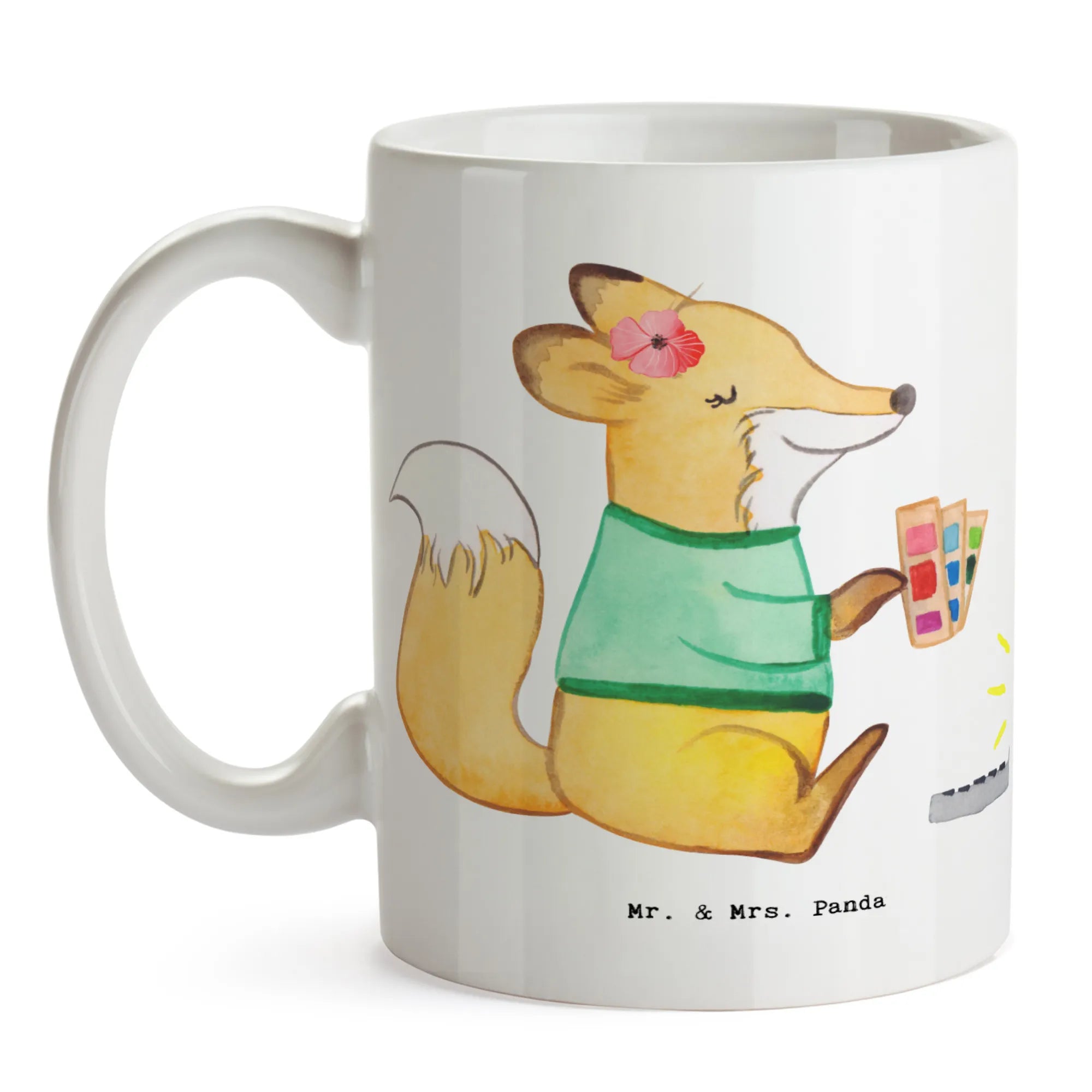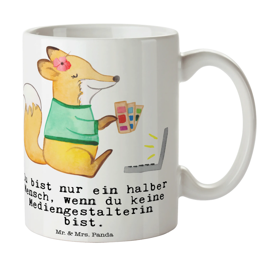 Made of high-quality ceramics, this mug holds up to 325 ml (11 oz) of your favorite beverage, making it a stylish companion through those long working hours. With a charming motif of a sweet little fox sitting before a laptop, color swatches in hand, this mug captures the essence of creativity and design.