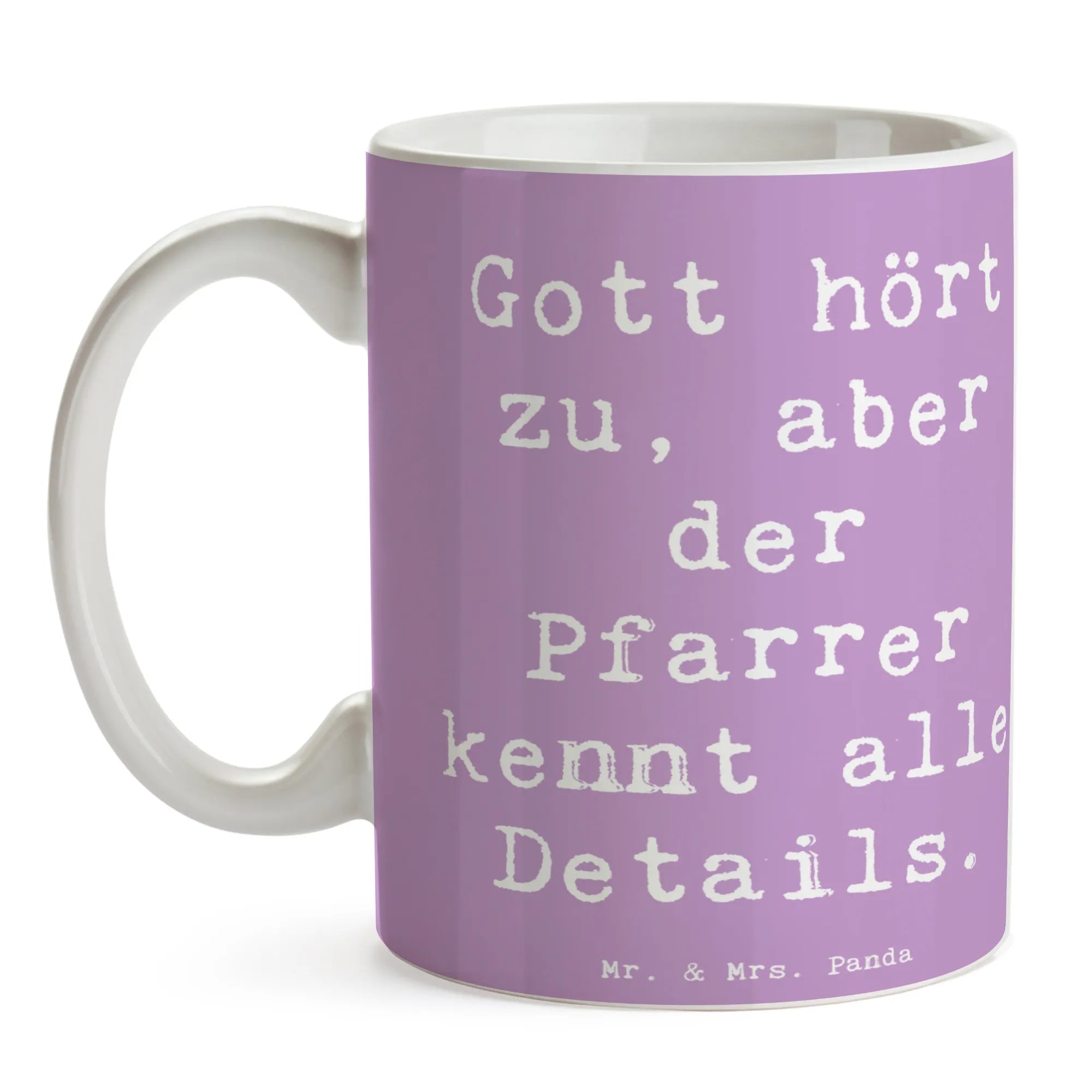 Mug Saying Gott hört zu, aber der Pfarrer kennt alle Details. - Lavender Dream