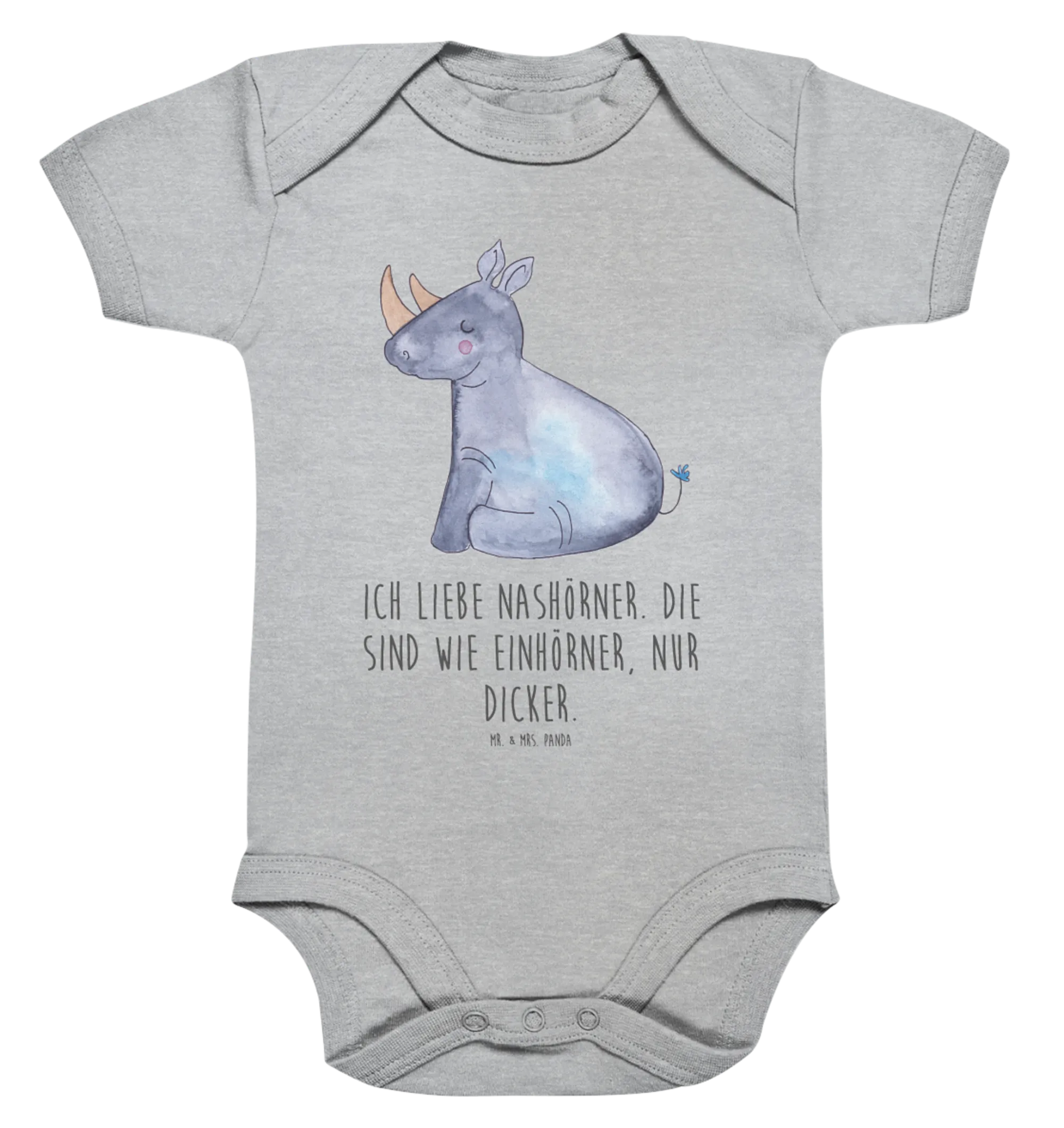 As part of the Unicorn - Collection, each piece is designed and hand-drawn by Mrs. Panda from Hanover, Germany, making every motif a unique work of art. The beautiful heather grey background adds a subtle touch, making it versatile for both boys and girls. This collection focuses on spreading joy and good vibes with its colorful designs and lively themes, and the Unicorn Rhino is no exception!