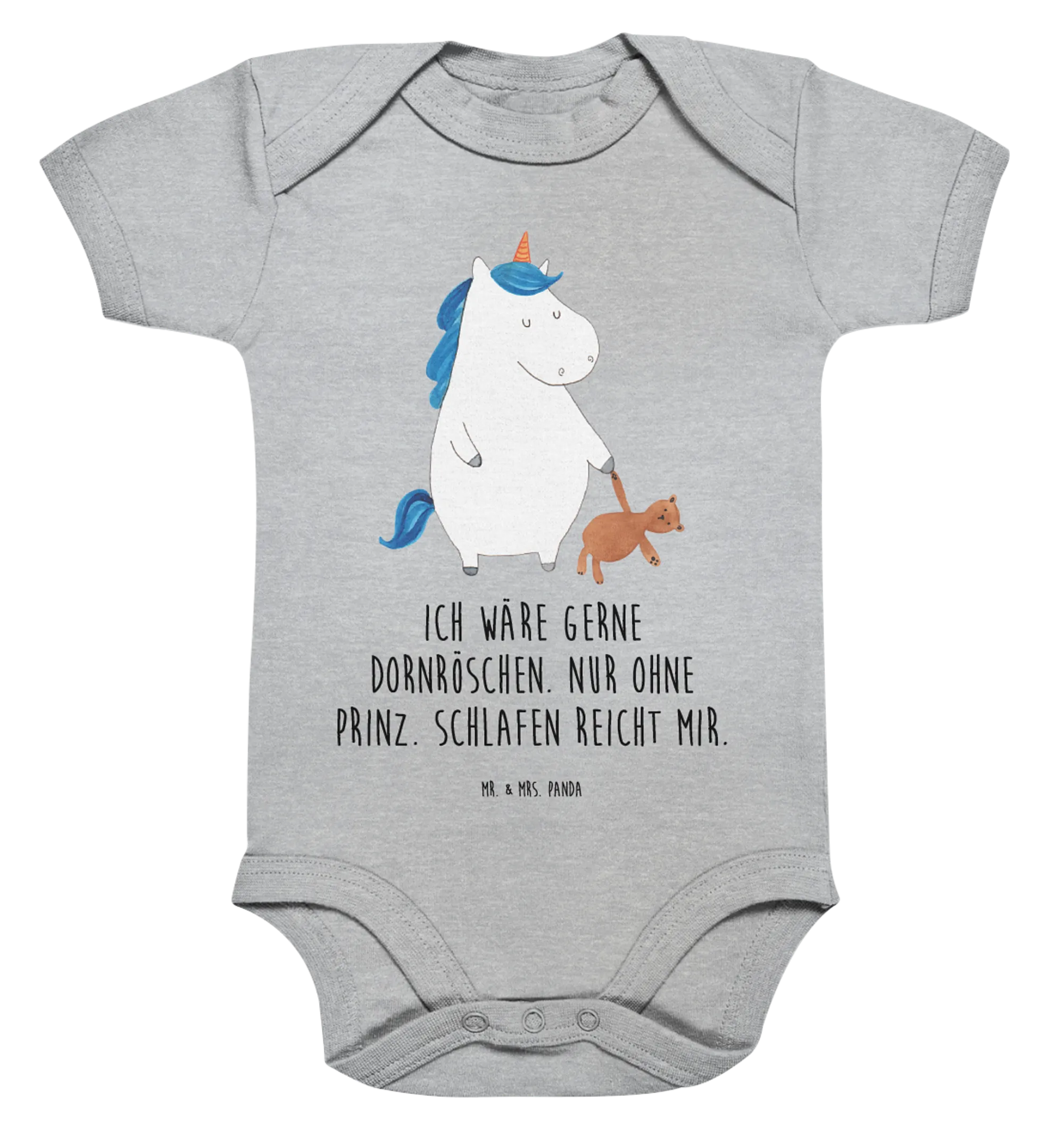 Imagine your baby snuggled up in this charming outfit featuring a sweet, slumbering unicorn clutching a teddy bear—truly heart-melting! The Unicorn Teddy is hand-drawn with love by Mrs. Panda, featuring beautiful watercolor designs created right in the heart of Northern Germany. Each piece is crafted with care, making it not just clothing, but a wonderful memory to cherish.