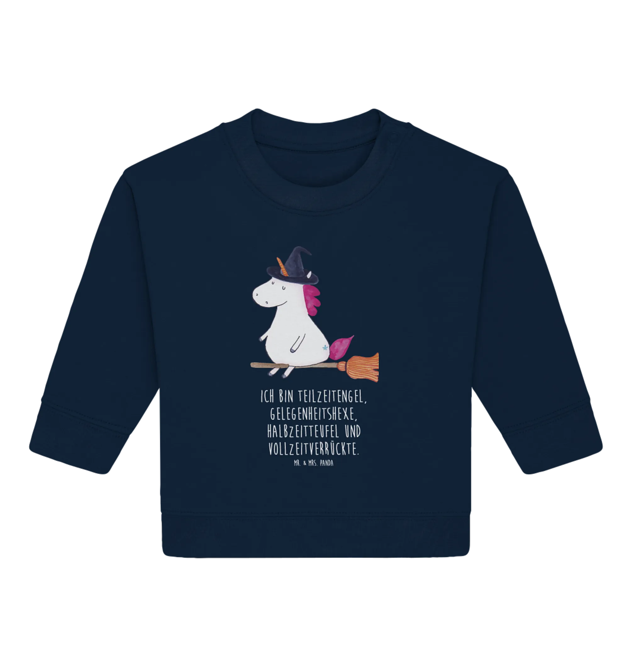 The charming design depicts a cute unicorn on a broomstick, wearing a witch hat, embodying the delightful essence of imagination and fun. Every detail of the Unicorn Witch is lovingly hand-drawn by Mrs. Panda in her studio in Hanover, Germany, ensuring that your child will wear a unique piece of art.