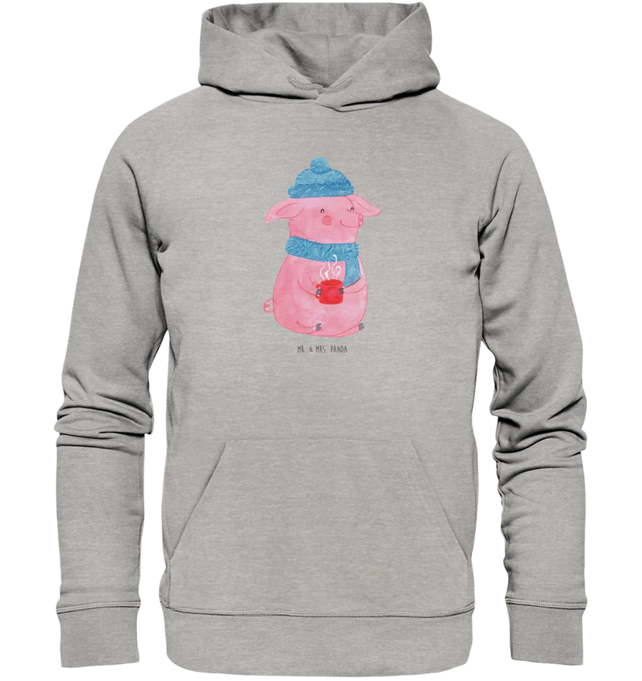 Crafted from wonderfully soft organic cotton, this hoodie is designed for both men and women, ensuring that everyone can enjoy its comfy embrace. The delightful motif showcases a joyous pink pig dressed warmly in a blue hat and matching scarf, holding a steaming cup of mulled wine — a cheerful companion for any festive occasion.