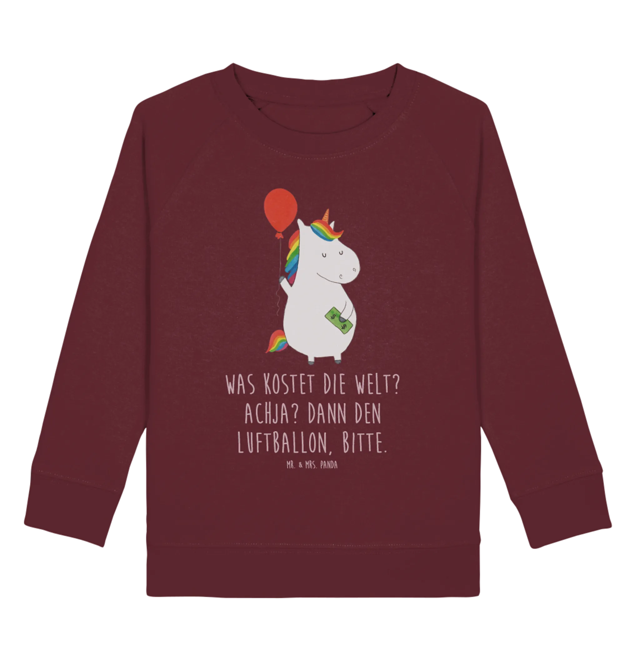 Der Organic Kinder Pullover mit dem süßen Einhorn Luftballon aus der Einhorn-Kollektion ist das perfekte Geschenk für kleine Einhorn-Fans und macht jedes Kind glücklich! Handgezeichnet von Mrs. Panda, verkörpert dieses liebevoll gestaltete Design Lebensfreude und die Begeisterung für die magische Welt der Einhörner. Das fröhliche Einhorn hält einen Luftballon in der einen Hand und ein paar Geldscheine in der anderen, was für Kinder eine spielerische Art darstellt, Träume und Wünsche auszudrücken. Der Slogan „Was kostet die Welt? Achja? Dann den Luftballon, bitte.” macht den Pullover zu einem lustigen Highlight, das sowohl Jungen als auch Mädchen begeistert.