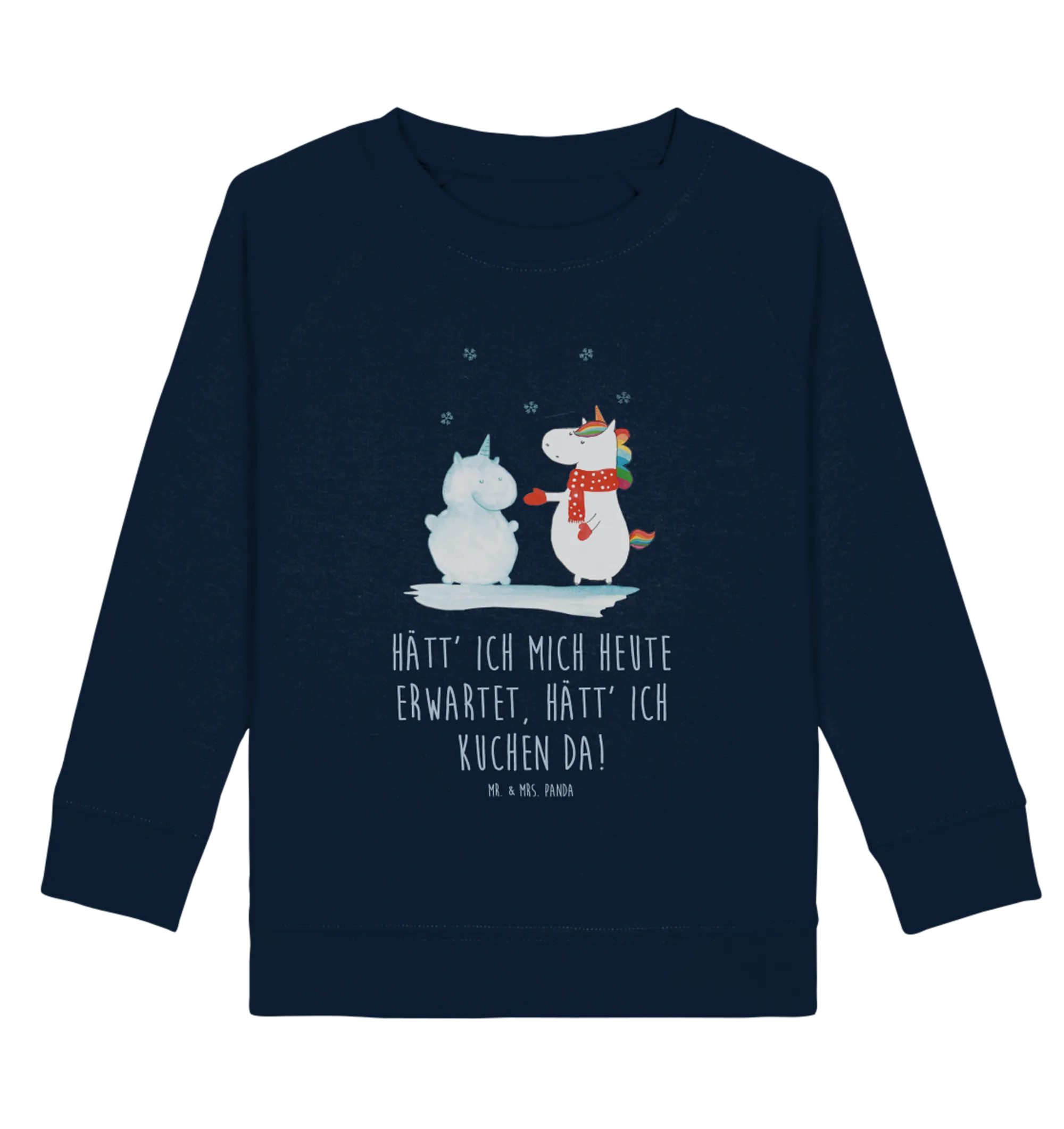 Der Organic Kinder Pullover mit dem zauberhaften Einhorn Schneemann Motiv aus der Einhorn-Kollektion ist das perfekte Geschenk für kleine Einhorn-Fans. Voller Liebe handgezeichnet von Mrs. Panda, versprüht dieses Design eine magische Winterstimmung. Die Kombination aus einem süßen Einhorn, das einen Schneemann baut, und dem spielerischen Spruch „Hätt‘ ich mich heute erwartet, hätt‘ ich Kuchen da!“ macht den Pullover einfach unwiderstehlich!