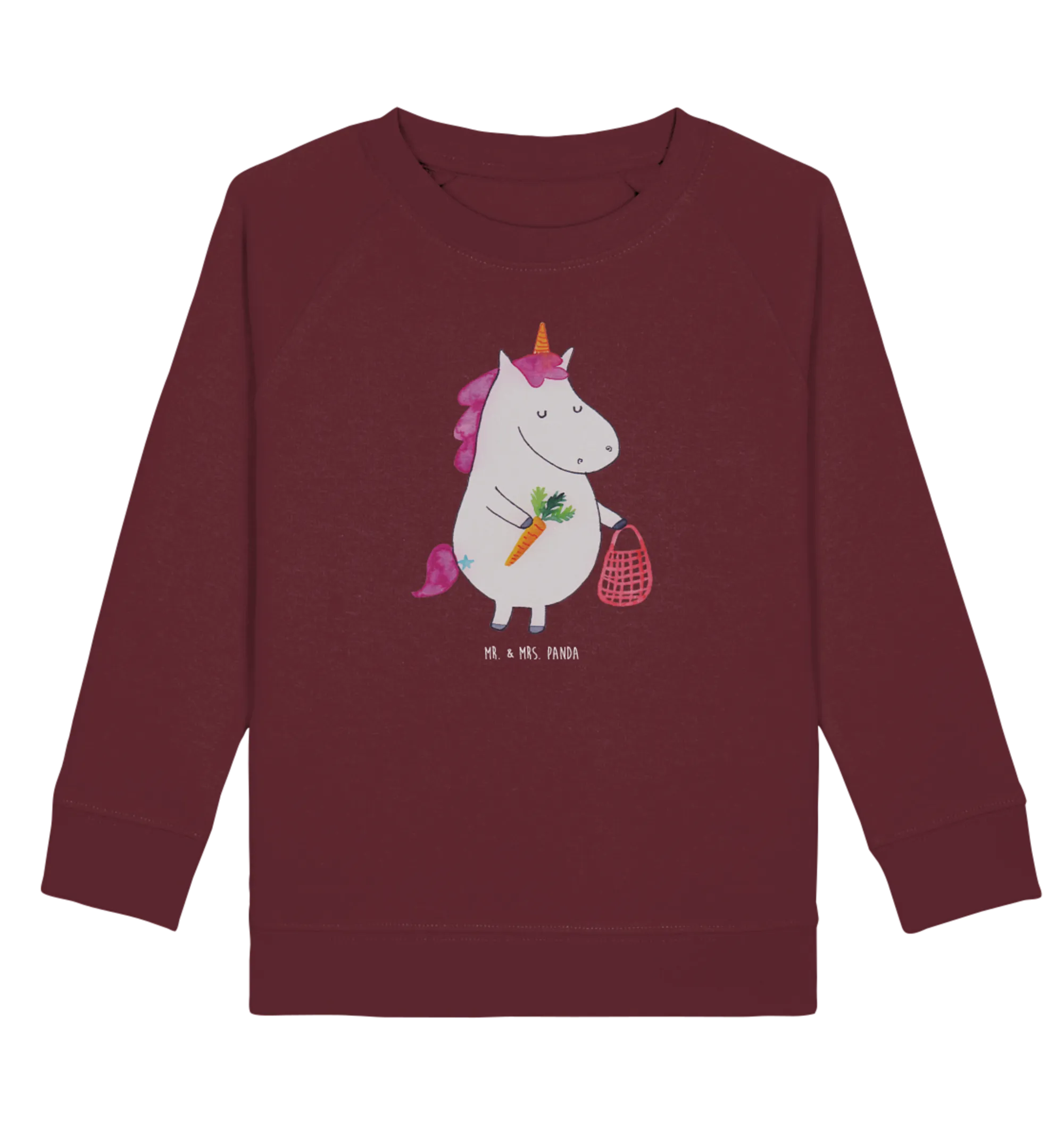 Der burgunderfarbene Hintergrund verleiht dem Pullover eine elegante Ausstrahlung, während das liebevoll gestaltete Einhorn Motiv mit einer Einkaufstasche voll veganer Leckereien ein zauberhaftes Bild abgibt.