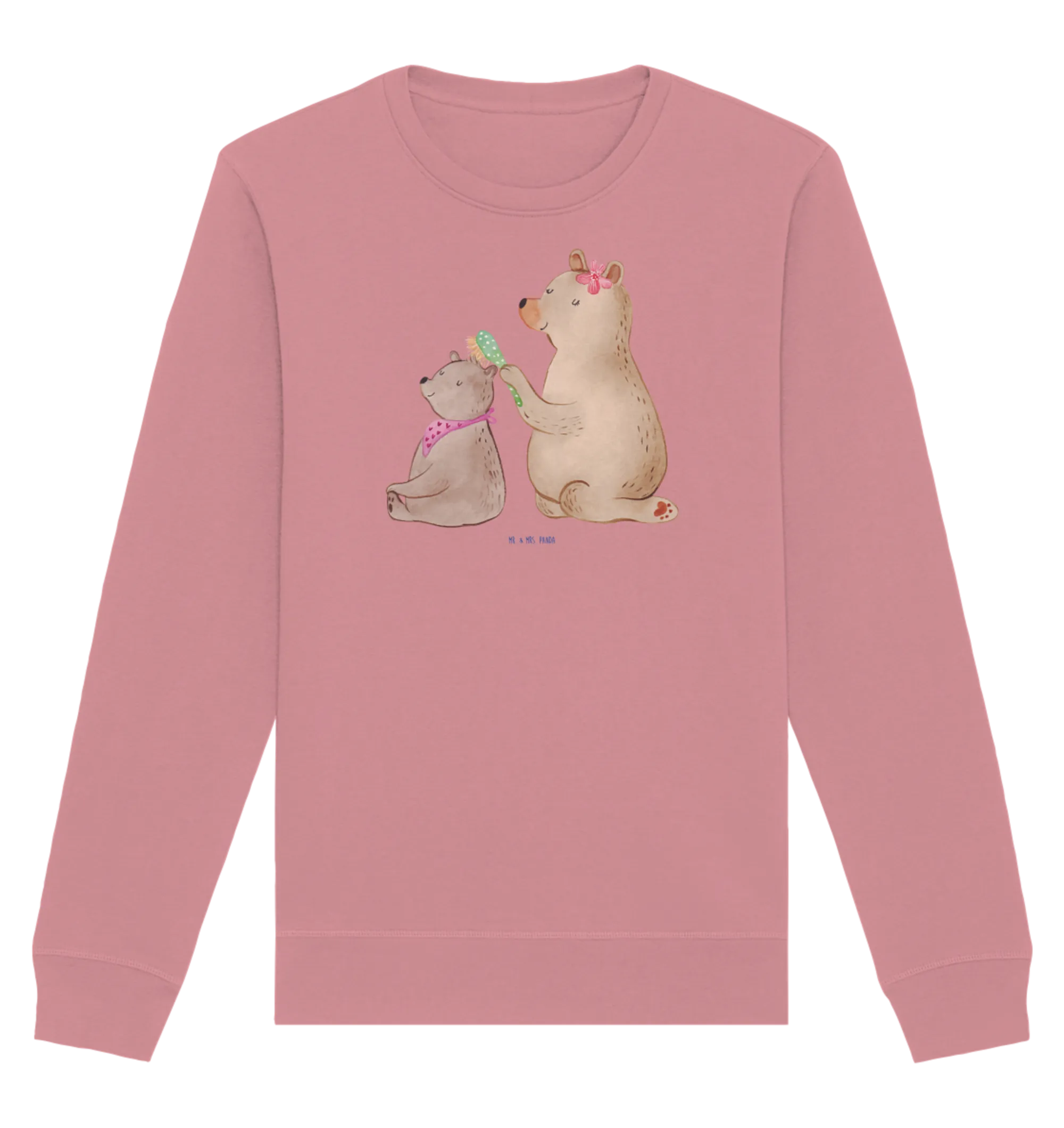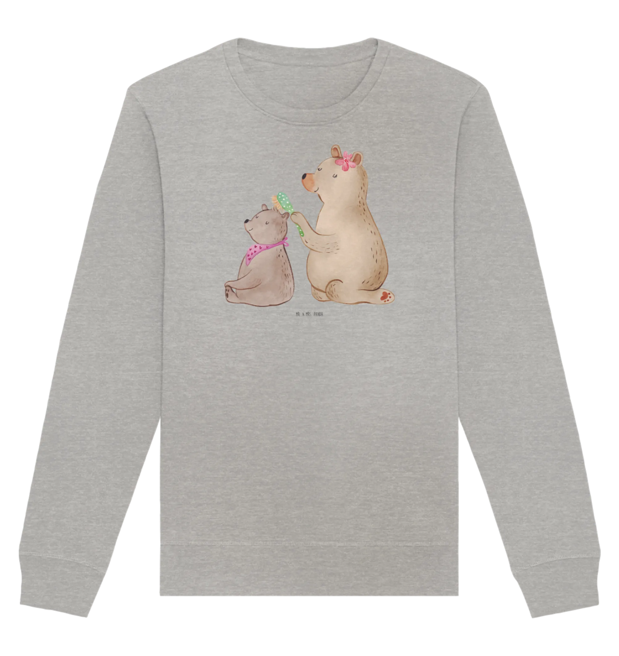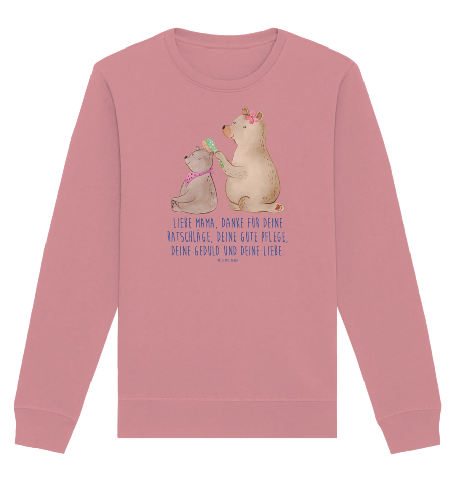 Unser Bio-Pullover aus der Familien-Kollektion von Mr. & Mrs. Panda ist mehr als ein Kleidungsstück: Er ist ein liebevolles Zeichen der Zuneigung. Das handgezeichnete Motiv zeigt einen großen Bären mit blumiger Haarspange, der liebevoll das Fell eines kleineren Bären kämmt. Dazu der warme Spruch: "Liebe Mama, danke für deine Ratschläge, deine gute Pflege, deine Geduld und deine Liebe." – perfekt als Geschenk zum Muttertag oder Geburtstag.
