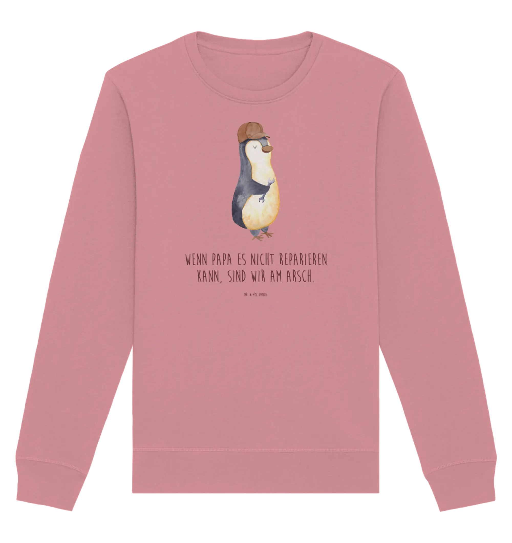 Suchst du ein Geschenk, das warm ums Herz wird und gleichzeitig nachhaltig ist? Unser Bio-Pullover mit dem frechen Spruch „Wenn Papa es nicht reparieren kann, sind wir am Arsch.“ ist genau so ein Stück. Auf dem Motiv prangt ein sympathischer Pinguin mit brauner Kappe und einem Schraubenschlüssel in der Flosse — perfekt für alle Väter, die gern anpacken.