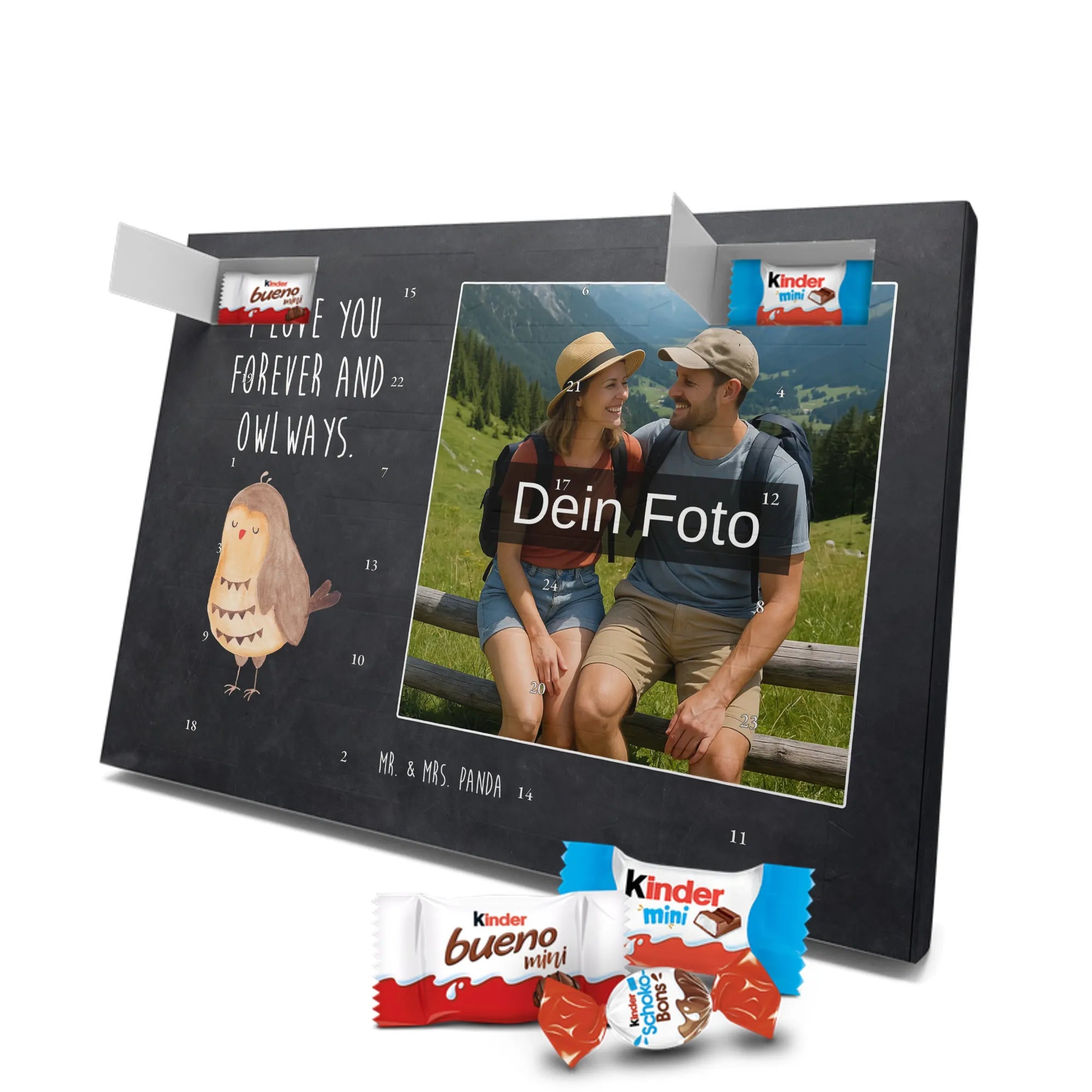 Personalisierter Schoko Foto Adventskalender von Mr. & Mrs. Panda – ein liebevoll gestaltetes Geschenk, das Vorfreude und Genuss vereint. In diesem personalisierten Schoko Foto Adventskalender kannst du dein Lieblingsfoto einsetzen und so jeden Tag im Dezember mit einem kleinen Lächeln öffnen. Der Kalender ist bedruckt mit unseren typischen Mr. & Mrs. Panda Motiven und süßen Sprüchen, die perfekt zu deinem Foto passen. Achte bitte bei der Bildauswahl auf hohe Auflösung, damit der Druck klar und brillant wird. Wähle einen passenden Bildausschnitt, damit keine wichtigen Details abgeschnitten werden. Lade nur Bilder hoch, bei denen du die Bildrechte besitzt oder die Zustimmung der abgebildeten Personen vorliegt. Die Fotos werden weder nachbearbeitet noch zugeschnitten; Rücknahme bei personalisierten Foto-Artikeln ist ausgeschlossen. Die Druckqualität ist brillant mit einer seidenmatten Oberflächenveredelung und bedruckten Seitenflächen für ein rundum schönes Erscheinungsbild. Maße: 355 mm x 245 mm x 11 mm. Praktisch: Du kannst den Adventskalender entweder aufstellen oder an die Wand hängen. Gefüllt ist der Kalender mit kinder® Schokolade – genauer: kinder® Schoko-Bons, kinder® Bueno mini und kinder® Schokolade mini. Bitte beachte: Um das beste Druckergebnis zu erzielen, lade ein hochwertiges Foto hoch und kontrolliere vor dem Bestellen den Bildausschnitt. Dieser Adventskalender ist das perfekte, persönliche Geschenk für Familie, Freunde oder für dich selbst – voller Liebe, süßer Überraschungen und dem unverwechselbaren Mr. & Mrs. Panda Charme.