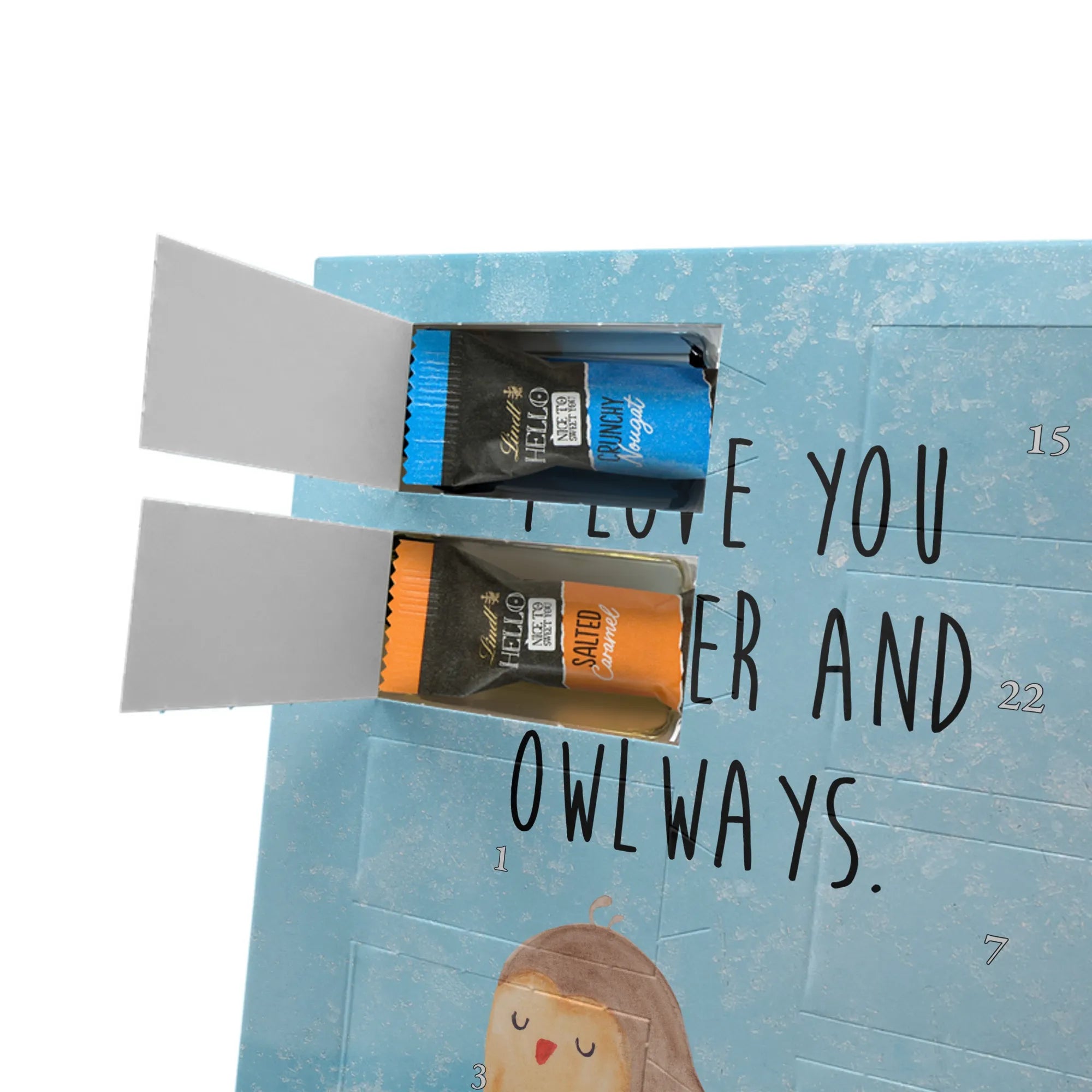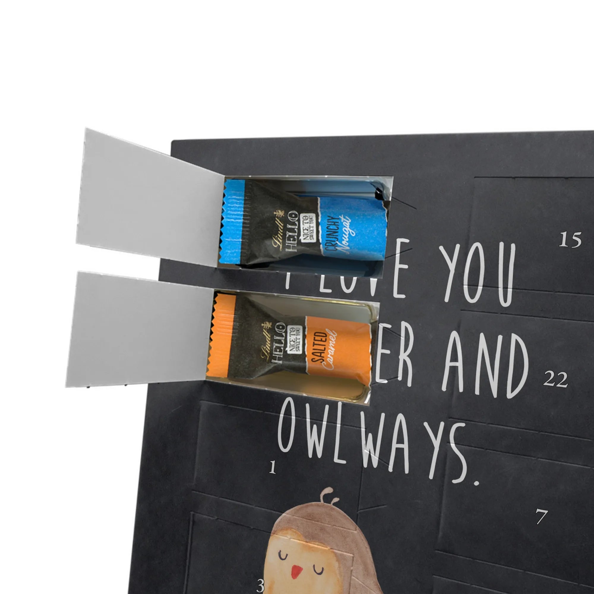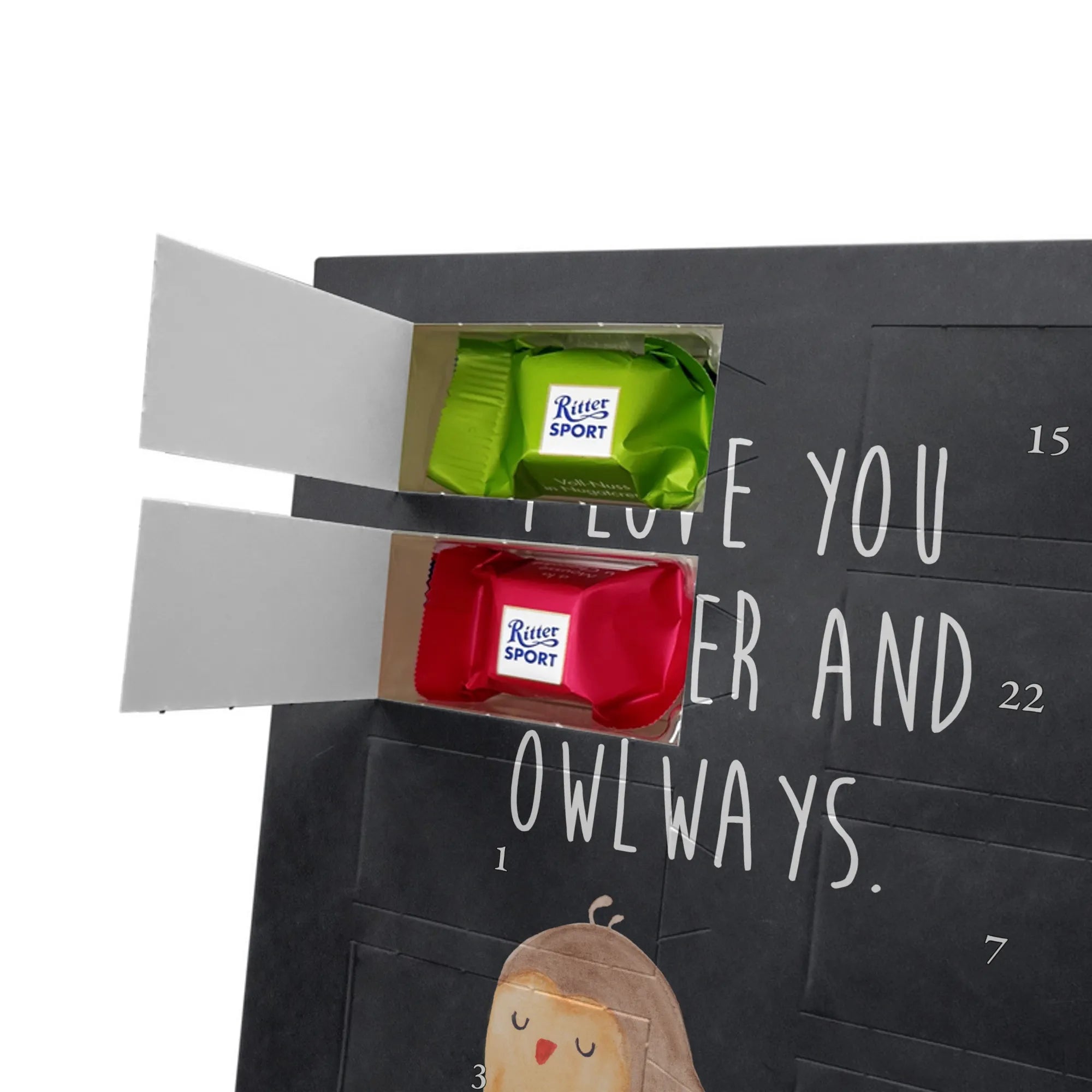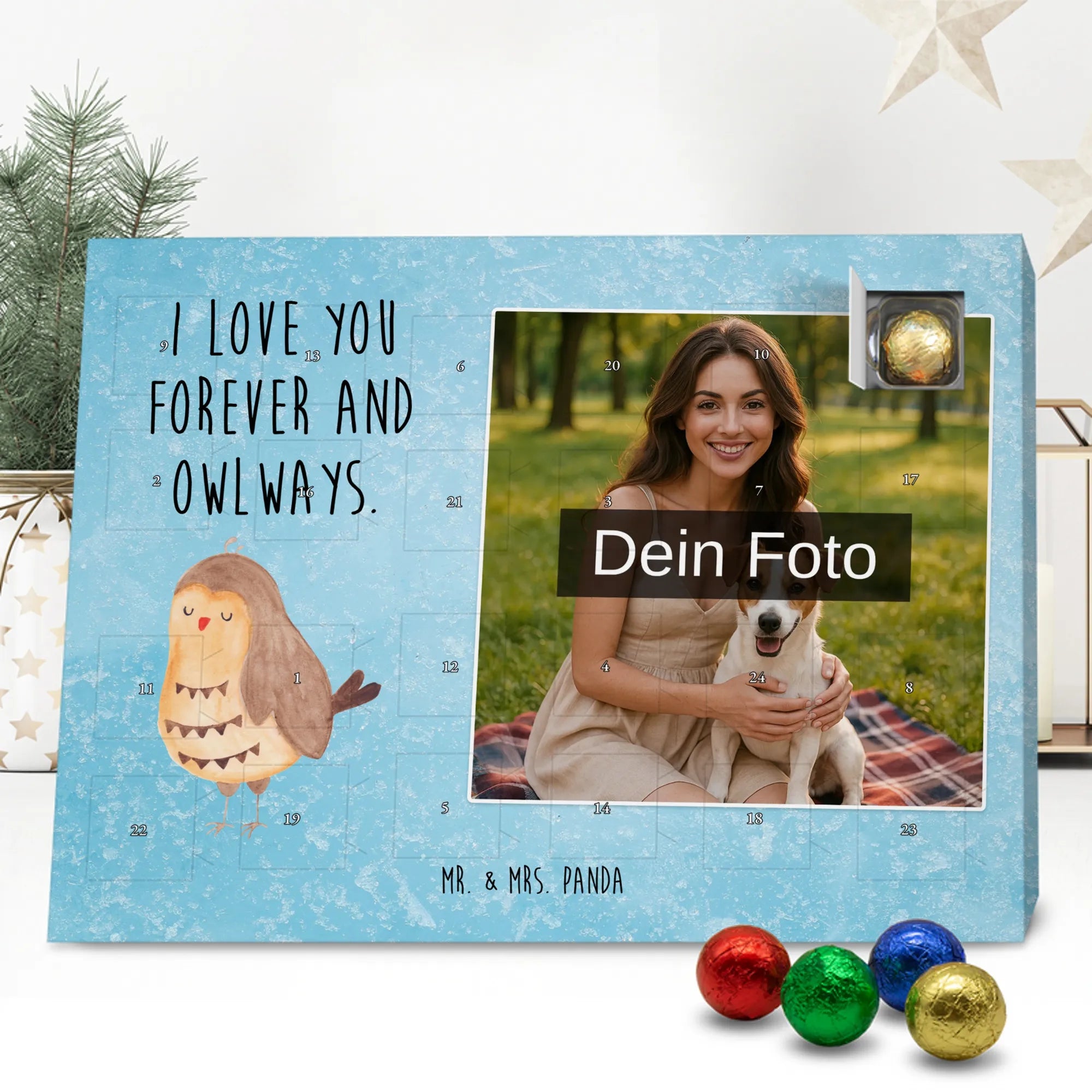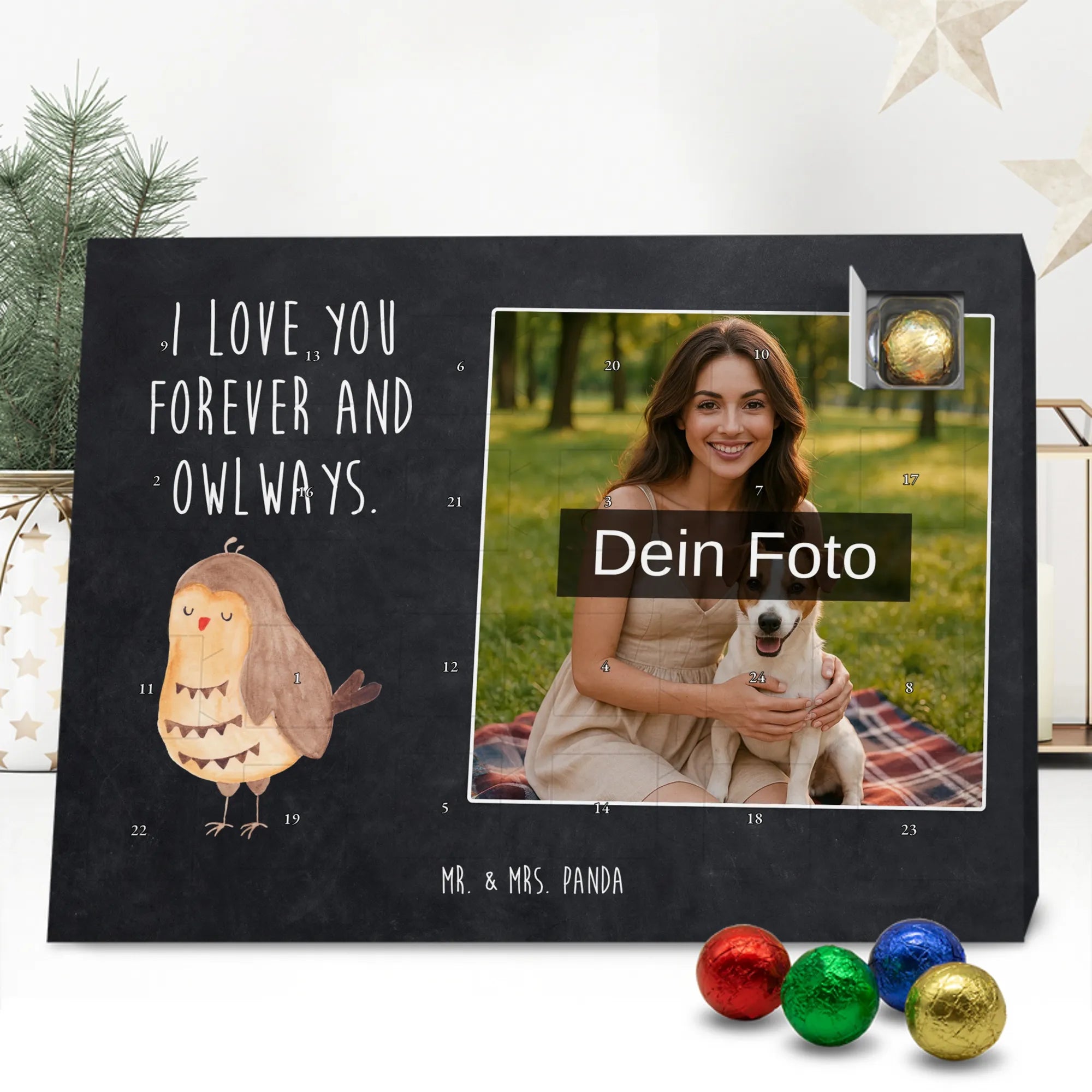 Schoko Foto Adventskalender personalisiert – ein fröhlicher Hingucker von Mr. & Mrs. Panda, der Adventszeit und Erinnerungen verbindet. Der Kalender ist bedruckt mit zauberhaften Motiven & Sprüchen von Mr. & Mrs. Panda und lässt sich ganz leicht mit einem Foto deiner Wahl personalisieren. Achtung Bildqualität: Für ein scharfes Druckbild solltest du ein Foto in hoher Auflösung verwenden. Kontrolliere den Bildausschnitt, damit wichtige Gesichter oder Details nicht verloren gehen. Verwende nur Fotos, für die du die Rechte besitzt oder die frei nutzbar sind. Bitte beachte: Die Fotos werden weder nachbearbeitet noch zugeschnitten und personalisierte Foto Artikel sind vom Umtausch ausgeschlossen. Die Verarbeitung überzeugt mit seidenmatter Oberflächenveredelung und bedruckten Seitenflächen für ein edles Finish. Maße: 325 mm x 225 mm x 27 mm. Besonderheit: Du kannst den Kalender aufhängen oder aufstellen – ganz flexibel. Gefüllt ist der Kalender mit Ritter Sport Schokowürfeln in leckeren Geschmacksrichtungen wie Mousse au Chocolat, Schoko Crisp, Voll-Nuss in Nougatcreme, Karamell Duo, Joghurt und Erdbeer-Joghurt. Ein liebevolles Geschenk, das jeden Tag im Advent versüßt.