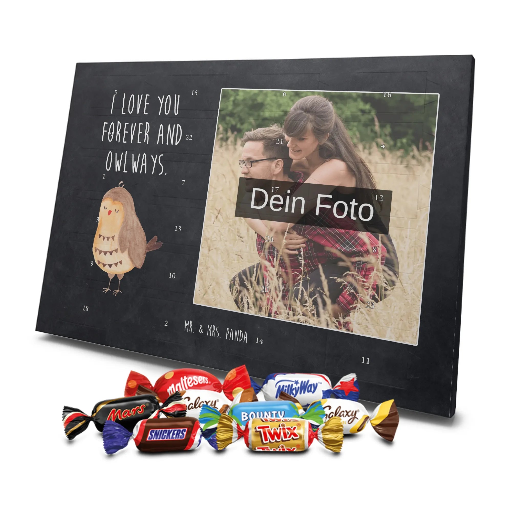 🐼 Ideales Foto-Geschenk: Personalisierter Schoko Foto Adventskalender mit Mr. & Mrs. Panda Sprüchen und deinem Bild.
