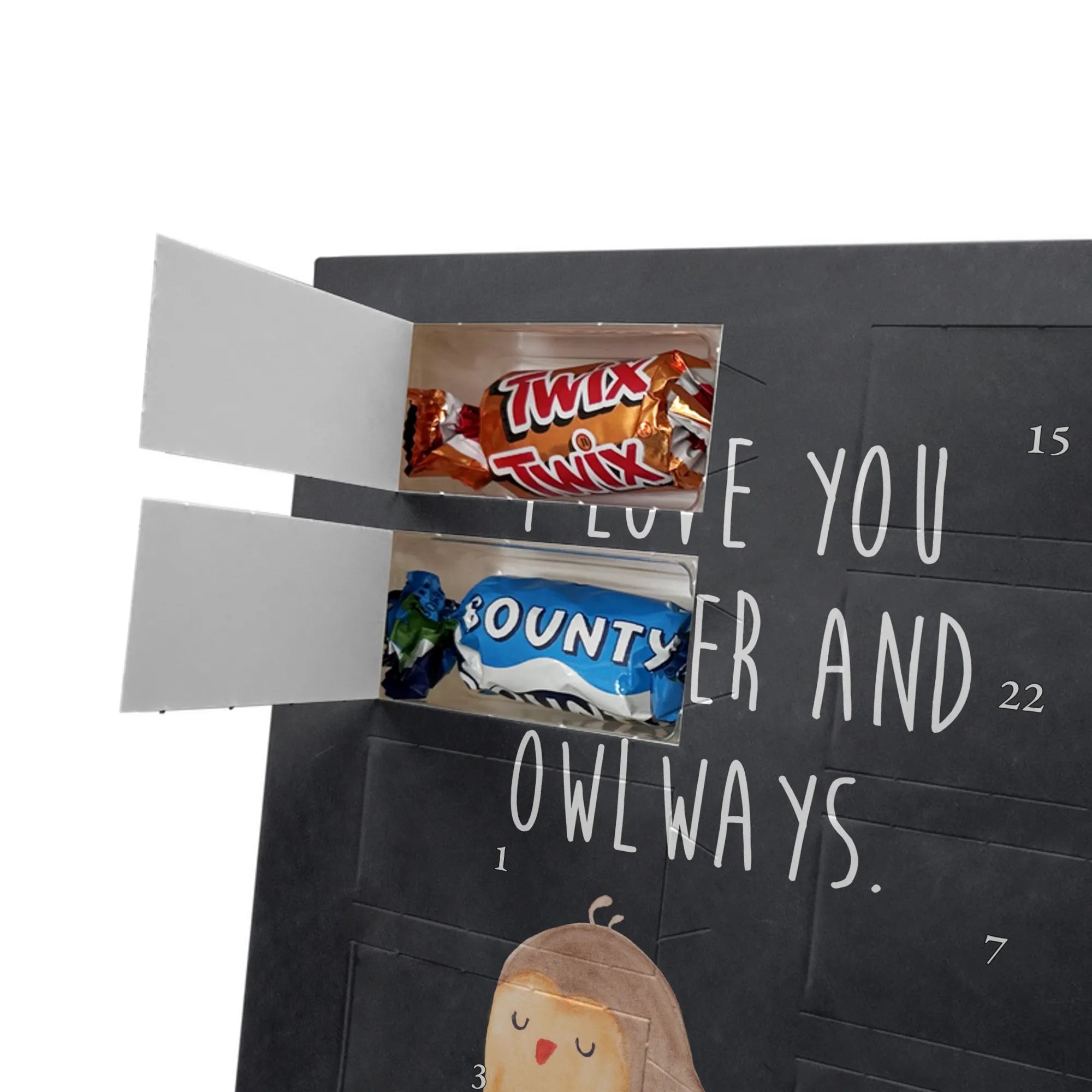 Charmanter Personalisierter Adventskalender mit Schoko-Foto von Mr. & Mrs. Panda – eine liebevolle Art, die Adventszeit zu personalisieren. Der Kalender ist mit den typischen Mr. & Mrs. Panda Motiven und herzlichen Sprüchen bedruckt; du kannst die Vorderseite mit deinem Lieblingsfoto gestalten. Achte auf eine hohe Auflösung deines Fotos, damit das Druckbild schön scharf wird, und kontrolliere den Bildausschnitt, damit keine wichtigen Details verloren gehen. Bitte lade nur Bilder hoch, für die du die Bildrechte besitzt oder eine Erlaubnis zur Nutzung vorliegt. Die Verarbeitung ist hochwertig: brillante Druckqualität, seidenmatte Oberflächenveredelung und bedruckte Seitenflächen für ein rundes Design. Maße: 325 mm x 225 mm x 27 mm. Der Kalender kann aufgehängt oder aufgestellt werden – ganz nach Belieben. Wichtig: Die Fotos werden nicht nachbearbeitet oder zugeschnitten; personalisierte Foto-Artikel sind vom Widerruf ausgenommen. Gefüllt ist der Adventskalender mit Celebrations Schokolade – 24 feine Füllungen in 8 verschiedenen Sorten (Maltesers, Mars, Snickers, Twix, Milky Way, Bounty, Galaxy, Galaxy Caramel). Ein persönliches Geschenk, das Erinnerungen und Genuss wunderbar verbindet.