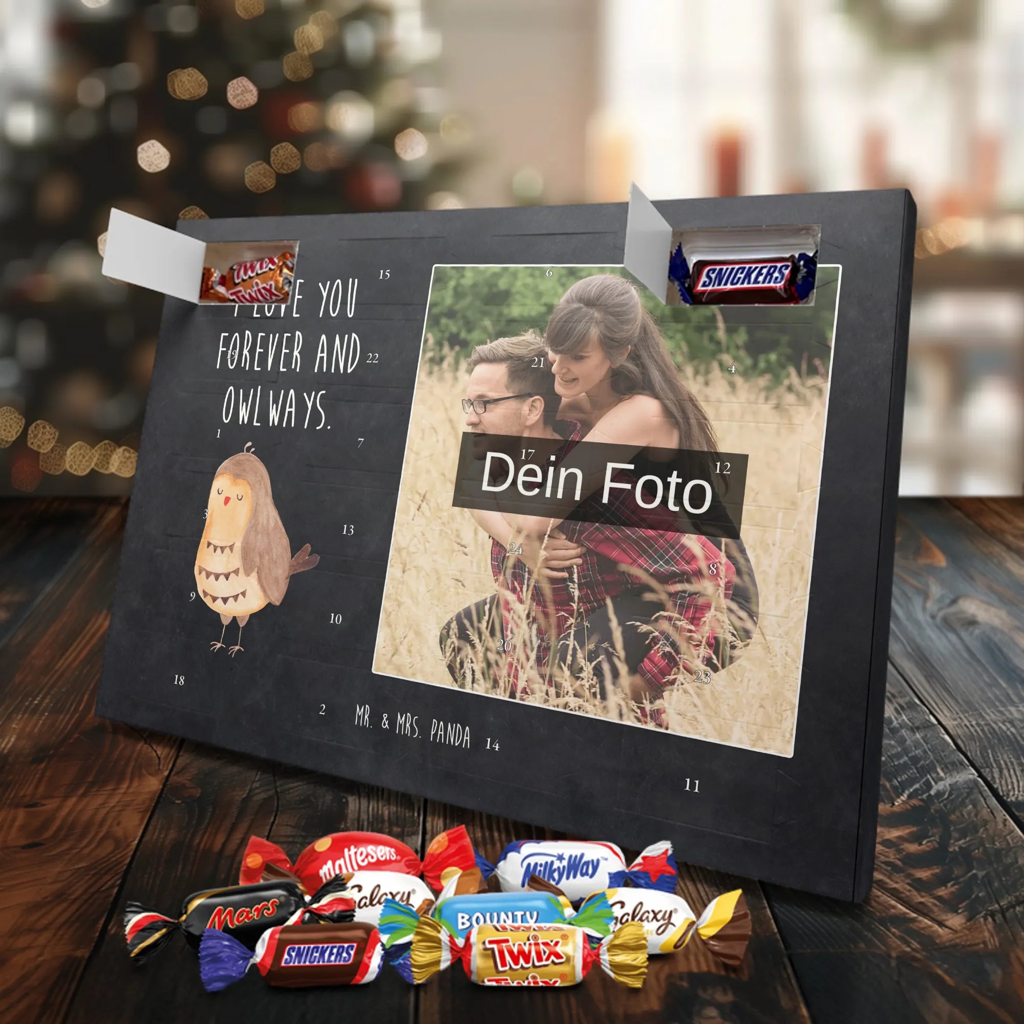 Zauberhafter Personalisierter Schoko-Foto-Adventskalender von Mr. & Mrs. Panda – das ideale Geschenk für Freunde und Familie! Der Kalender kombiniert die süße Vorfreude auf Weihnachten mit einem ganz persönlichen Foto, das du beim Bestellen hochlädst. Unsere Designs und liebevollen Sprüche von Mr. & Mrs. Panda zieren jede Seite. Achte darauf, ein Foto mit hoher Auflösung zu verwenden, damit das Druckbild klar und detailreich bleibt. Prüfe den Bildausschnitt, damit Gesichter und wichtige Details nicht abgeschnitten werden. Lade nur Bilder hoch, bei denen du die Rechte besitzt oder die Erlaubnis zur Nutzung hast. Die Drucke sind brillant mit seidenmatter Veredelung, auch die Seitenflächen sind bedruckt und geben dem Kalender ein hochwertiges Finish. Maße: 325 mm x 225 mm x 27 mm. Du kannst den Kalender aufhängen oder dekorativ aufstellen – beides möglich. Wichtiger Hinweis: Fotos werden nicht nachbearbeitet oder zugeschnitten; personalisierte Artikel sind vom Widerruf ausgeschlossen. Gefüllt ist der Kalender mit Celebrations Schokolade: 24 leckere Überraschungen in 8 Sorten (Maltesers, Mars, Snickers, Twix, Milky Way, Bounty, Galaxy, Galaxy Caramel). Ein persönliches, liebevolles Geschenk, das Erinnerungen und Genuss verbindet.