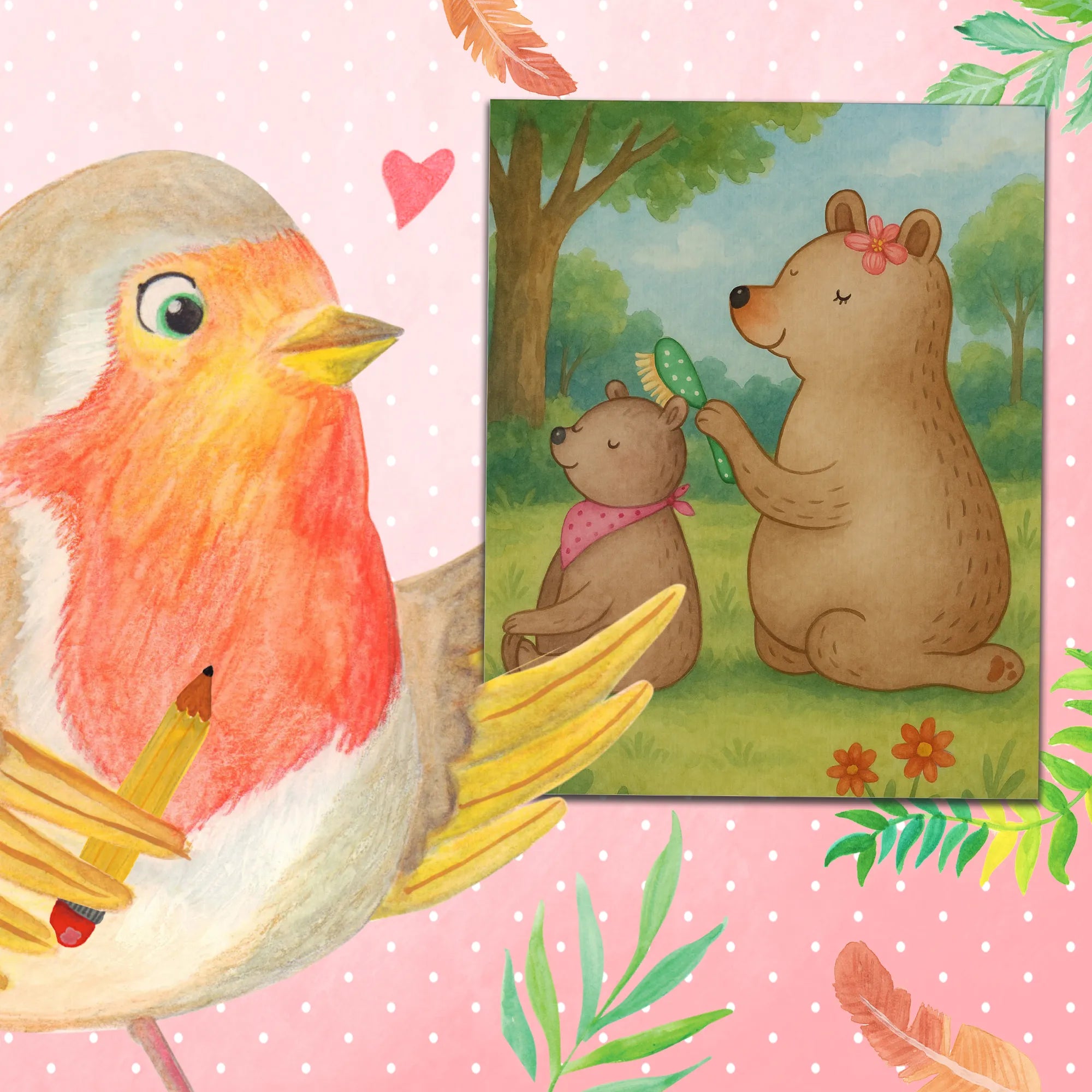 Witness a beautiful moment of love and connection as a big bear gently brushes its little one's fur. With a flower clip enhancing her charm, the mama bear creates a serene atmosphere that speaks volumes about care and tenderness. The smaller bear, with eyes closed in bliss, reminds us how special these intimate interactions are. Perfect for Mother’s Day, this motif highlights the nurturing nature of mothers and the unspoken bond that they share with their young ones. It’s an ideal way to celebrate the magic of motherhood, bringing warmth into every home. May this lovely design serve as a perfect gift to anyone celebrating the joys of parenting. Let it be a symbol of the deep-rooted love that often goes unspoken but is deeply felt. Life is composed of these little moments, and this artwork perfectly captures the essence of those shared between a parent and child.