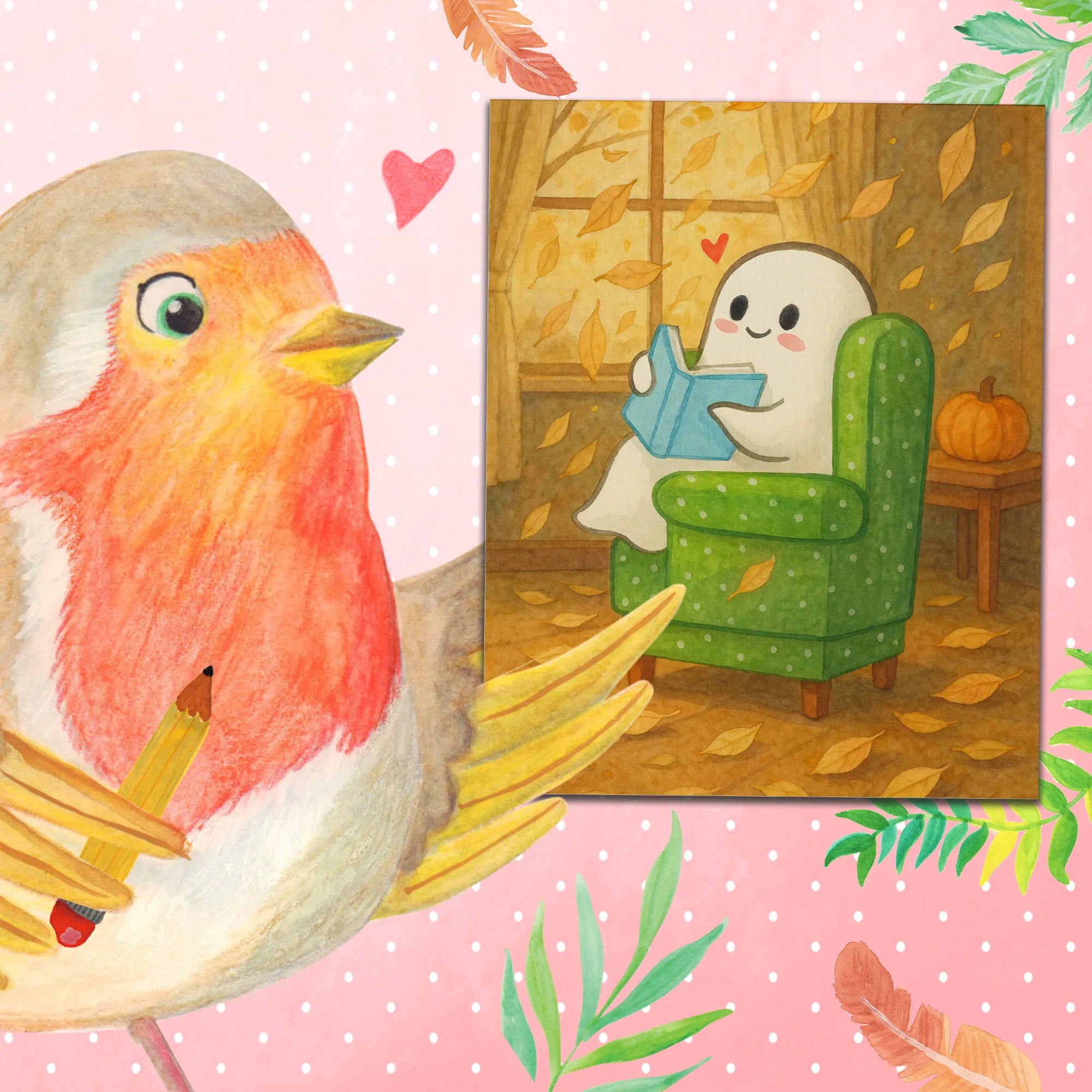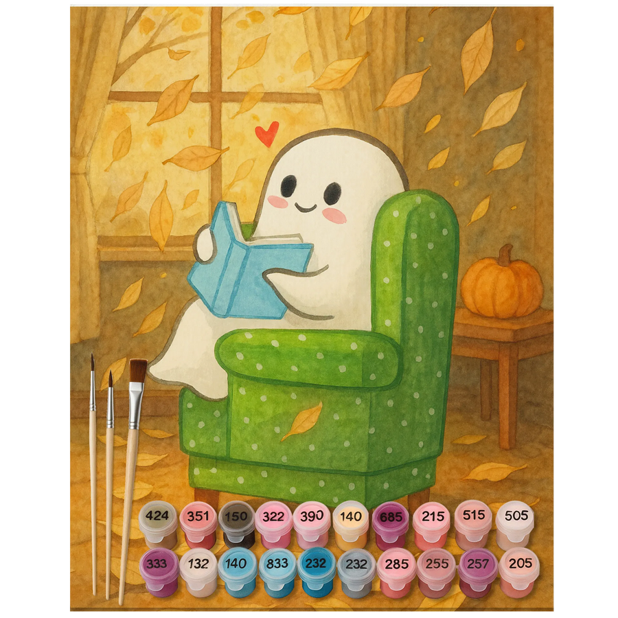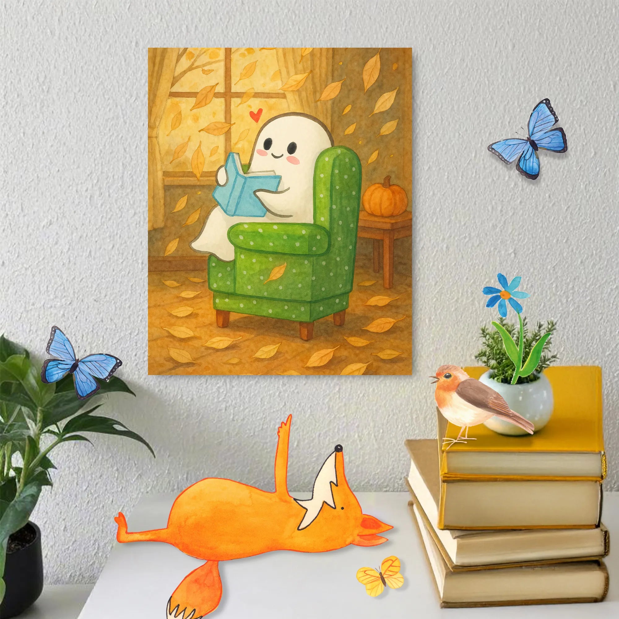 Get ready to fall in love with this cozy scene! A cheerful ghost sits contentedly in a plush green armchair, completely absorbed in its blue book. Floating autumn leaves swirl around, enhancing the magic of this moment. The ghost, sporting a delightful smile and rosy cheeks, exudes such warmth and happiness that you can't help but smile back. It’s like the embodiment of fall—a time for stories, warm drinks, and snug evenings. Perfect for bringing a little whimsical charm to your home, this motif captures the essence of enjoying life’s simple pleasures. So why not let this adorable ghost inspire your next cozy reading session?