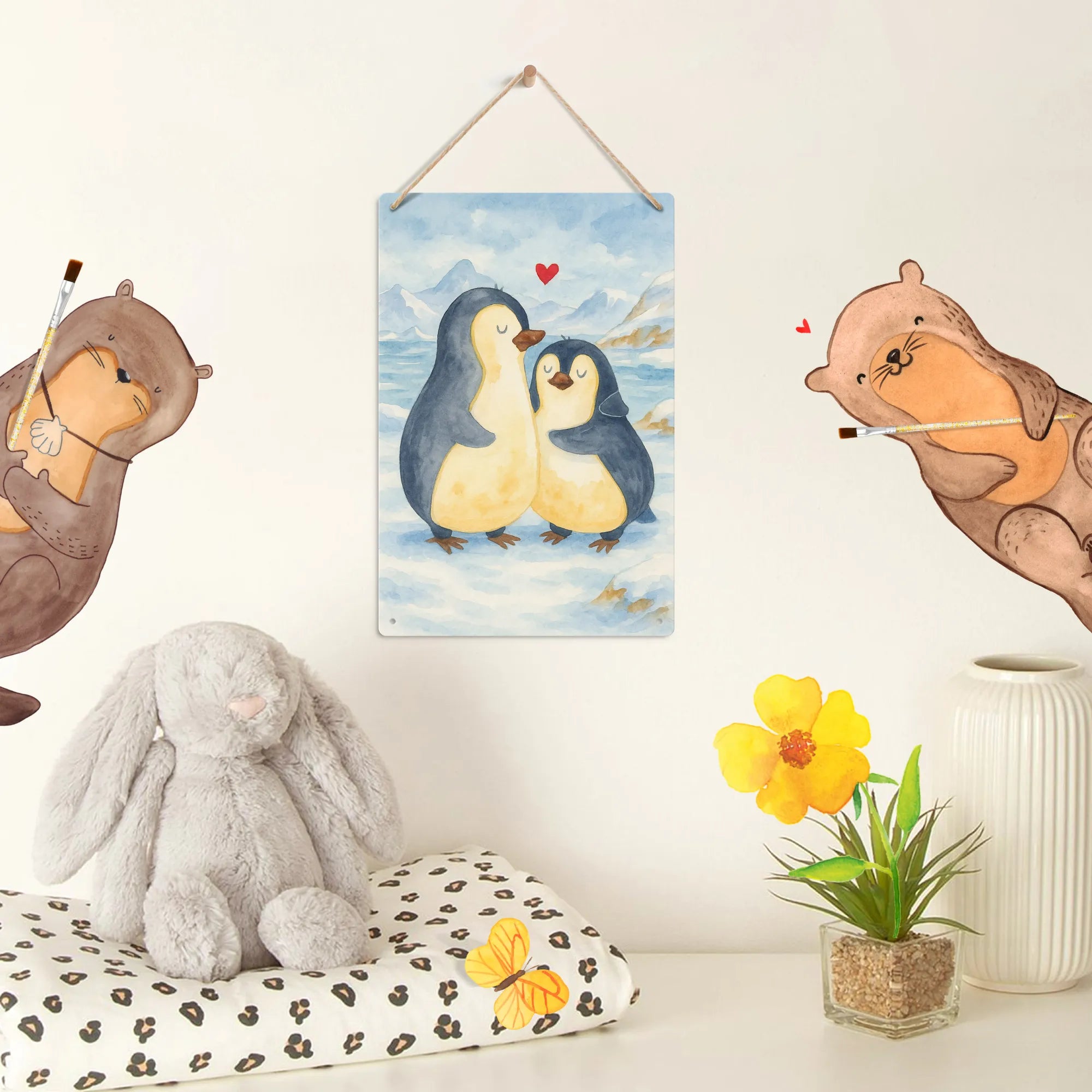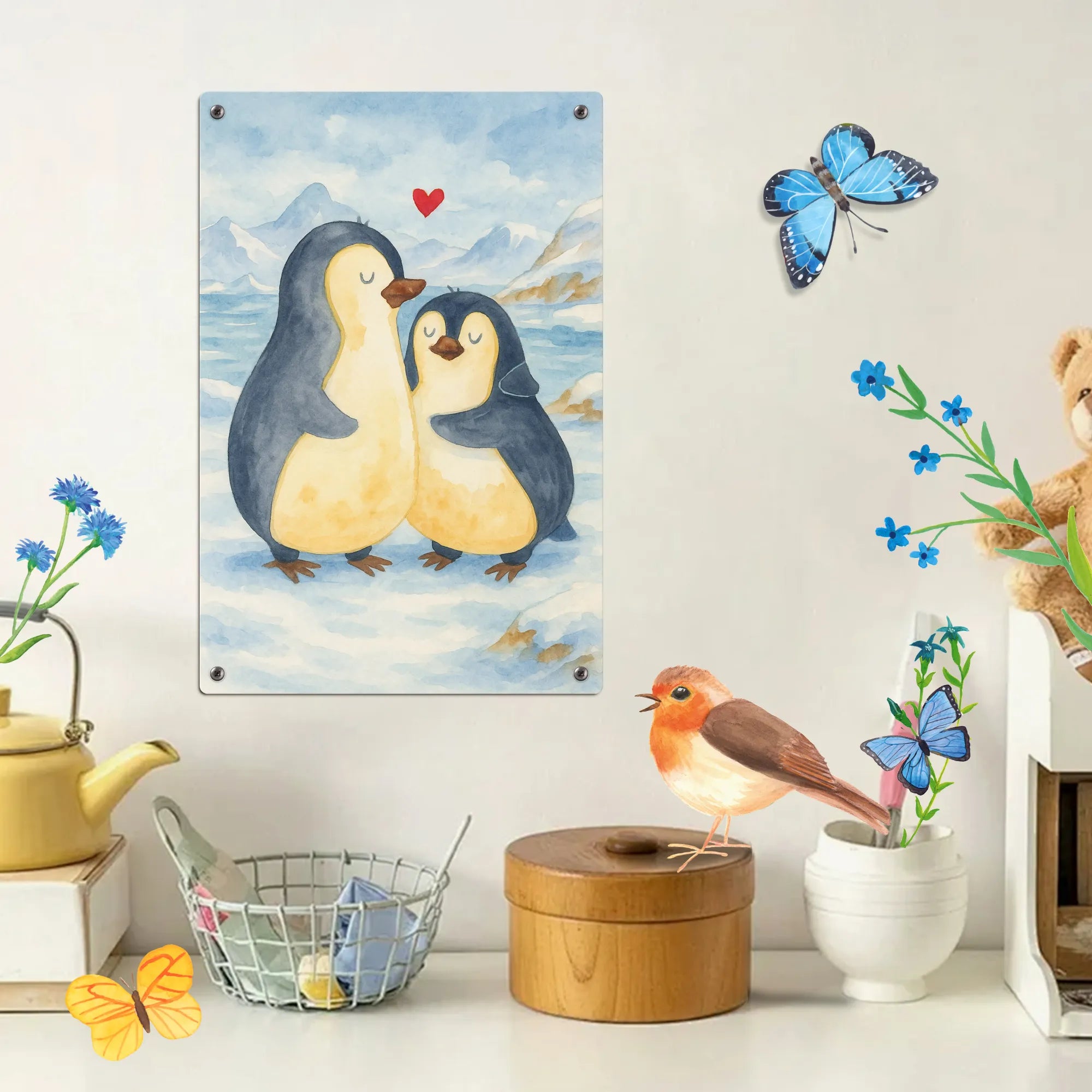In the unique artistic style of Mr. & Mrs. Panda, this 'penguin hugging' design beautifully captures the essence of love and companionship. Two penguins, inseparable and loving, stand together with one's flipper tenderly hugging the other. This motif is a gentle reminder of the love that surrounds us and the comfort we provide to those dear to our hearts. It's an impeccable choice as a love gift, or to mark a special moment like a wedding day or an anniversary. The simplicity in its depiction contrasts with the depth of its meaning – a love profound and unspoken, yet felt deeply. Each brushstroke and color used brings this lovely scene to life, making it a captivating and moving wedding gift or a proof of love to those who hold a special place in our lives.