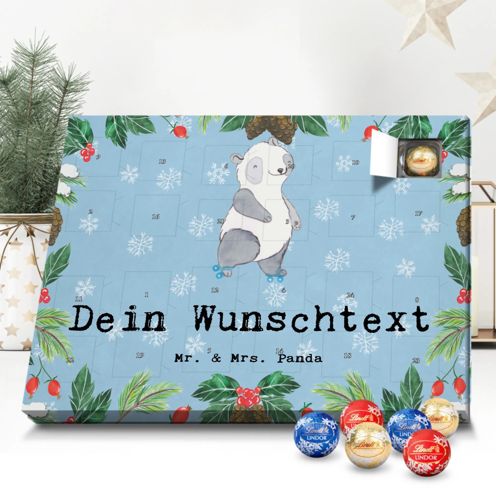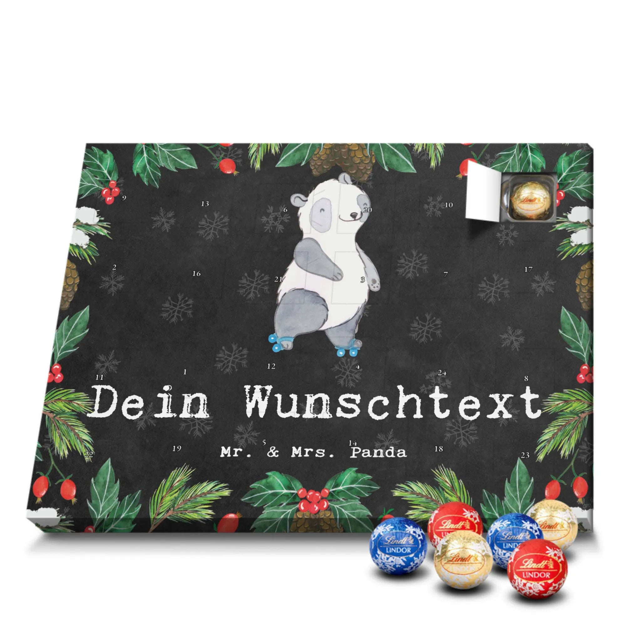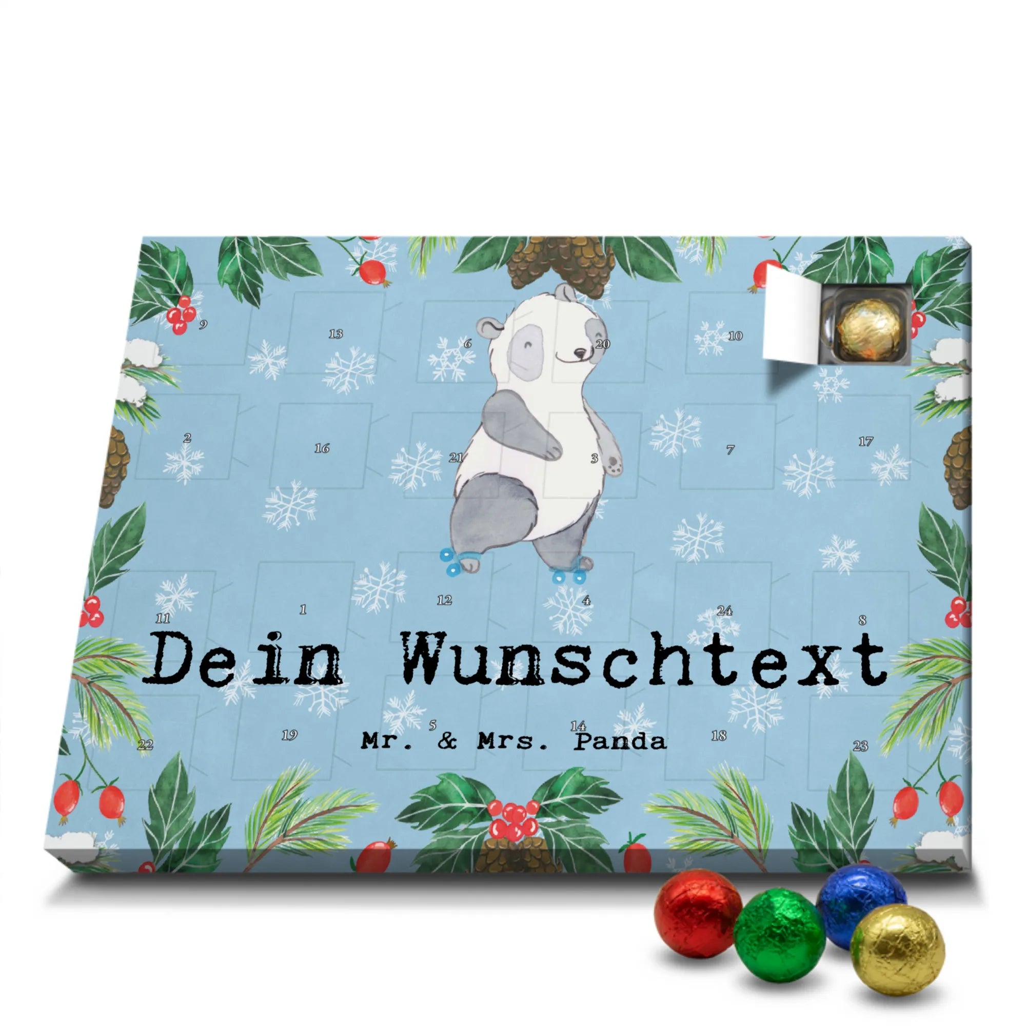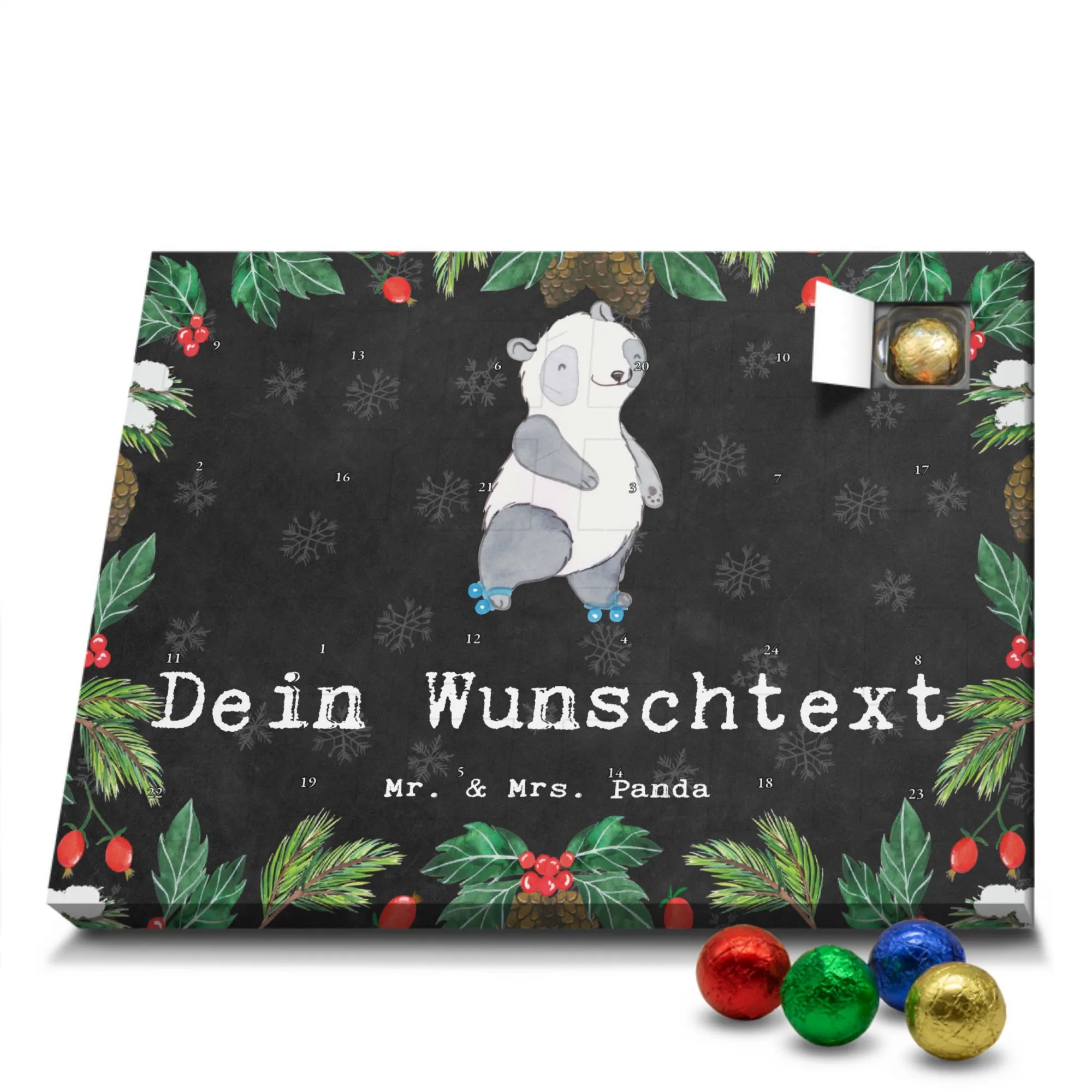 Make the Advent season even more special with the personalized chocolate Advent calendar from Mr. & Mrs. Panda. This unique Advent calendar is printed with your desired name or a custom text and features exclusive designs and sayings from the renowned designer duo. It's not only a visual highlight but also delights taste buds with 24 high-quality chocolate balls in various colors. The brilliant print quality and the silk-matte finish make this calendar a true eye-catcher during the Christmas season.