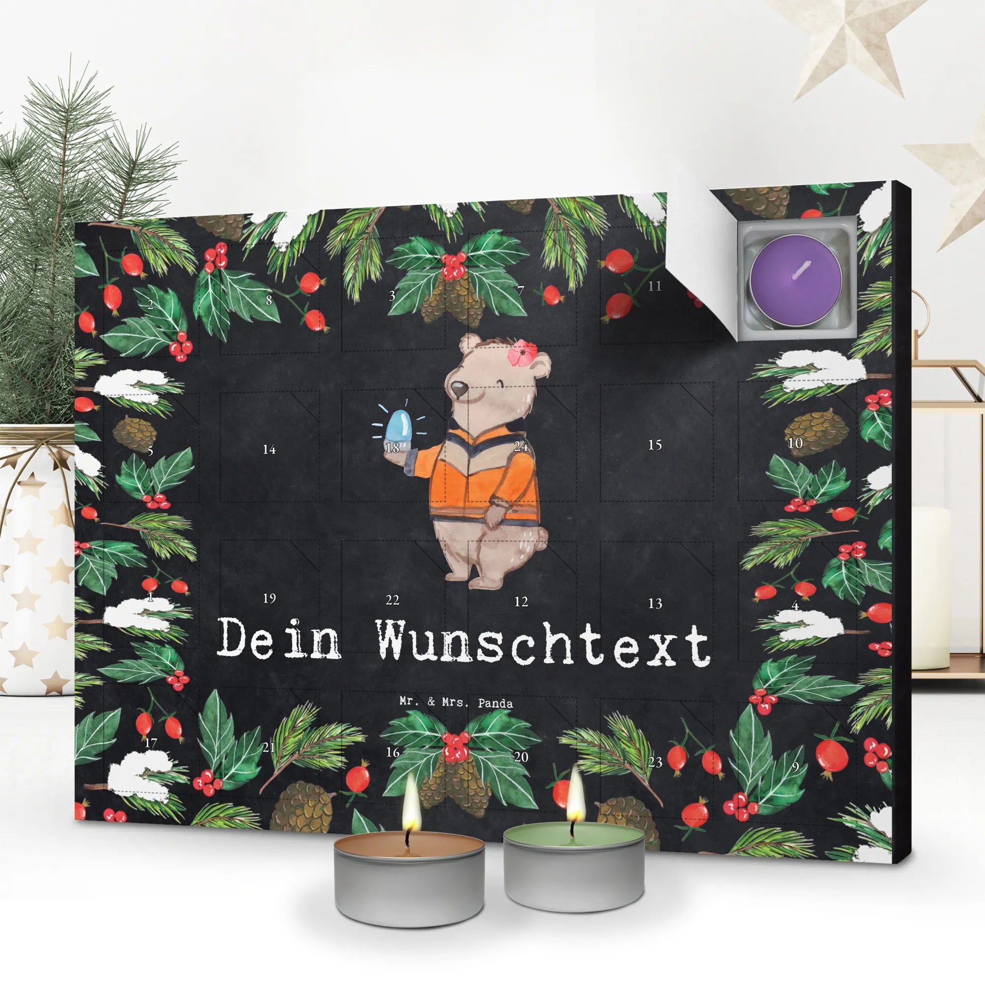 Discover the magic of the pre-Christmas season with our 'Personalized Scented Candle Advent Calendar' from Mr. & Mrs. Panda. Enchantingly adorned with beautiful quotes and motifs, this unique Advent calendar can be personalized with a message or name of your choice. Be captivated by Mrs. Panda's charming drawings on the front and a new festive scent behind every door, including vanilla, lavender, and apple-cinnamon. A sturdy box that can be hung up or displayed completes the experience.