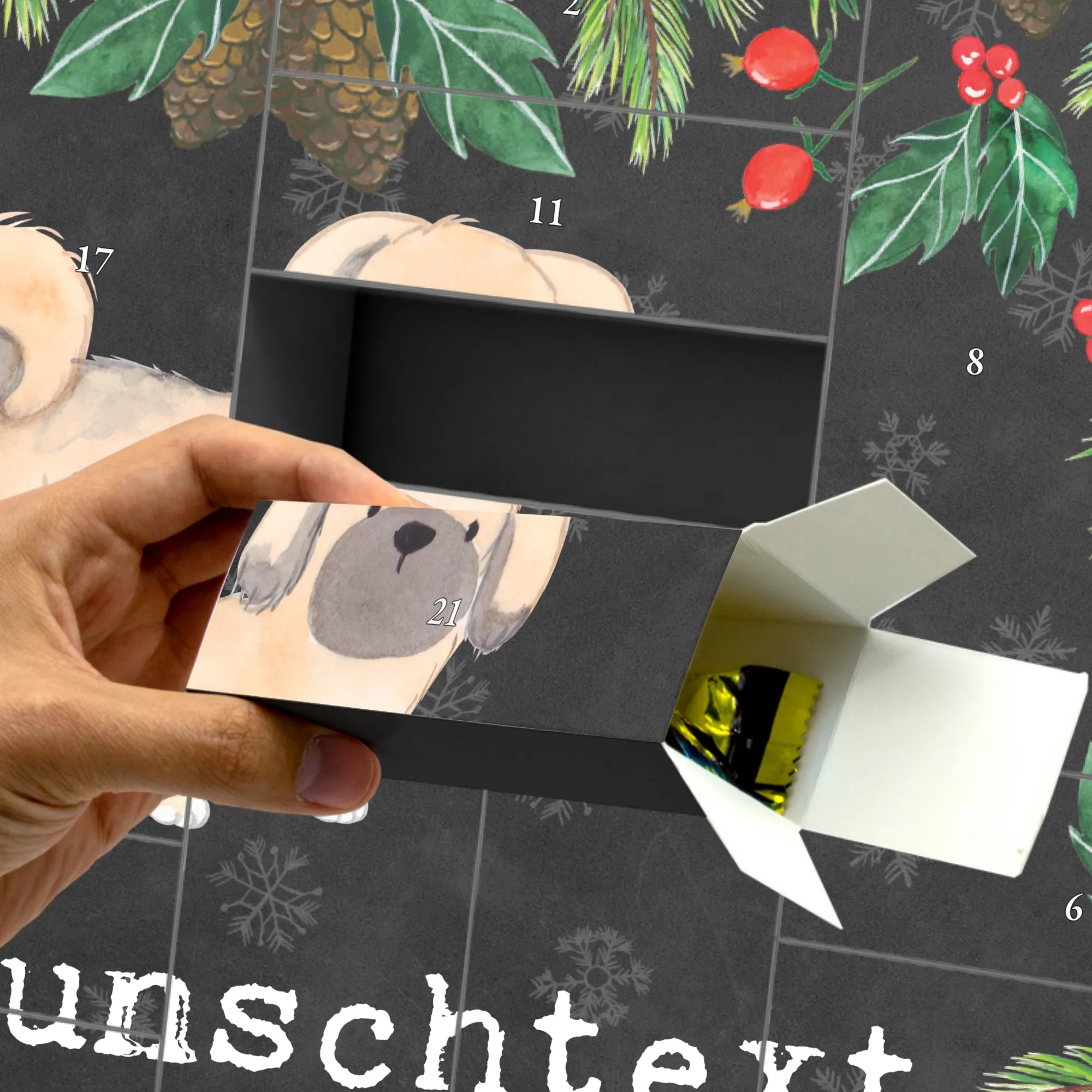 Adventskalender mit Namen – personalisiert und wunderbar gestaltet von Mr. & Mrs. Panda. Dieser Kalender ist ideal, wenn du jemandem eine ganz persönliche Freude machen willst: Wir bedrucken ihn mit deinem Wunschnamen oder Wunschtext und verzieren die Vorderseite mit einer liebenswerten Illustration von Mrs. Panda. Der robuste Adventskalender Karton sorgt für Stabilität, die seidenmatte Oberfläche und die brillante Druckqualität für ein edles Erscheinungsbild. Er enthält 24 Schachteln zum Selbstbefüllen, perfekt für kleine Geschenke, Notizen oder Süßes. Die integrierte Aufstellvorrichtung macht das Dekorieren ganz einfach. Bitte beachte: wird ohne Füllung geliefert. Maße: Breite: 619 mm, Höhe: 405 mm, Tiefe: 50 mm. Ein persönliches Geschenk mit viel Herz – genau im Mr. & Mrs. Panda Stil.