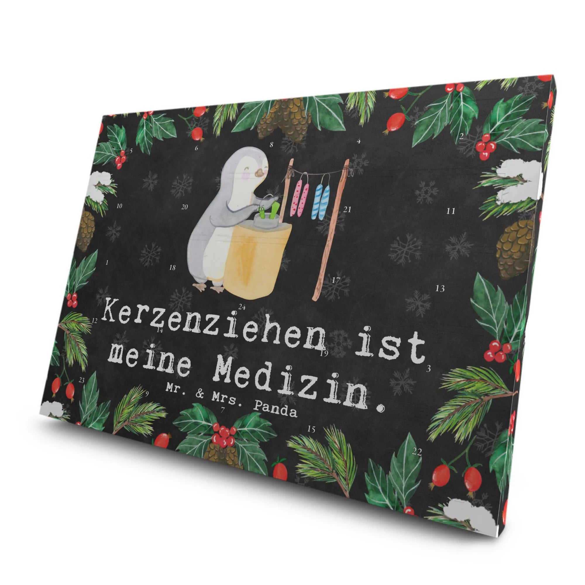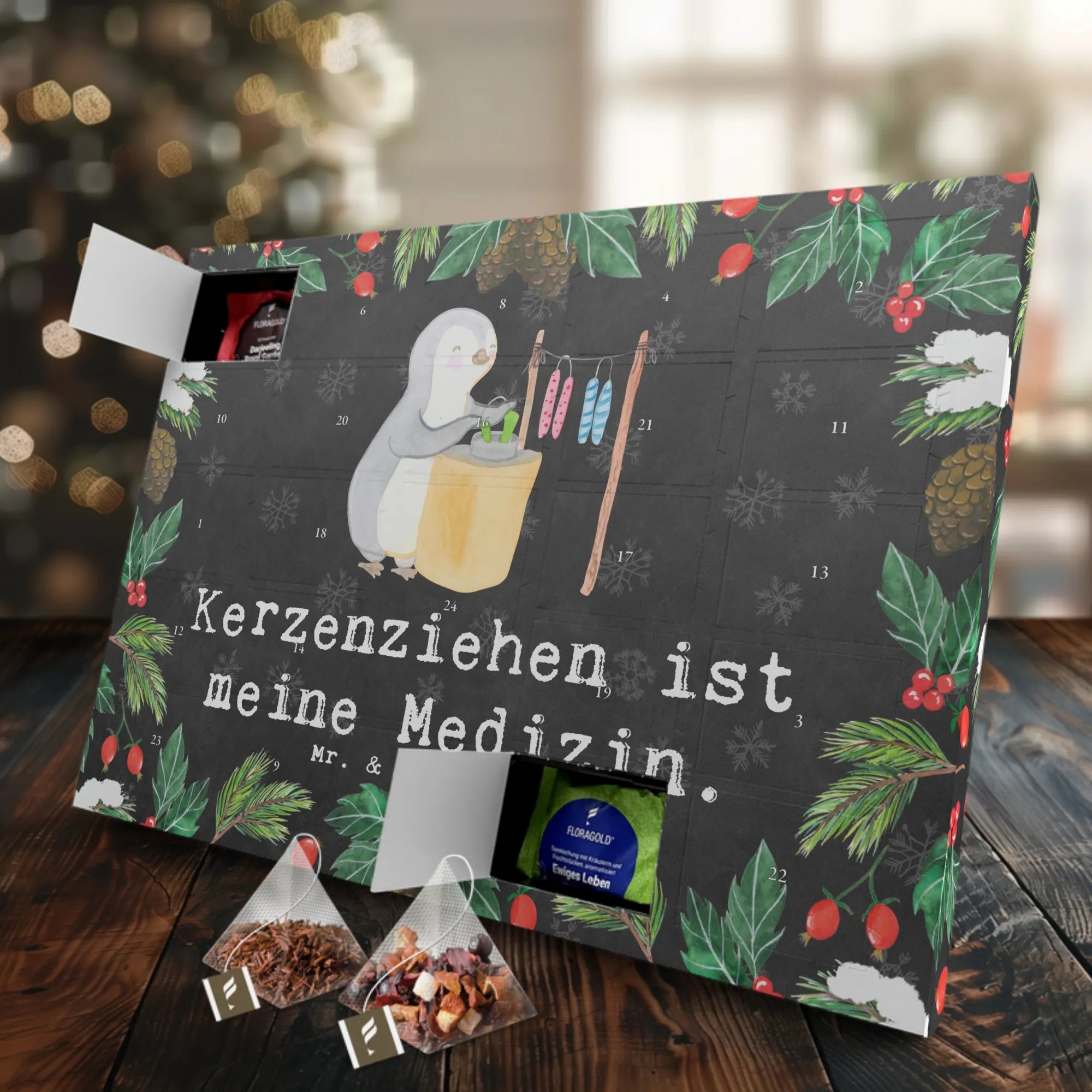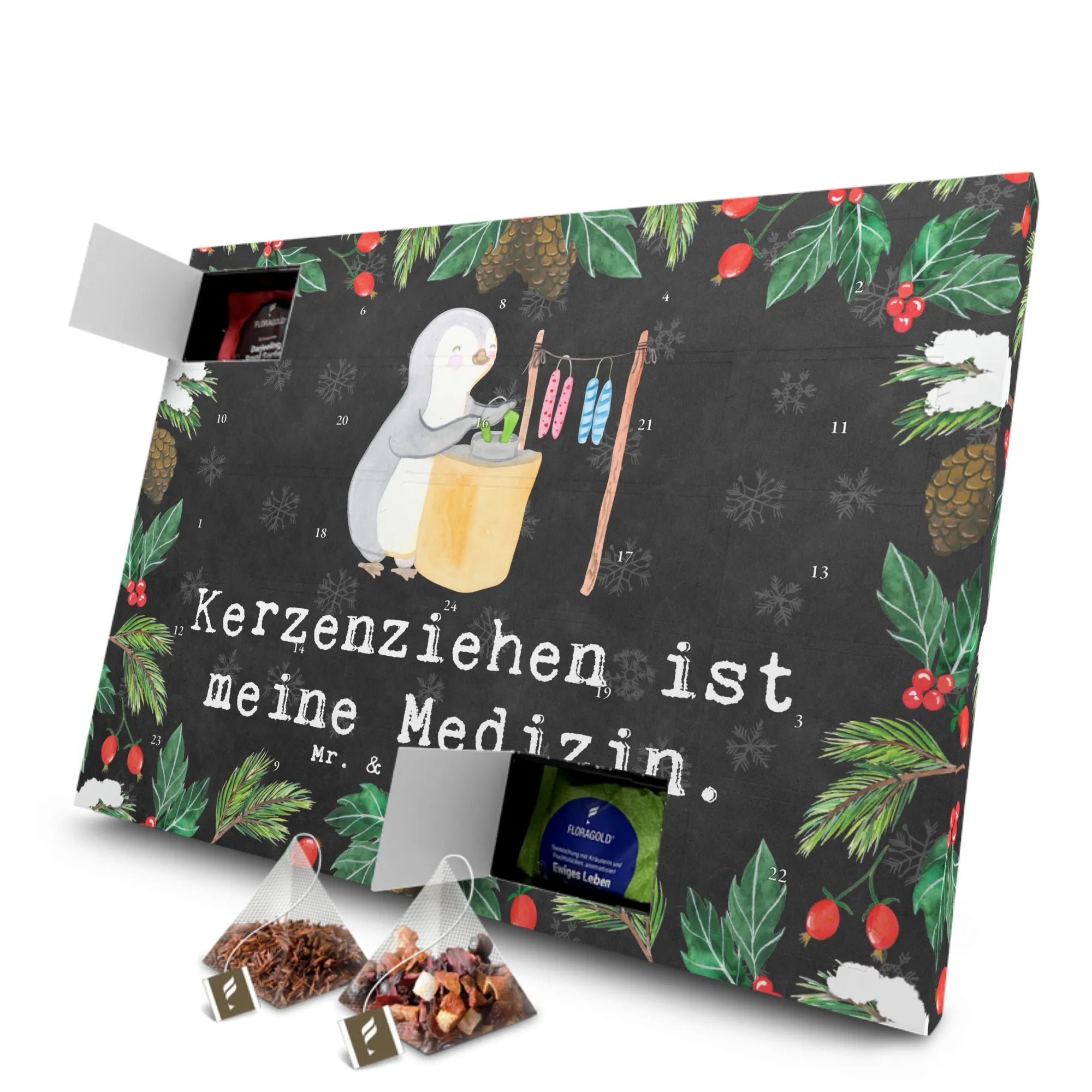 Entdecke unseren einzigartigen Tee Adventskalender mit dem süßen Motiv "Pinguin Kerzenziehen Medizin" von Mr. & Mrs. Panda!