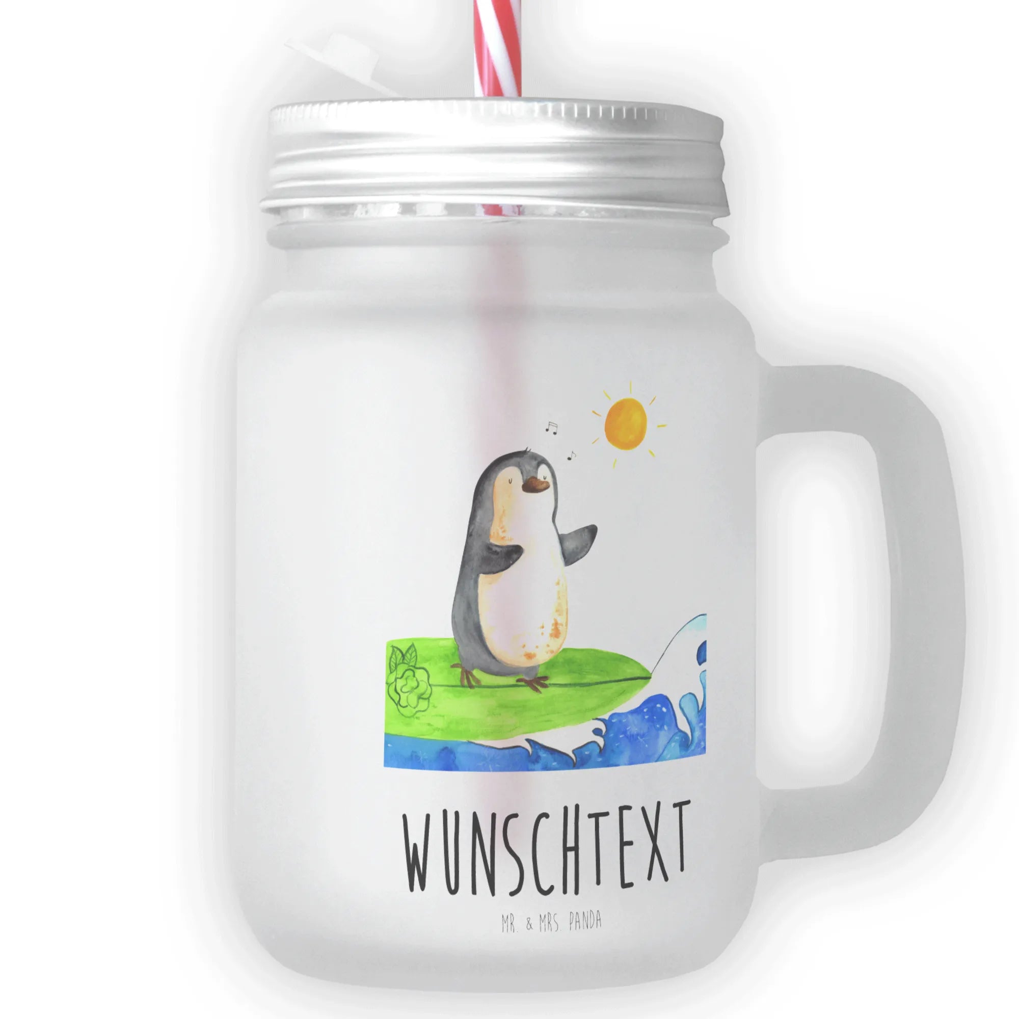 Personalised mason jar drinking glass Penguin surfer